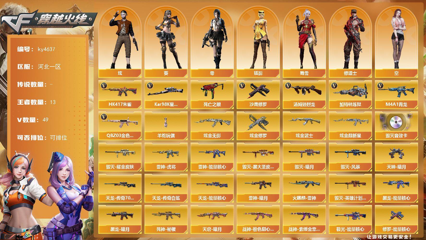 [15284868]河北一区-49V-13王者-4炫金 【热门武器】:QBZ03-金色蔷薇,HK417-朱雀,M4A1-青龙,死亡之眼*2,Kar98K-星神,汤姆逊-烈龙*2,加特林-炼狱*3,羊驼玩偶,沙鹰-修罗*5 【王者炫金武器】:炫金无影,炫金武士,炫金超新星,炫金修罗 【音效卡】:Barrett-毁灭音效卡 【皮肤】:裁决-胜者为王 皮肤,雷神-暗月,雷神-能量核心*3,雷神-虎将,火麒麟-雷神,毁灭-暗月,毁灭耀金皮肤,毁灭-黑大圣皮肤,毁灭-风暴,毁灭-英雄计划 皮肤,黑龙-能量核心,黑龙-暗月*2,死神-秘银*3,天启-暗月*2,战神-粉色甜心皮肤,战神-紫绶金章皮肤,天龙-能量核心,AWM-天龙-传奇70KG,AWM-天龙-传奇白鲨,极光-能量核心*3,修罗-能量核心,天神-暗月*2,擎天-秘银 【角色】:零,葵,炫,狐影,修道士,空,暗夜-X,芳心审判者,虎妞,娟娟,兰-海滩派对,0号玩家,灵狐者-黄金海岸,灵狐者-七夕宝贝,龙儿-小淘气,潘多拉-X,潘多拉-甜心教官,邱刚敖,蜀雪,维纳斯,新娜塔莎,夜玫瑰-宠粉 【人偶武器】:海滩汪汪-巴雷特,COP-旗袍,迷你牛魔王,迷你牛牛*2 【暴走生化】:死亡之眼*2,超级对讲机 【挑战大师】:冰龙粉碎者-白马银枪*2,KAC-圣炎切割者III,阐释者III 【英雄级武器】:AK47-火麒麟,M4A1-黑龙*2,M4A1-雷神*2,M4A1-死神,AK47-黑武士,AK12-天启,M4A1-武圣,M4A1-青龙,HK417-朱雀,黑武士-锦绣游龙,QBZ03-金色蔷薇,王者之心-觉醒版,M4A1-雷霆王者-觉醒版,AWM-天龙,Barrett-毁灭,Barrett-极光,AWM-裁决*2,Kar98K-星神,王者之决-觉醒版,加特林-炼狱*3,汤姆逊-烈龙*2,沙鹰-修罗*5,沙鹰-天神,COP 357-雷霆王者-觉醒版,Glock18-武圣,屠龙*4,擎天,麒麟刺*2,擎天-竞技荣光,高爆手雷-竞技荣光,闪光弹-竞技荣光,闪光弹-雷霆王者-觉醒版,烟雾弹-竞技荣光,烟雾弹-雷霆王者-觉醒版 【道具】:CFS限定背包,云山科技背包,战舰背包,炫彩背包,超级背包,绿色巨人,灵魂忍者,迷雾幽灵,夺命之镰,防化服*3,金色流光-枪王排位,星辰流光-枪王排位,流光-鎏金之域,枪王排位28赛季金色流光,EP战队名片,EP战队击杀