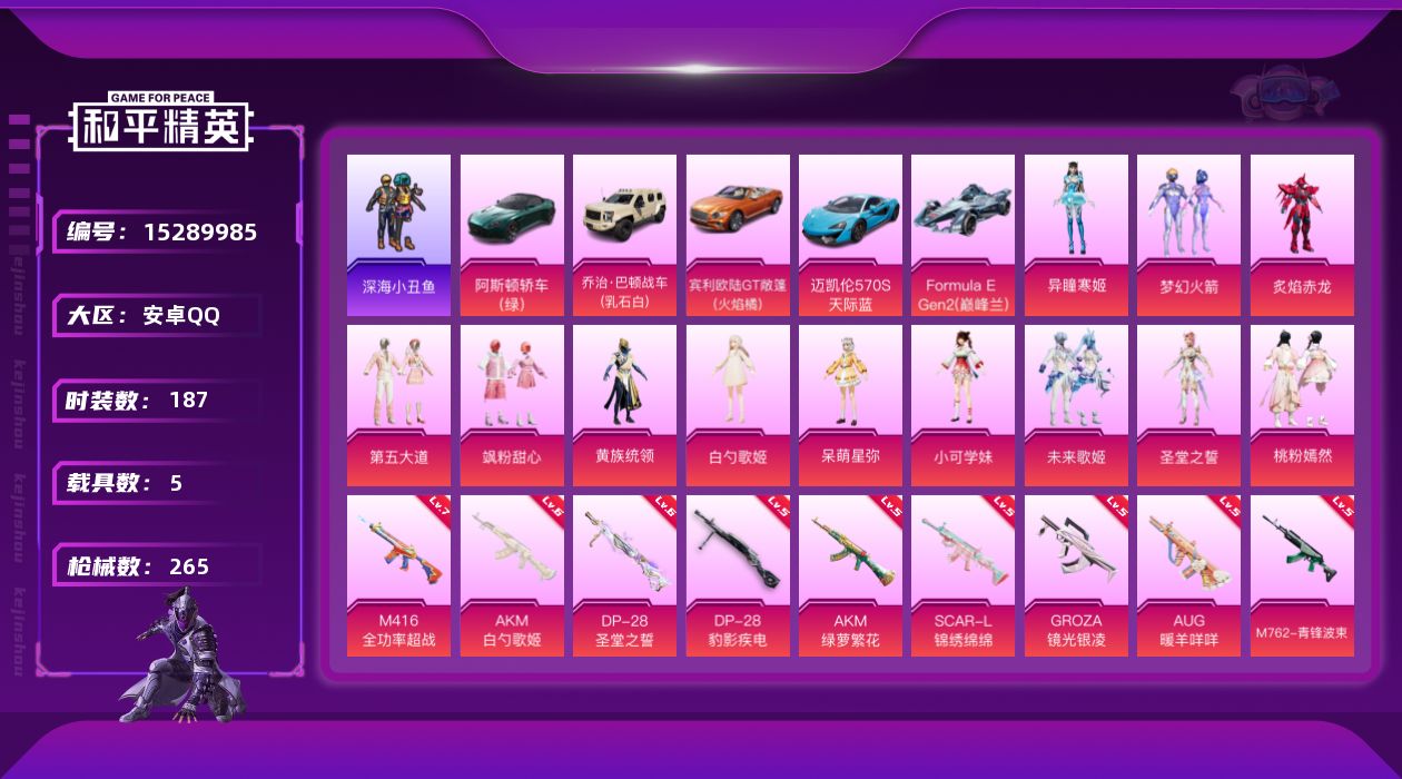 - PX_2106742- 苹果手Q-5王牌印记-13粉装-6特效枪-3载具-56366热力值-128套装-142枪皮-2卓越印记-0传奇印记 【13粉装】,梦幻火箭,缤纷油彩,放客神游,新星烈龙,傲傲奶龙,暖暖奶龙,憨憨奶龙,镜光幻境,蔷薇星,圣堂之誓,馨动时刻,星空之魅,樱桃泡泡 【6特效枪】AKM-梦之光华-4级 SCAR-L-锦绣绵绵-5级 M416-至情至圣-9级 Kar98K-巳巳如意-5