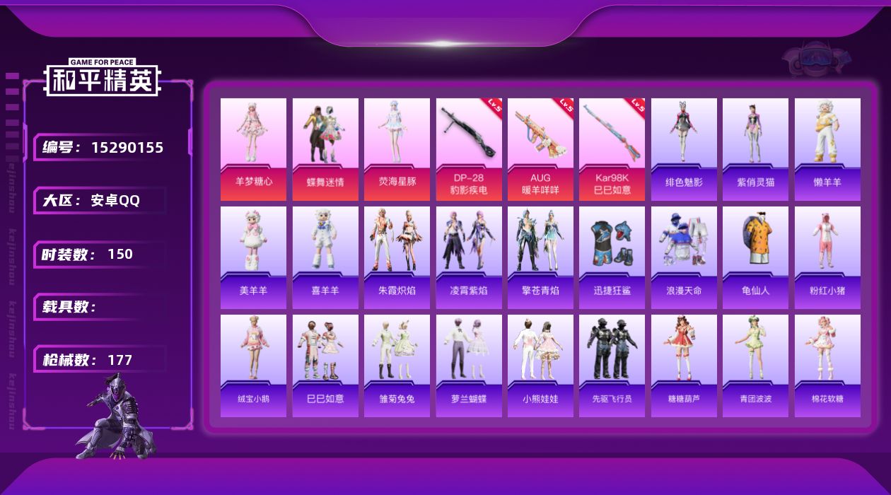 [15290155]【特价出售/店主推荐】地铁满天赋 安卓 手Q-3粉装-3特效枪-0载具-0粉色飞行器-54547热力值-11王牌印记-150套装-177枪皮【热门品类】:套装-浪漫天命,套装-龟仙人,套装-粉红小猪【粉色套装】:粉装-蝶舞迷情,角色-荧海星豚,角色-羊梦糖心【粉色枪皮等级】:AUG-暖羊咩咩(五级),Kar98K-巳巳如意(五级),DP-28-豹影疾电(五级)【粉色枪皮】:AUG-暖羊咩咩,Kar98K-巳巳如意,DP-28-豹影疾电
