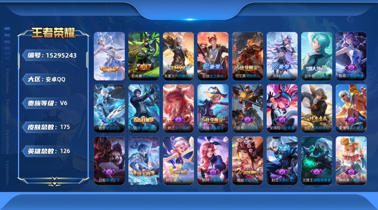 - [13843723]【店主推荐捡漏号!可直接换绑】安卓Q-V8-最强王者段位-126英雄-303皮肤-1典藏-0珍品无双-0无双-2珍品传说-17传说-86史诗 【英雄全皮】:刘禅全皮,孙权全皮,空空儿全皮 【荣耀典藏】:孙悟空全息碎影 【珍品传说】:安琪拉酷洛米之心,宫本武藏黑崎一护 【传说皮肤】:后羿神树通天,蔡文姬愿照福禄聚,桑启鸣野蒿,典韦战鼓燎原,马超琥珀纪元,铠琥珀纪元,孙悟空齐天大圣,百里守约碎云,孙尚香音你闪耀,孙策末日机甲,诸葛亮时雨天司,虞姬启明星使,孙悟空零号赤焰,曜云鹰飞将,李信一念神魔,刘备时之恋人,貂蝉仲夏夜之梦 【限定皮肤】:暃埋骨钱,蔡文姬夏日便利店,虞姬夏日便利店,姜子牙天穹之誓,杨戬破阵退雄兵,李白谪仙醉月,狄仁杰阴阳师,赵云皇家上将,孙尚香蔷薇恋人,钟无艳超时空战士,元歌无心,甄姬落雪兰心,狄仁杰魔术师,达摩沙漠行僧,项羽海滩派对,王昭君午后时光,兰陵王金庭之子,亚瑟潮玩骑士王,孙悟空至尊宝,孙悟空大圣娶亲,孙悟空零号赤焰,孙悟空孙行者,孙悟空齐天大圣,李元芳银河之约,李元芳云中旅人,虞姬启明星使,杨戬潮玩骑兵,鬼谷子五谷丰年,诸葛亮时雨天司,苏烈千军破阵,沈梦溪大漠名商,裴擒虎擒涛扼浪,狂铁电玩高手,云中君纤云弄巧,嫦娥暖冬兔眠,鲁班大师探海日志,桑启海盐诗旅,暃星界游侠,艾琳女武神,艾琳流音漫舞,司空震地狱燃心,阿古朵江河有灵,张良古海寻踪,蒙犽百解令,高渐离燃音魔法,妲己灵卜魔法,鬼谷子天穹祈灯,伽罗琥珀纪元,铠琥珀纪元,马超琥珀纪元,沈梦溪龙舞盛年,鲁班七号蔬乡物语,李元芳蔬乡物语,刘邦剑破天穹,程咬金群星魔术团,镜青焰无极,项羽苍威无极,刘备异域游侠,芈月浮光幕影,周瑜熔金海岸 【年限皮肤】:诸葛亮时雨天司 【赛季限定】:达摩沙漠行僧,兰陵王金庭之子,张良古海寻踪,李元芳云中旅人,苏烈千军破阵,沈梦溪大漠名商,裴擒虎擒涛扼浪,鲁班大师探海日志,桑启海盐诗旅,鬼谷子天穹祈灯,刘邦剑破天穹,姜子牙天穹之誓 【战令限定】:蔡文姬夏日便利店,虞姬夏日便利店,钟无艳超时空战士,甄姬落雪兰心,王昭君午后时光,艾琳流音漫舞,亚瑟潮玩骑士王,李元芳银河之约,杨戬潮玩骑兵,狂铁电玩高手,嫦娥暖冬兔眠,司空震地狱燃心,暃星界游侠,高渐离燃音魔法,妲己灵卜魔法,鲁班七号蔬乡物语,李元芳蔬乡物语,镜青焰无极,项羽苍威无极 【史诗皮肤】:鲁班七号电玩小子,项羽苍