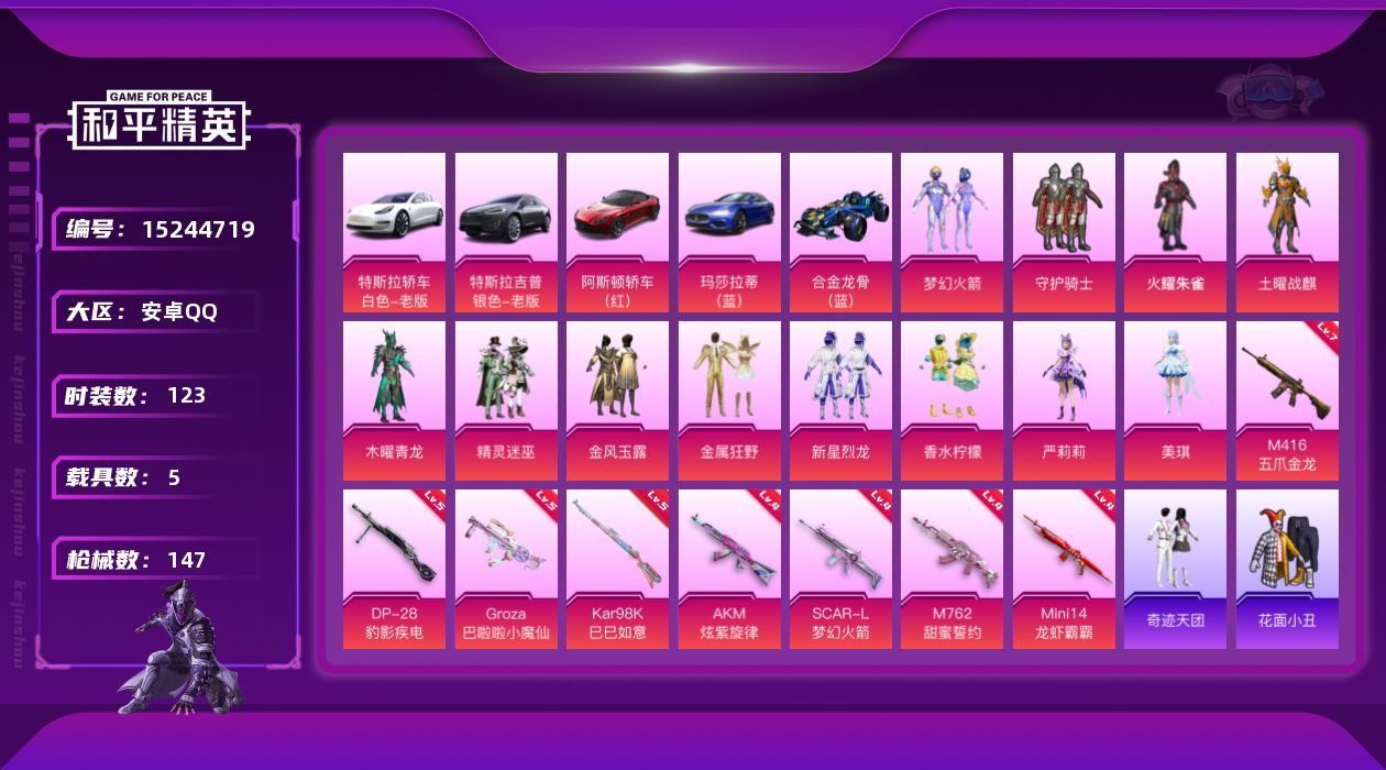[15244719]素材身法号【特价急出/详情看图】:安卓 手Q-12粉装-8特效枪-5载具-2粉色飞行器-6w热力值-4王牌印记-123套装-147枪皮【热门品类】:粉装-梦幻火箭,套装-小丑鱼,小丑红鼻头,小恶魔头饰【粉色载具】:特斯拉Model 3(珍珠白),特斯拉Model X(冷光银),阿斯顿马丁DBS(红),玛莎拉蒂Ghibli(蓝),合金龙骨(蓝)【粉色套装】:粉装-守护骑士,粉装-火曜朱雀,粉装-土曜战麒,粉装-木曜青龙,粉装-精灵迷巫,粉装-梦幻火箭,粉装-金风玉露,粉装-金属狂野,粉装-新星烈龙,粉装-香水柠檬,角色-严莉莉,角色-美琪【粉色枪皮等级】:AKM-炫紫旋律(四级),SCAR-L-梦幻火箭(四级),M416-五爪金龙(七级),GROZA-巴啦啦小魔仙(五级),M762-甜蜜誓约(四级),Kar98K-巳巳如意(五级),Mini14-龙虾霸霸(四级),DP-28-豹影疾电(五级)【粉色飞行器】:梦幻火箭飞行器