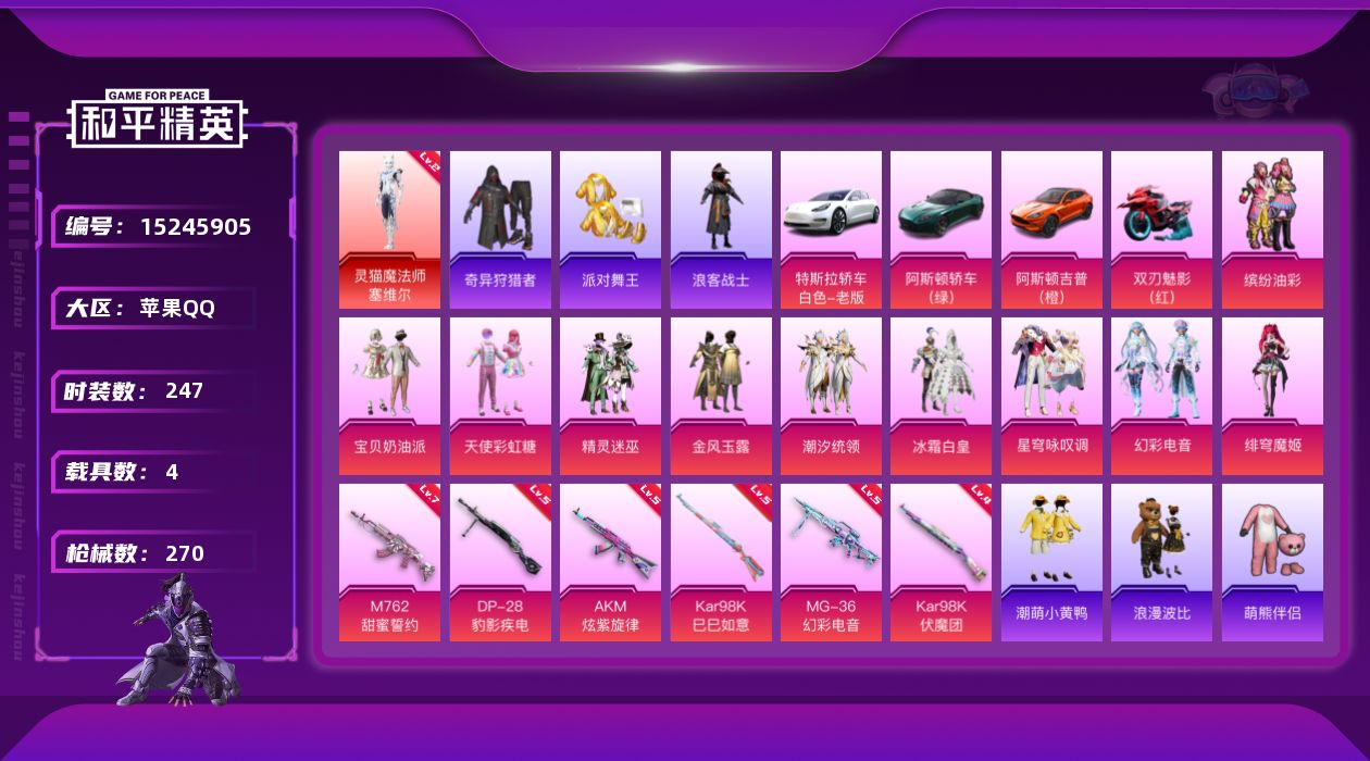 [15245905]素材身法号【特价急出/详情看图】:苹果 手Q-1神装-10粉装-6特效枪-4载具-4粉色飞行器-9.4w热力值-13王牌印记-247套装-270枪皮【红色神装等级】:灵猫魔法师-塞维尔(二级)【热门品类】:粉装-缤纷油彩,套装-派对舞王,套装-奇异狩猎者,套装-忍者信条,套装-浪客战士,套装-AG战队服,套装-龟仙人,套装-潮萌小黄鸭,套装-暗影哥特,套装-浪漫波比,套装-粉红小猪,套装-萌熊伴侣,小恶魔头饰,熔岩游骑兵面罩,M416-星际漫游,熔岩游骑兵连帽夹克【粉色载具】:特斯拉Model 3(珍珠白),阿斯顿马丁DBS(绿),阿斯顿马丁DBX(橙),双人摩托-双刃魅影(红)【粉色套装】:粉装-宝贝奶油派,粉装-天使彩虹糖,粉装-精灵迷巫,粉装-金风玉露,粉装-缤纷油彩,粉装-潮汐统领,粉装-冰霜白皇,粉装-星穹咏叹调,粉装-幻彩电音,角色-绯穹魔姬【粉色枪皮等级】:AKM-炫紫旋律(五级),M762-甜蜜誓约(七级),Kar98K-伏魔团(四级),Kar98K-巳巳如意(五级),DP-28-豹影疾电(五级),MG-36-幻彩电音(五级)【粉色飞行器】:精灵迷巫飞行器,炫紫旋律飞行器,古堡领主飞行器,荧光虫舞飞行器