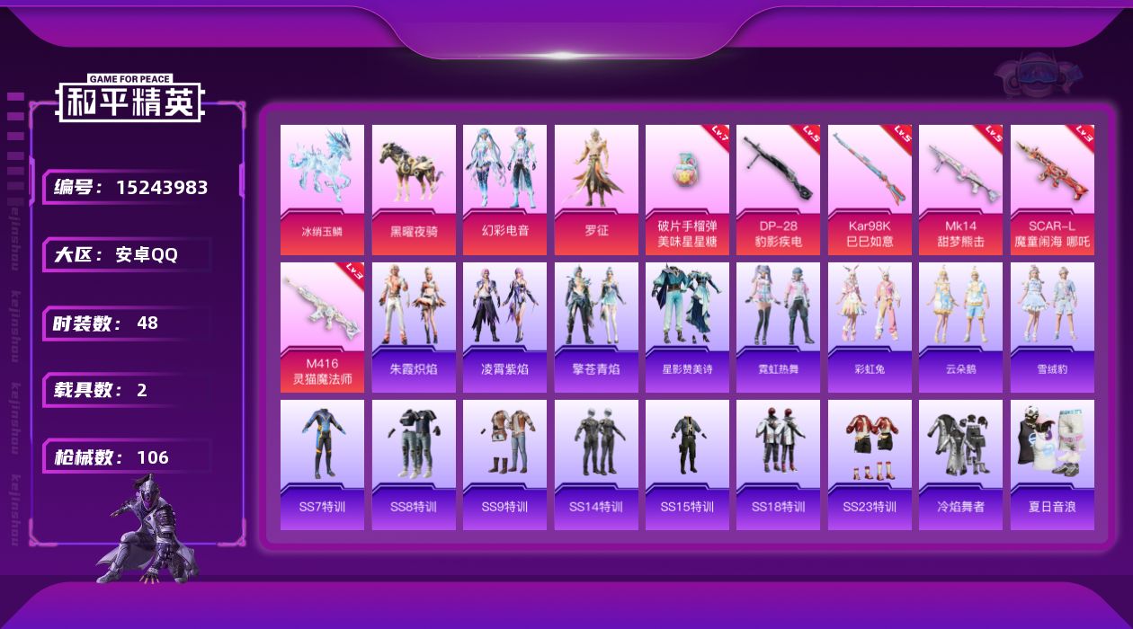 - PX_2077894- 安卓手Q-28王牌印记-15粉装-10特效枪-0载具-120628热力值-289套装-391枪皮-5卓越印记-0传奇印记 【15粉装】,梦幻火箭,宝贝奶油派,蝶舞迷情,洛天依,星穹咏叹调,千金淑猫,暗夜玫瑰,古堡领主,冰川幽秘,冰川红玫,银刃赛罗,冰霜白皇,暗夜鎏金,快乐主宰,呆萌星弥 【10特效枪】AKM-炫紫旋律-7级 SCAR-L-机甲封神-7级 M416-五爪金龙-