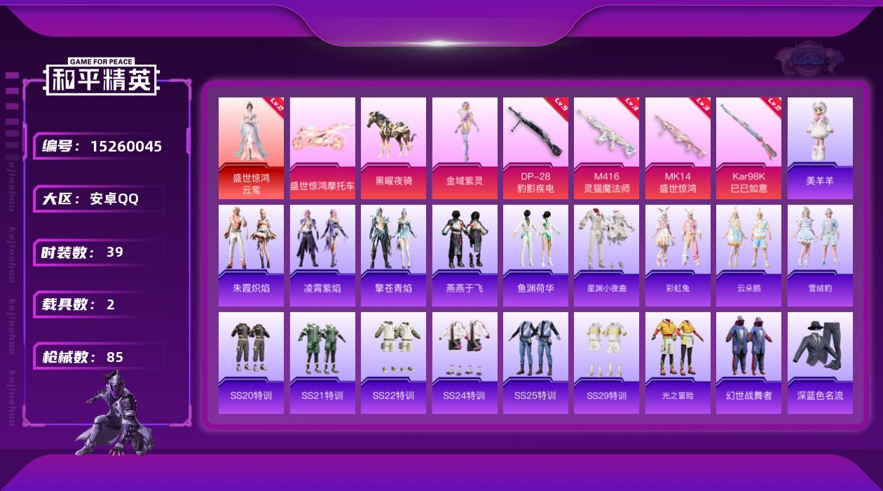 - [12897582]安卓 手Q-12粉装-3特效枪-4载具-2粉色飞行器-53144热力值-1王牌印记-118套装-151枪皮 【热门品类】:套装-小丑鱼,套装-奇异狩猎者,套装-龟仙人,套装-粉红小猪 【粉色载具】:乔治巴顿战车(鎏金黑),迈凯伦570S(天际蓝),擎天重拳,俏皮小熊猫 【粉色套装】:粉装-数码大师,粉装-垂柳戏鸭,粉装-光明术士,粉装-青空秋雨,粉装-暗夜鎏金,角色-白勺歌姬,角色-呆萌星弥,角色-小可学妹,粉装-天星战神,粉装-炎氏战神,角色-幻影,角色-猩猩队长 【粉色枪皮等级】:UMP45-恐龙拽拽(四级),野牛-青空秋雨(五级),Kar98K-巳巳如意(五级) 【粉色枪皮】:UMP45-恐龙拽拽,野牛-青空秋雨,Kar98K-巳巳如意 【粉色飞行器】:白勺歌姬飞行器 【粉色降落伞】:快乐主宰降落伞,百万伏特降落伞,梦幻火箭降落伞,神秘黑猫降落伞,星之彼岸降落伞,恐龙拽拽降落伞,环太平洋降落伞,垂柳戏鸭降落伞,青空秋雨降落伞,纯梦嫁纱降落伞,梦幻舞会降落伞,飒粉甜心降落伞,黄族统领降落伞,白勺歌姬降落伞,天星战神降落伞,炎氏战神降落伞,未来歌姬降落伞,变形金刚降落伞,时空协奏降落伞 【稀有套装】:套装-龟仙人,套装-巳巳如意,套装-糖糖葫芦,套装-青团波波,套装-棉花软糖,角色-海琴烟 【稀有枪皮】:AKM-夜灯,AKM-奇异狩猎者,AKM-恐龙拽拽,AKM-春暖花开,AKM-灼热熔岩,AKM-破晓战魂,AKM-缤纷海域,M16A4-幻世战舞者,M16A4-快乐主宰,M16A4-甜心亚梦,M16A4-蓝色火焰,SCAR-L-夜灯,SCAR-L-未来战士,SCAR-L-炫彩节奏,SCAR-L-玉兔迎春,SCAR-L-红色方程式,M416-彩虹嘻嘻猴,M416-红色方程式,M416-绯红前夜,M416-蓝色火焰,GROZA-彩虹符号,GROZA-影袭,GROZA-恐龙拽拽,GROZA-懵萌河马,GROZA-田园牧歌,AUG-耀粉歌者,QBZ-未来歌姬,M762-奇异狩猎者,M762-绯红前夜,Mk47-百万伏特,G36C-懵萌河马,AC-VAL-天降萌叽,AC-VAL-甜心亚梦,蜜獾-天降萌叽,蜜獾-娇憨猪猪,UZI-天降萌叽,UZI-娇憨猪猪,UMP45-涂山之恋,UMP45-生命誓言,UMP45-蓝色火焰,Vector-炎氏战神,Vector-田园牧歌,Ve