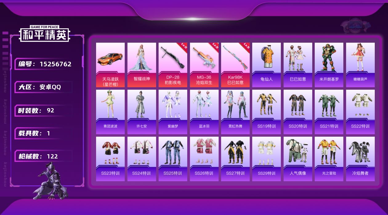 [15256762]安卓 手Q-1粉装-3特效枪-1载具-3.2w热力值-7王牌印记-92套装-122枪皮【热门品类】:套装-龟仙人【粉色载具】:天马凌跃(星芒橙)【粉色套装】:角色-智耀战神【粉色枪皮等级】:Kar98K-巳巳如意(五级),DP-28-豹影疾电(五级),MG-36-沧焰双生(五级)
