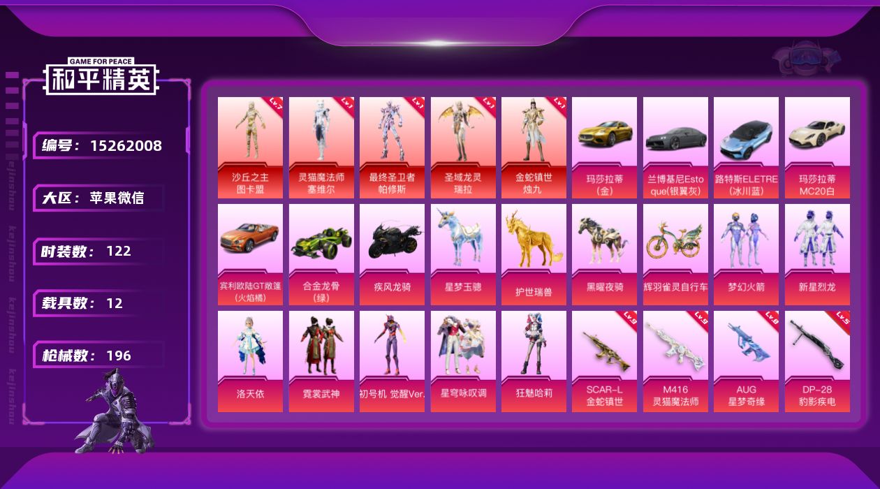 [15262008]素材身法号/沙丘之主-图卡盟(七级)/璀璨碎片1518/SCAR-L-金蛇镇世(九级)/M416-灵猫魔法师(九级) 苹果 微信-5神装-7粉装-18特效枪-12载具-11粉色飞行器-11.2w热力值-12王牌印记-122套装-196枪皮【红色神装等级】:灵猫魔法师-塞维尔(一级),最终圣卫者-帕修斯(一级),圣域龙灵-瑞拉(一级),金蛇镇世-烛九(一级),沙丘之主-图卡盟(七级)【热门品类】:粉装-梦幻火箭,角色-军刀雅典娜,套装-龟仙人,角色-8号机,角色-Mark.06【粉色载具】:兰博基尼Estoque(银翼灰),路特斯ELETRE(冰川蓝),玛莎拉蒂MC20(星石白),玛莎拉蒂Ghibli(金),宾利欧陆GT敞篷(火焰橘),合金龙骨(绿),疾风龙骑,僚机-圣域龙宝,星梦玉骢,护世瑞兽,黑曜夜骑,辉羽雀灵自行车【粉色套装】:粉装-梦幻火箭,粉装-新星烈龙,角色-洛天依,粉装-霓裳武神,角色-初号机 觉醒Ver.,粉装-星穹咏叹调,角色-狂魅哈莉【粉色枪皮等级】:AKM-梦之光华(五级),SCAR-L-纯梦嫁纱(一级),SCAR-L-金蛇镇世(九级),M416-五爪金龙(一级),M416-墨龙九天(一级),M416-灵猫魔法师(九级),AUG-星梦奇缘(八级),Vector-最终圣卫者(二级),P90-沙丘之主(一级),Kar98K-巳巳如意(五级),Kar98K-圣域龙灵(一级),Mk14-盛世惊鸿(一级),DP-28-千金淑猫(一级),DP-28-豹影疾电(五级),MG3-洛神天依(一级),MG3-辉羽雀灵(二级),MG-36-幻彩电音(一级)【粉色飞行器】:纯梦嫁纱飞行翼,沙丘之主天马,繁龙极客飞行器,镜域双华-灵镜之阶,龙翔九天飞行器,凤舞九天飞行器,万象金身飞行器,圣域金龙飞行器,雀灵庇佑飞行器,灵猫魔法师飞行器