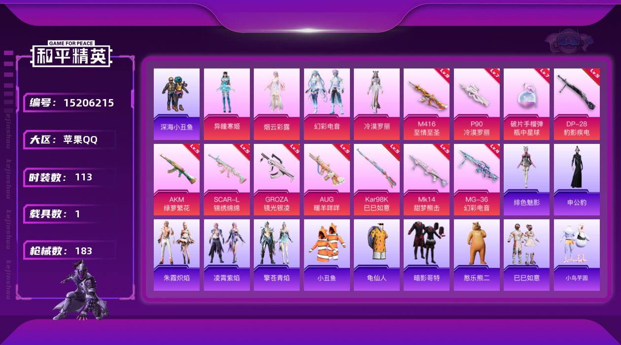 - PX_2107713-苹果QQ 历史总热力值:65917 粉装数量:12 特效枪数量:9 载具数量:2 王牌印记:10 历史最高段位:超级王牌12星 套装数量:137 时装数量:496 枪械数量:209 战备数量:131 装备数量:248 载具:护世瑞兽,晶梦灵驹 时装:套装-冰霜白皇,套装-天使彩虹糖,套装-宝贝奶油派,套装-射星猎手,套装-极限特训,套装-第五大道,套装-鎏金朋克,角色-呆萌星