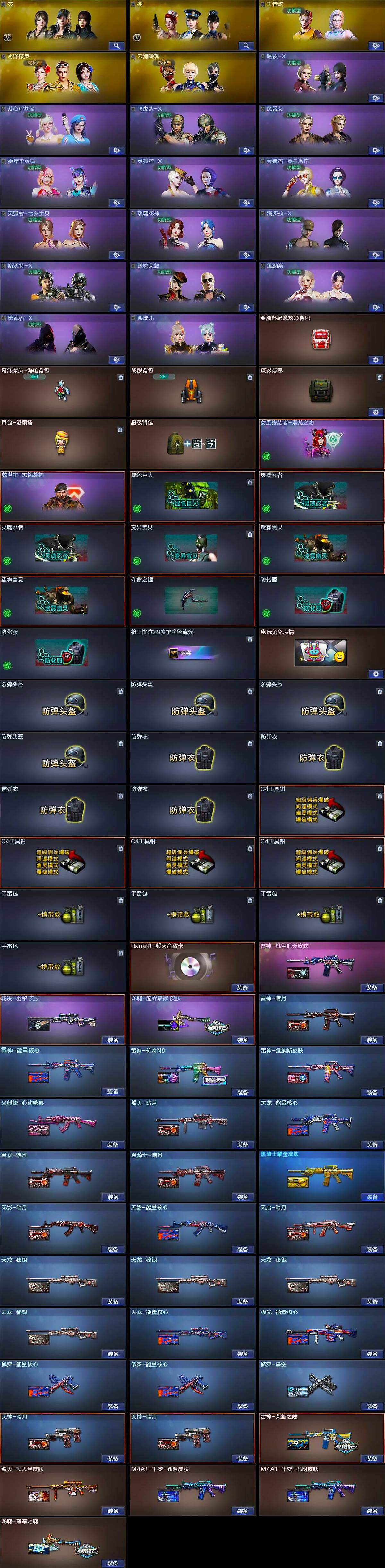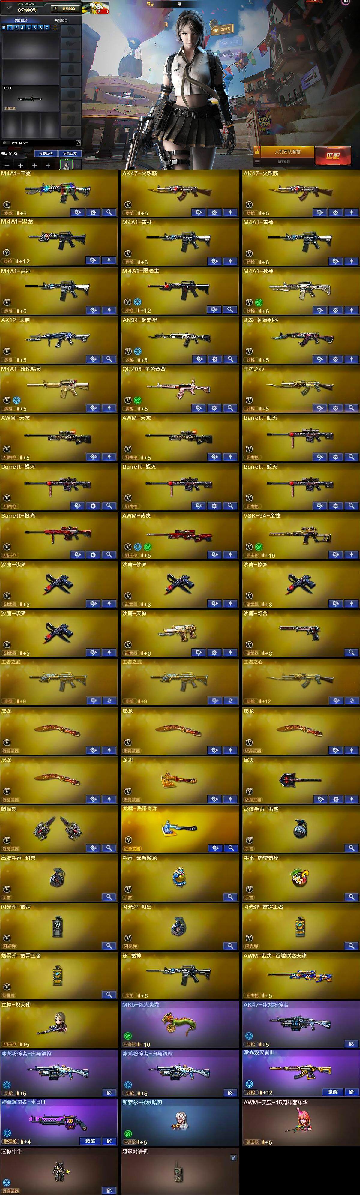 【英雄级武器】:M4A1-千变,AK47-火麒麟*2,M4A1-黑龙,M4A1-雷神*3,M4A1-黑骑士,M4A1-死神,AK12-天启,AN94-超新星,无影-神兵利器,M4A1-玫瑰精灵,QBZ03-金色蔷薇,王者之心-觉醒版,AWM-天龙*2,Barrett-毁灭*4,Barrett-极光,AWM-裁决,VSK-94-金蚀,沙鹰-修罗*4,沙鹰-天神,沙鹰-幻兽,屠龙*4,龙啸,擎天,麒麟刺,龙啸-热带奇洋,高爆手雷-雷霆,高爆手雷-幻兽,手雷-云海游龙,手雷-热带奇洋,闪光弹-雷霆,闪光弹-幻兽,闪光弹-雷霆王者-觉醒版,烟雾弹-雷霆王者-觉醒版