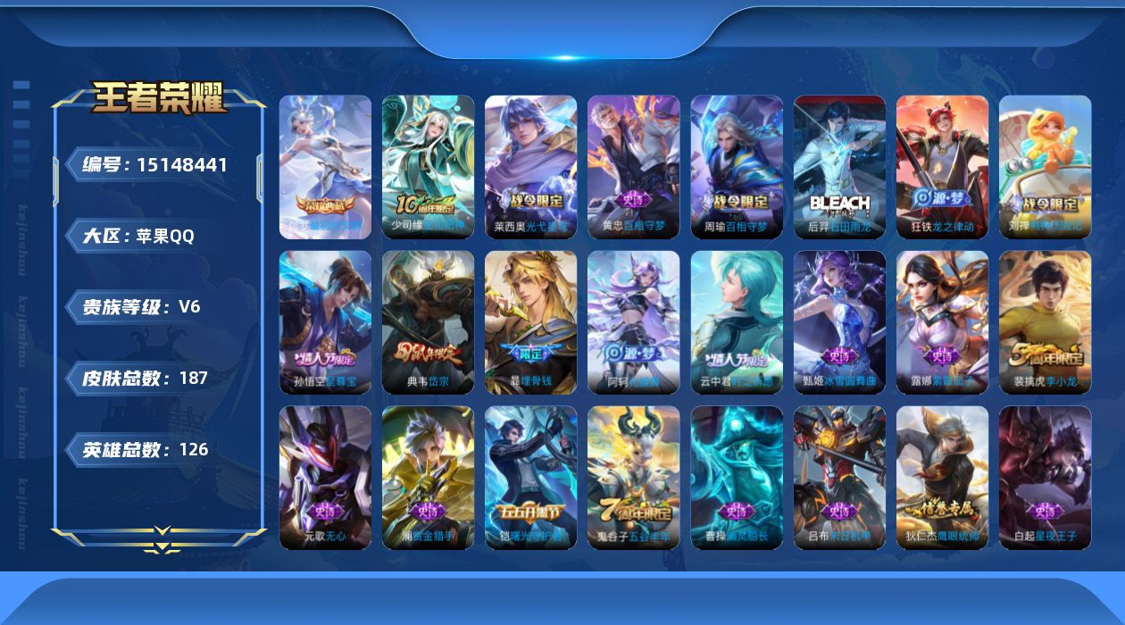 [15148441]【特价急出/详情看图】苹果Q-V6-最强王者段位-126英雄-187皮肤-1典藏皮肤-1传说-49史诗