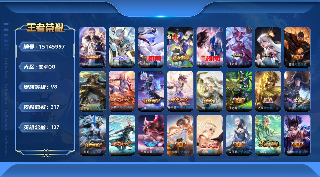 - [12289786]实名: 可修改 贵族等级: V10 英雄数: 125 皮肤数: 466 荣耀水晶: 鸣剑·曳影,全息碎影,九霄神辉 无双皮: 碎月剑心,韩信群星魔术团 珍品传说: 兔狲·蓬尾,酷洛米之心,大耳狗之梦,朽木白哉,黑崎一护 传说皮: 黄金狮子座,黄金射手座,绛天战甲,末日机甲-孙尚香,地狱火,仲夏夜之梦,零号·赤焰,时之恋人-刘备,淬星耀世,遇见胡旋,末日机甲-孙策,挚爱之约,挚爱花嫁,无双飞将,碎云,画中仙,妄想实况,艾琳觅芳踪,乘龙·问璇玑,落雪白狼,幻光神枪,祥瑞亨通,星之鸣奏,续相思,诡秘之主 限定皮: 冰锋战神,遇见飞天,李小龙,祈雪灵祝,游园惊梦,梁祝,时雨天司,引擎之心,魔法小厨娘,辉光之辰,异界灵契,天魔缭乱,神威,飞衡,天狼狩猎者,冰霜恋舞曲,逐梦之影,逐梦之光,神奇女侠,美猴王,白虎志,梅西,至尊宝,一生所爱,武陵仙君,如梦令-后羿,大圣娶亲,默契交锋-花木兰,霸王别姬-虞姬,高山流水,孙行者,猪悟能,寅虎·展翼,补天,百木心枪,玉兔公主,启示之音,匿光决锋者,无尽星芒,五谷丰年,神器·万象笔,山海·碧波行,齐天大圣,至美·化雀舞,至美·乘鲤谣,鸣野蒿,陌上桑,愿照·千秋盛,愿照·众生和,愿照·山河定,愿照·岁时盈,愿照·福禄聚,愿照·九州拓