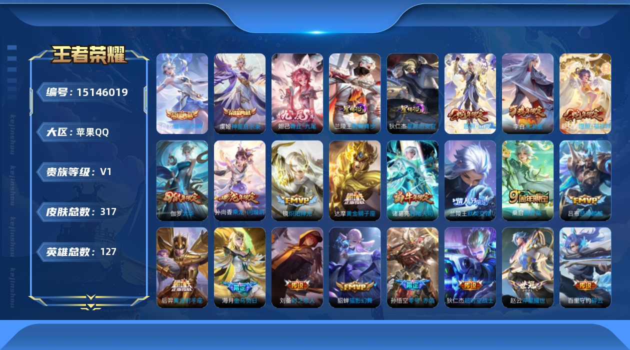 [15146019]可二次【店主推荐捡漏号!可直接换绑】苹果Q-V1-至尊星耀III段位-127英雄-317皮肤-2典藏皮肤-1无双-3星传说-24传说-84史诗