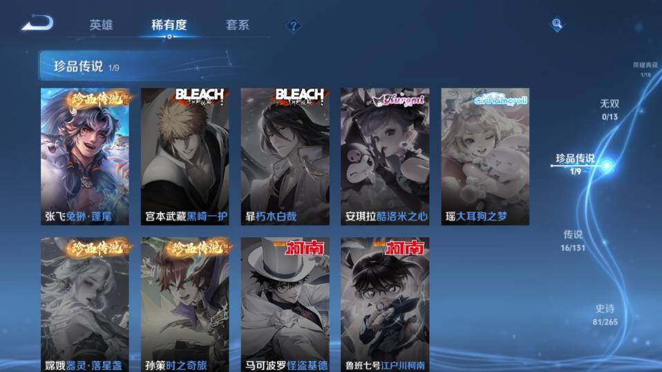 【传说皮肤】:杨戬纵目迁山,后羿神树通天,司空震愿照山河定,云缨幻光神枪,桑启鸣野蒿,亚连落雪白狼,吕布曦玄引,露娜霜月吟,云缨鹤归松栖,夏洛特浮生妄,花木兰燃星之曲,吕布怒海麟威,铠绛天战甲,后羿黄金射手座,宫本武藏地狱之眼,吕布天魔缭乱