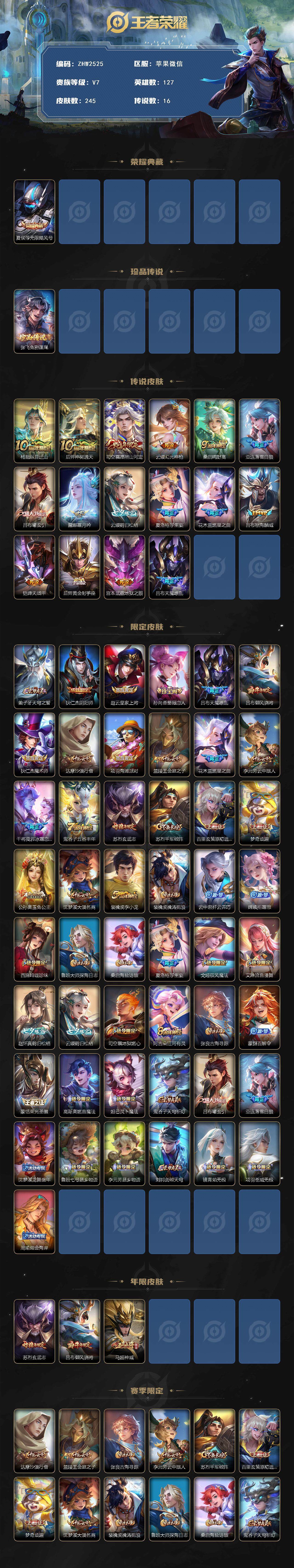 [15156566]苹果WX-V7-最强王者段位-127英雄-245皮肤-1典藏皮肤-1珍品传说-16传说-81史诗