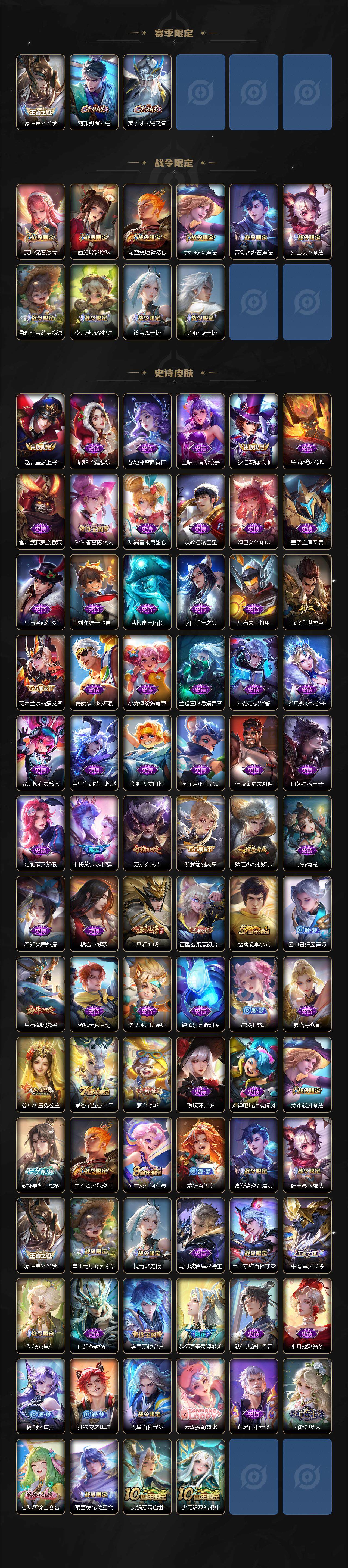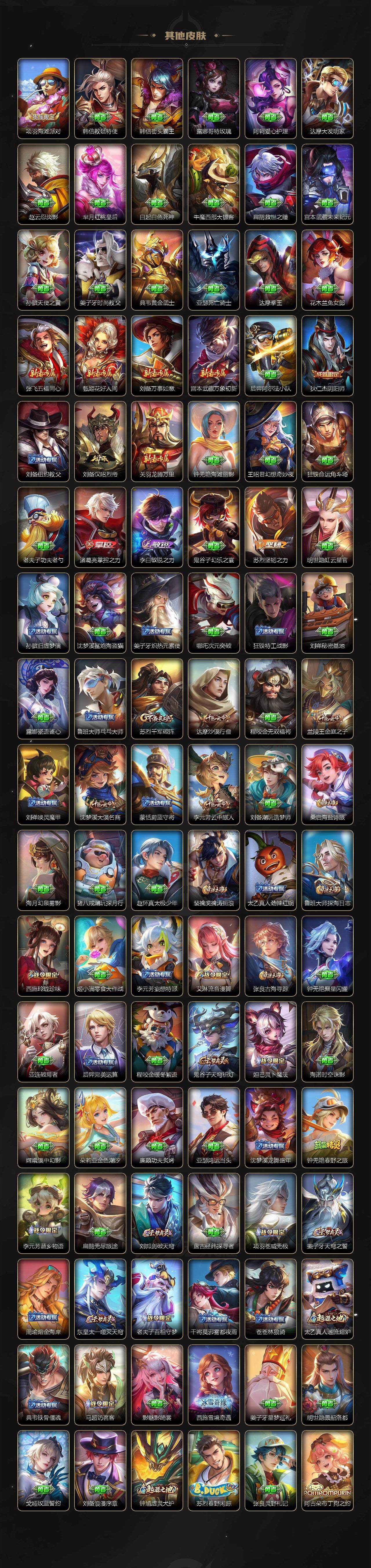 【限定皮肤】:姜子牙天穹之誓,狄仁杰阴阳师,赵云皇家上将,孙尚香蔷薇恋人,吕布天魔缭乱,吕布御风骁将,狄仁杰魔术师,达摩沙漠行僧,项羽海滩派对,兰陵王金庭之子,花木兰燃星之曲,李元芳云中旅人,干将莫邪冰霜恋舞曲,鬼谷子五谷丰年,苏烈玄武志,苏烈千军破阵,百里玄策原初追逐者,梦奇顽趣,公孙离玉兔公主,沈梦溪大漠名商,裴擒虎李小龙,裴擒虎擒涛扼浪,云中君纤云弄巧,嫦娥拒霜思,西施玲珑珍味,鲁班大师探海日志,桑启海盐诗旅,夏洛特浮生妄,戈娅驭风魔法,艾琳流音漫舞,赵怀真鹤归松栖,云缨鹤归松栖,司空震地狱燃心,阿古朵江河有灵,张良古海寻踪,蒙犽百解令,蒙恬荣光圣徽,高渐离燃音魔法,妲己灵卜魔法,鬼谷子天穹祈灯,吕布曦玄引,亚连落雪白狼,沈梦溪龙舞盛年,鲁班七号蔬乡物语,李元芳蔬乡物语,刘邦剑破天穹,镜青焰无极,项羽苍威无极,周瑜熔金海岸