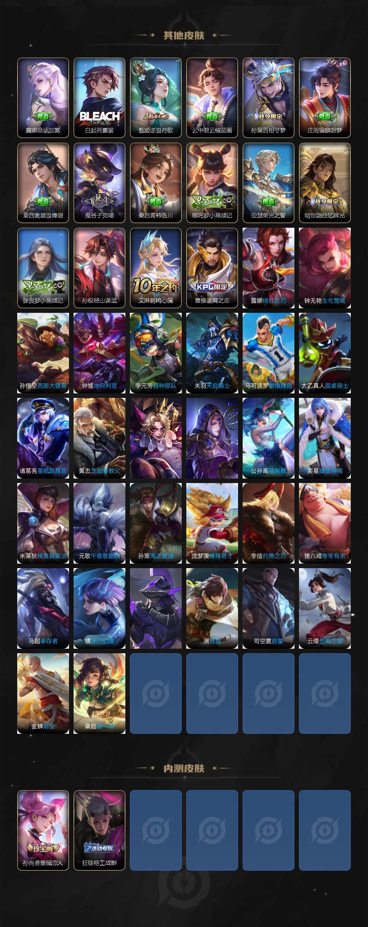 小乔青蛇,伽罗箭羽风息,李元芳逐浪之夏,不知火舞魅语,阿轲节奏热浪,王昭君偶像歌手,雅典娜冰冠公主,吕布末日机甲,橘右京修罗,嬴政摇滚巨星,刘禅绅士熊喵,刘禅天才门将,白起星夜王子,安琪拉心灵骇客,程咬金功夫厨神,兰陵王暗隐猎兽者,曹操幽灵船长,宫本武藏鬼剑武藏,亚瑟心灵战警,钟馗乐园奇幻夜,杨戬天秀·启明,廉颇地狱岩魂,小乔缤纷独角兽,夏侯惇乘风破浪,花木兰水晶猎龙者,墨子金属风暴,百里玄策原初追逐者,吕布圣诞狂欢,貂蝉圣诞恋歌,百里守约特工魅影,嫦娥拒霜思,李白千年之狐,夏洛特永昼,镜玫瑰异探,刘禅电玩·爆裂旋风,赵怀真鹤归松栖,蒙犽百解令,高渐离燃音魔法,白起苍鳞隐世,赵怀真器灵·浮梦炉,狄仁杰绮世丹青