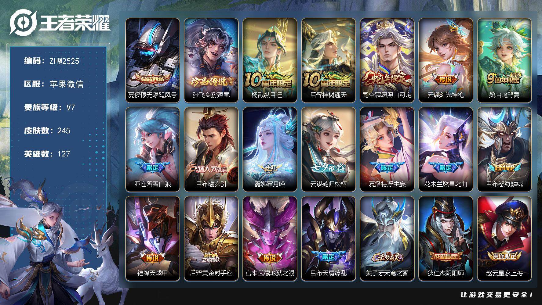 [15156566]苹果WX-V7-最强王者段位-127英雄-245皮肤-1典藏皮肤-1珍品传说-16传说-81史诗 【英雄全皮】:孙权全皮,夏洛特全皮,司空震全皮,云缨全皮,赵怀真全皮,影全皮 【荣耀典藏】:夏侯惇无限飓风号 【珍品传说】:张飞兔狲蓬尾 【传说皮肤】:杨戬纵目迁山,后羿神树通天,司空震愿照山河定,云缨幻光神枪,桑启鸣野蒿,亚连落雪白狼,吕布曦玄引,露娜霜月吟,云缨鹤归松栖,夏洛特浮生妄,花木兰燃星之曲,吕布怒海麟威,铠绛天战甲,后羿黄金射手座,宫本武藏地狱之眼,吕布天魔缭乱 【限定皮肤】:姜子牙天穹之誓,狄仁杰阴阳师,赵云皇家上将,孙尚香蔷薇恋人,吕布天魔缭乱,吕布御风骁将,狄仁杰魔术师,达摩沙漠行僧,项羽海滩派对,兰陵王金庭之子,花木兰燃星之曲,李元芳云中旅人,干将莫邪冰霜恋舞曲,鬼谷子五谷丰年,苏烈玄武志,苏烈千军破阵,百里玄策原初追逐者,梦奇顽趣,公孙离玉兔公主,沈梦溪大漠名商,裴擒虎李小龙,裴擒虎擒涛扼浪,云中君纤云弄巧,嫦娥拒霜思,西施玲珑珍味,鲁班大师探海日志,桑启海盐诗旅,夏洛特浮生妄,戈娅驭风魔法,艾琳流音漫舞,赵怀真鹤归松栖,云缨鹤归松栖,司空震地狱燃心,阿古朵江河有灵,张良古海寻踪,蒙犽百解令,蒙恬荣光圣徽,高渐离燃音魔法,妲己灵卜魔法,鬼谷子天穹祈灯,吕布曦玄引,亚连落雪白狼,沈梦溪龙舞盛年,鲁班七号蔬乡物语,李元芳蔬乡物语,刘邦剑破天穹,镜青焰无极,项羽苍威无极,周瑜熔金海岸 【年限皮肤】:苏烈玄武志,吕布御风骁将,马超神威 【赛季限定】:达摩沙漠行僧,兰陵王金庭之子,张良古海寻踪,李元芳云中旅人,苏烈千军破阵,百里玄策原初追逐者,梦奇顽趣,沈梦溪大漠名商,裴擒虎擒涛扼浪,鲁班大师探海日志,桑启海盐诗旅,鬼谷子天穹祈灯,蒙恬荣光圣徽,刘邦剑破天穹,姜子牙天穹之誓 【战令限定】:艾琳流音漫舞,西施玲珑珍味,司空震地狱燃心,戈娅驭风魔法,高渐离燃音魔法,妲己灵卜魔法,鲁班七号蔬乡物语,李元芳蔬乡物语,镜青焰无极,项羽苍威无极 【史诗皮肤】:赵云皇家上将,貂蝉圣诞恋歌,甄姬冰雪圆舞曲,王昭君偶像歌手,狄仁杰魔术师,廉颇地狱岩魂,宫本武藏鬼剑武藏,孙尚香蔷薇恋人,孙尚香水果甜心,嬴政摇滚巨星,妲己女仆咖啡,墨子金属风暴,吕布圣诞狂欢,刘禅绅士熊喵,曹操幽灵船长,李白千年之狐,吕布末日机甲,张飞乱世虎臣,花木兰水晶猎龙者,夏侯惇乘风破浪,小乔缤纷独角兽