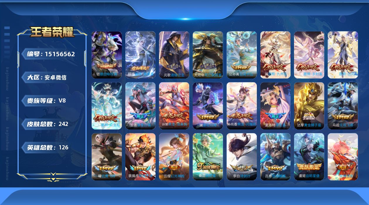 [15156562]安卓WX-V8-最强王者段位-126英雄-242皮肤-1典藏皮肤-1珍品传说-23传说-73史诗