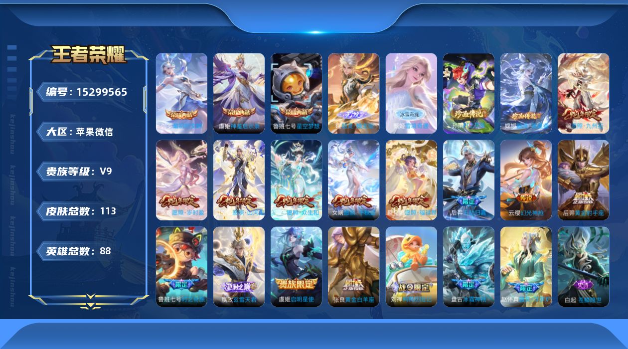 [15299565]精氪号!3天幕!雪宝小兵!苹果WX-V9-永恒钻石V段位-88英雄-113皮肤-3典藏皮肤-2无双-2珍品传说-13传说-26史诗