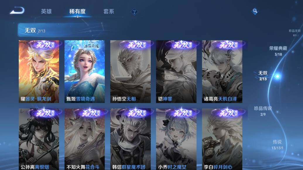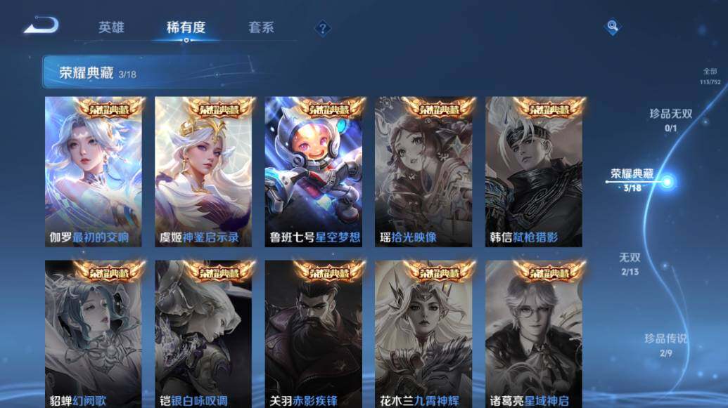 - PX_2095414-07 安卓QQ/非凡王者/182皮肤/123英雄/1典藏/0珍品无双/0无双/3珍品传说/11传说/47史诗/7稀有英雄 【3 珍品传说】酷洛米之心 安琪拉,大耳狗之梦 瑶,兔狲·蓬尾 张飞, 【1 典藏皮肤】拾光映像 瑶, 【11 传说皮肤】逐花归海 澜,时之祈愿 瑶,祈雪灵祝 公孙离,至美·化雀舞 甄姬,妄想实况 马可波罗,黄金白羊座 张良,愿照·众生和 妲己,愿照·福禄