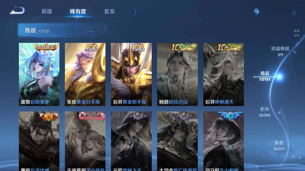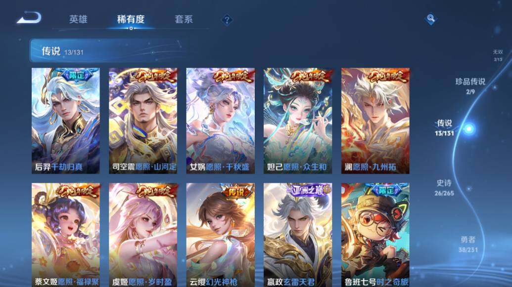 【传说皮肤】:后羿千劫归真,司空震愿照山河定,女娲愿照千秋盛,妲己愿照众生和,澜愿照九州拓,蔡文姬愿照福禄聚,虞姬愿照岁时盈,云缨幻光神枪,嬴政玄雷天君,鲁班七号时之奇旅,虞姬启明星使,张良黄金白羊座,后羿黄金射手座
