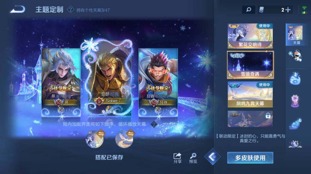 【限定皮肤】:狄仁杰阴阳师,赵云皇家上将,鲁班七号时之奇旅,狄仁杰魔术师,项羽海滩派对,虞姬启明星使,蒙犽狂想玩偶喵,盘古冰霜神祇
