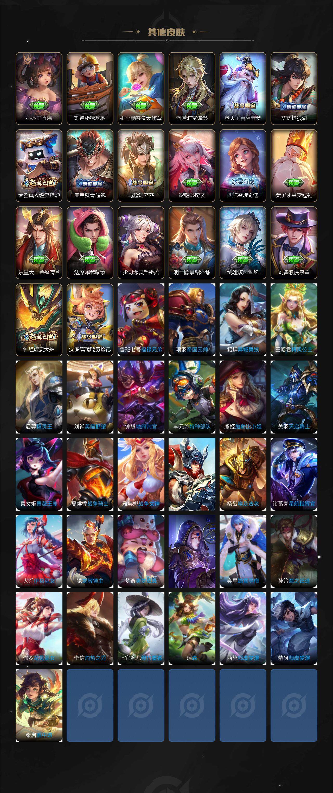【其他皮肤】:项羽海滩派对,赵云忍炎影,程咬金星际陆战队,扁鹊救世之瞳,安琪拉玩偶对对碰,孙膑天使之翼,姜子牙时尚教父,典韦黄金武士,亚瑟死亡骑士,达摩拳王,花木兰兔女郎,甄姬花好人间,刘备万事如意,宫本武藏万象初新,后羿阿尔法小队,狄仁杰阴阳师,关羽龙腾万里,诸葛亮掌控之力,小乔丁香结,刘禅秘密基地,姬小满零食大作战,海诺时空谍影,老夫子百相守梦,苍苍林狼骑,太乙真人谧流熔炉,典韦铁骨偃魂,马超访茗客,影魅影绮裳,西施雪境奇遇,姜子牙星梦巡礼,东皇太一金福满堂,达摩爆裂喵拳,少司缘灵卦秘语,明世隐景韶洛都,戈娅玫蓝誓约,刘备浪漫序章,钟馗虚灵犬护,沈梦溪鸭鸭历险记,鲁班七号福禄兄弟,项羽帝国元帅,貂蝉异域舞娘,王昭君精灵公主,后羿精灵王,刘禅英喵野望,钟馗地府判官,李元芳特种部队,虞姬加勒比小姐,关羽天启骑士,蔡文姬蔷薇王座,夏侯惇战争骑士,雅典娜战争女神,苍维京掠夺者,杨戬埃及法老,诸葛亮星航指挥官,大乔伊势巫女,铠龙域领主,梦奇美梦成真,明世隐占星师,弈星踏雪寻梅,孙策海之征途,