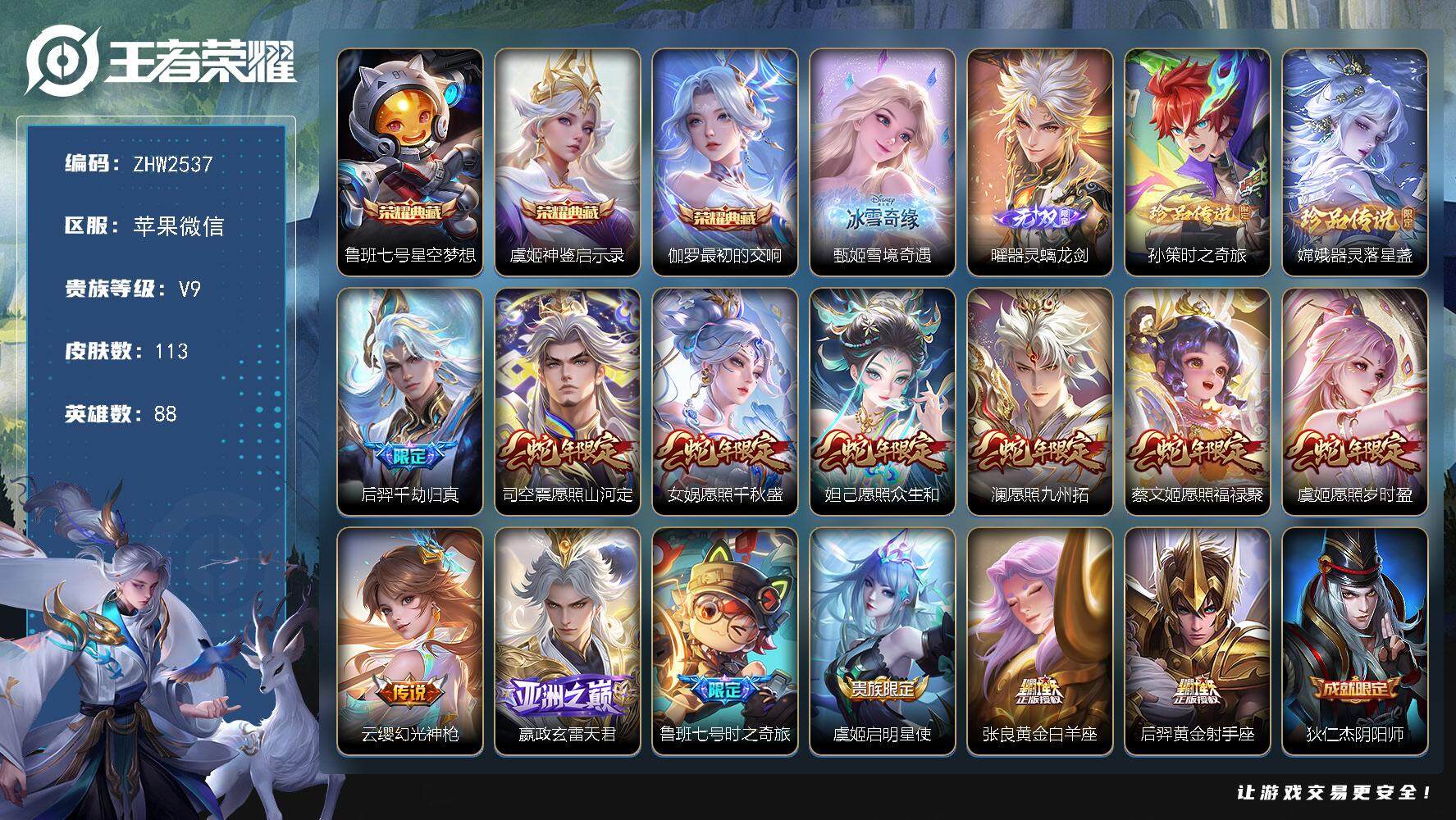 [15299565]精氪号!3天幕!雪宝小兵!苹果WX-V9-永恒钻石V段位-88英雄-113皮肤-3典藏皮肤-2无双-2珍品传说-13传说-26史诗 【英雄全皮】:影全皮 【荣耀典藏】:鲁班七号星空梦想,虞姬神鉴启示录,伽罗最初的交响 【无双皮肤】:甄姬雪境奇遇,曜器灵螭龙剑 【珍品传说】:孙策时之奇旅,嫦娥器灵落星盏 【传说皮肤】:后羿千劫归真,司空震愿照山河定,女娲愿照千秋盛,妲己愿照众生和,澜愿照九州拓,蔡文姬愿照福禄聚,虞姬愿照岁时盈,云缨幻光神枪,嬴政玄雷天君,鲁班七号时之奇旅,虞姬启明星使,张良黄金白羊座,后羿黄金射手座 【限定皮肤】:狄仁杰阴阳师,赵云皇家上将,鲁班七号时之奇旅,狄仁杰魔术师,项羽海滩派对,虞姬启明星使,蒙犽狂想玩偶喵,盘古冰霜神祇 【战令限定】:蒙犽狂想玩偶喵 【史诗皮肤】:鲁班七号电玩小子,赵云皇家上将,王昭君偶像歌手,狄仁杰魔术师,廉颇地狱岩魂,孙尚香水果甜心,妲己魅力维加斯,花木兰水晶猎龙者,夏侯惇乘风破浪,诸葛亮黄金分割率,亚瑟心灵战警,雅典娜冰冠公主,蔡文姬舞动绿茵,大乔猫狗日记,大乔白蛇,蒙犽狂想玩偶喵,蒙犽龙鼓争鸣,沈梦溪月团寄思,安琪拉时之奇旅,盘古冰霜神祇,刘禅电玩爆裂旋风,百里守约百相守梦,孙膑茶境仙,白起苍鳞隐世,赵怀真器灵浮梦炉,刘禅鸭鸭历险记 【其他皮肤】:项羽海滩派对,赵云忍炎影,程咬金星际陆战队,扁鹊救世之瞳,安琪拉玩偶对对碰,孙膑天使之翼,姜子牙时尚教父,典韦黄金武士,亚瑟死亡骑士,达摩拳王,花木兰兔女郎,甄姬花好人间,刘备万事如意,宫本武藏万象初新,后羿阿尔法小队,狄仁杰阴阳师,关羽龙腾万里,诸葛亮掌控之力,小乔丁香结,刘禅秘密基地,姬小满零食大作战,海诺时空谍影,老夫子百相守梦,苍苍林狼骑,太乙真人谧流熔炉,典韦铁骨偃魂,马超访茗客,影魅影绮裳,西施雪境奇遇,姜子牙星梦巡礼,东皇太一金福满堂,达摩爆裂喵拳,少司缘灵卦秘语,明世隐景韶洛都,戈娅玫蓝誓约,刘备浪漫序章,钟馗虚灵犬护,沈梦溪鸭鸭历险记,鲁班七号福禄兄弟,项羽帝国元帅,貂蝉异域舞娘,王昭君精灵公主,后羿精灵王,刘禅英喵野望,钟馗地府判官,李元芳特种部队,虞姬加勒比小姐,关羽天启骑士,蔡文姬蔷薇王座,夏侯惇战争骑士,雅典娜战争女神,苍维京掠夺者,杨戬埃及法老,诸葛亮星航指挥官,大乔伊势巫女,铠龙域领主,梦奇美梦成真,明世隐占星师,弈星踏雪寻梅,孙策海之征途,