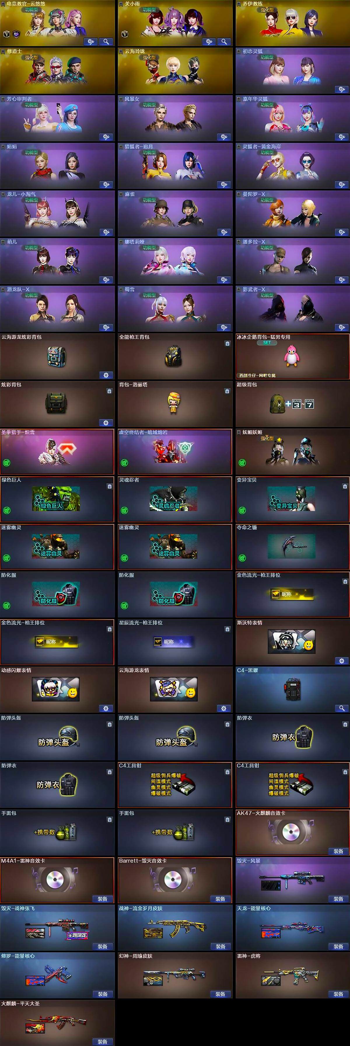 - [14039338]总资产153m【店主推荐捡漏号!可直接换绑】 31943k哈伏币-106m流动资产-60烽火等级-黄金-8战场等级-列兵 【干员外观】:骇爪-维什戴尔,红狼-电锯惊魂 【近战皮肤】:近战-黑鹰 【传说级普通外观】:M4A1突击步枪-蚀金玫瑰,SCAR-H战斗步枪-启航,KC17突击步枪-电锯惊魂,勇士冲锋枪-能天使-午夜邮差,R93狙击步枪-维什戴尔 【史诗级普通外观】:MP5冲锋枪-战术竞备,SR-3M紧凑突击步枪-战术竞备,沙漠之鹰-曙光 【稀有级普通外观】:SMG-45-行动开启,Mini-14射手步枪-荣耀列队,G18-星链科技 【普通级普通外观】:M4A1突击步枪-海色,K416突击步枪-几何迷彩,M16A4突击步枪-山林猎人,SG552突击步枪-浅蓝涂装,SG552突击步枪-海浪,SCAR-H战斗步枪-红色涂装,MP5冲锋枪-海色,Vector冲锋枪-几何迷彩,QCQ171冲锋枪-三角洲力量,M1014霰弹枪-高雅黑,M1014霰弹枪-海浪,M249轻机枪-黄蜂,SR-25射手步枪-黄蜂 【军牌】:军牌-装备修理,军牌-来点薯条,军牌-信誉优秀 【挂饰】:挂饰-火箭玫瑰,挂饰-窃风密探,挂饰-能天使,挂饰-维什戴尔,挂饰-阿萨拉狙击兵,挂饰-阿萨拉霰弹兵,挂饰-诡影狙击兵,挂饰-诡影喷火兵,挂饰-启程,挂饰-阿萨拉徽章
