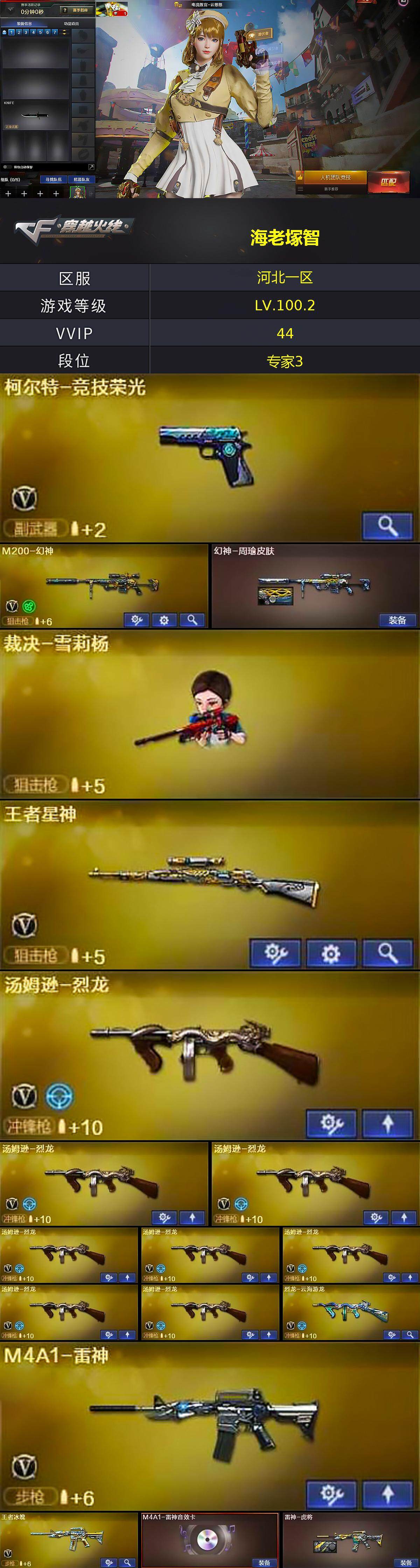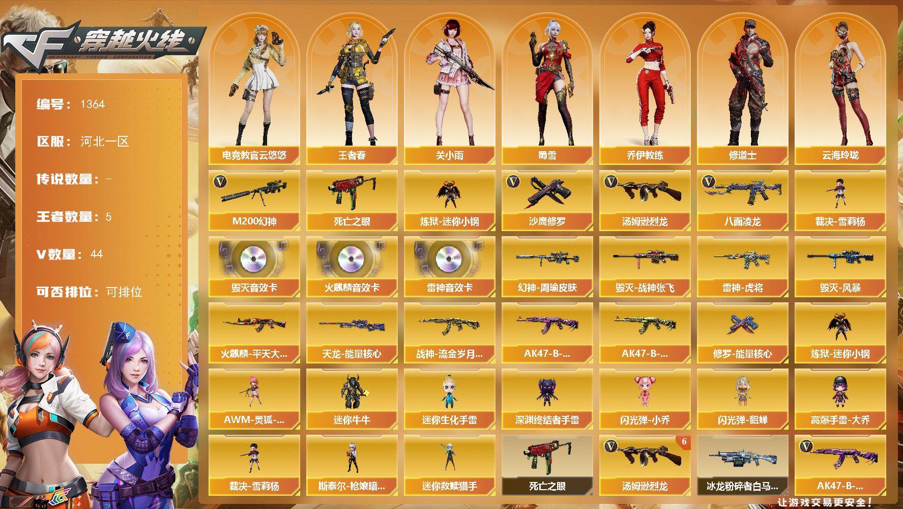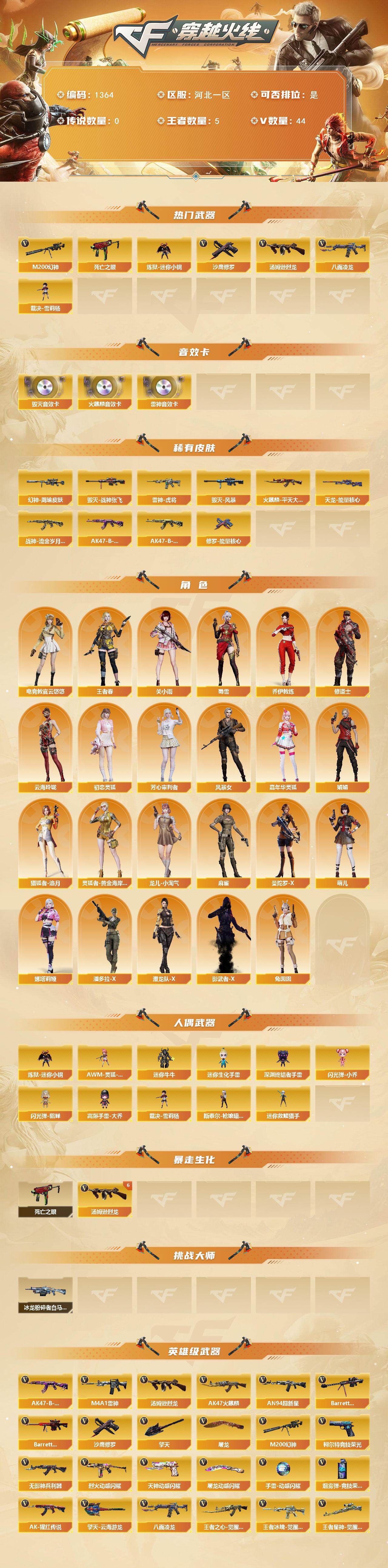[15300961]河北一区-44V-5王者-0炫金 【热门武器】:M200-幻神,八面凌龙,死亡之眼,炼狱-迷你小钢,汤姆逊-烈龙*8,裁决-雪莉杨,沙鹰-修罗*4 【音效卡】:AK47-火麒麟音效卡,M4A1-雷神音效卡,Barrett-毁灭音效卡 【皮肤】:幻神-周瑜皮肤,雷神-虎将,火麒麟-平天大圣,毁灭-战神张飞,毁灭-风暴,战神-流金岁月皮肤,AK47-B-常胜将军-曹操,AK47-B-常胜将军-孙权