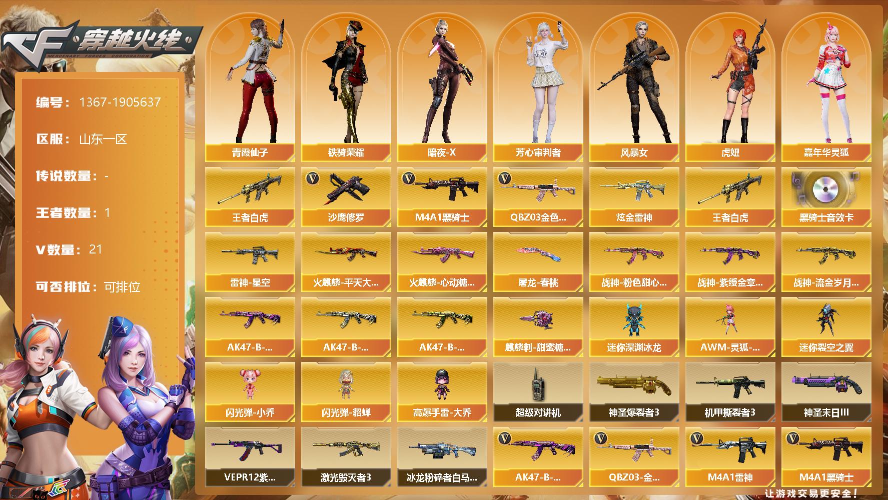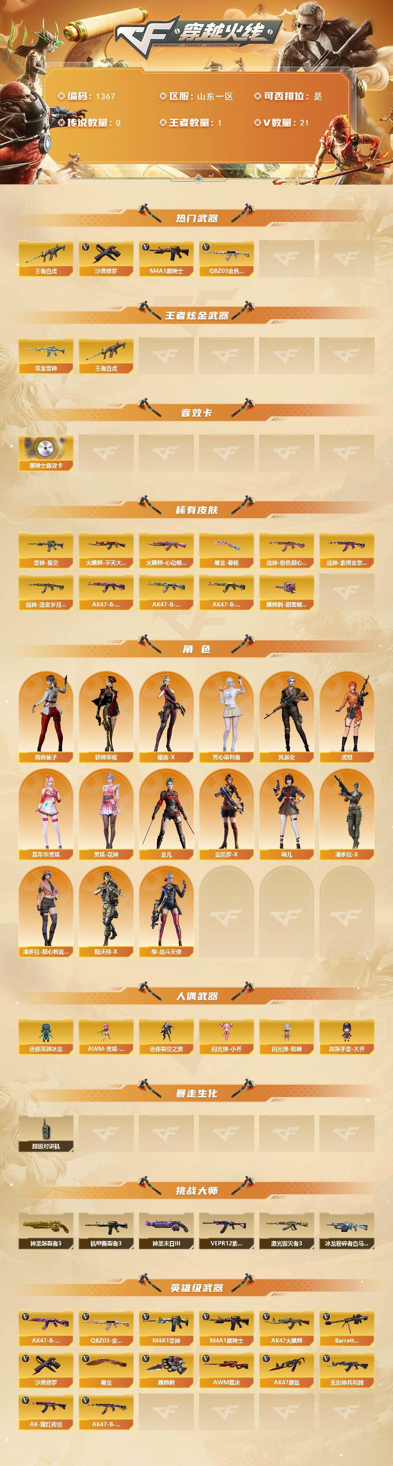 [15301092]山东一区-21V-1王者-1炫金 【热门武器】:王者白虎,QBZ03-金色蔷薇,M4A1-黑骑士,沙鹰-修罗 【王者炫金武器】:王者白虎,炫金雷神 【音效卡】:M4A1-黑骑士音效卡 【皮肤】:雷神-星空,火麒麟-平天大圣,火麒麟-心动糖果,战神-粉色甜心皮肤,战神-紫绶金章皮肤,战神-流金岁月皮肤,AK47-B-常胜将军-曹操,AK47-B-常胜将军-刘备*2,AK47-B-常胜将军-孙权,
