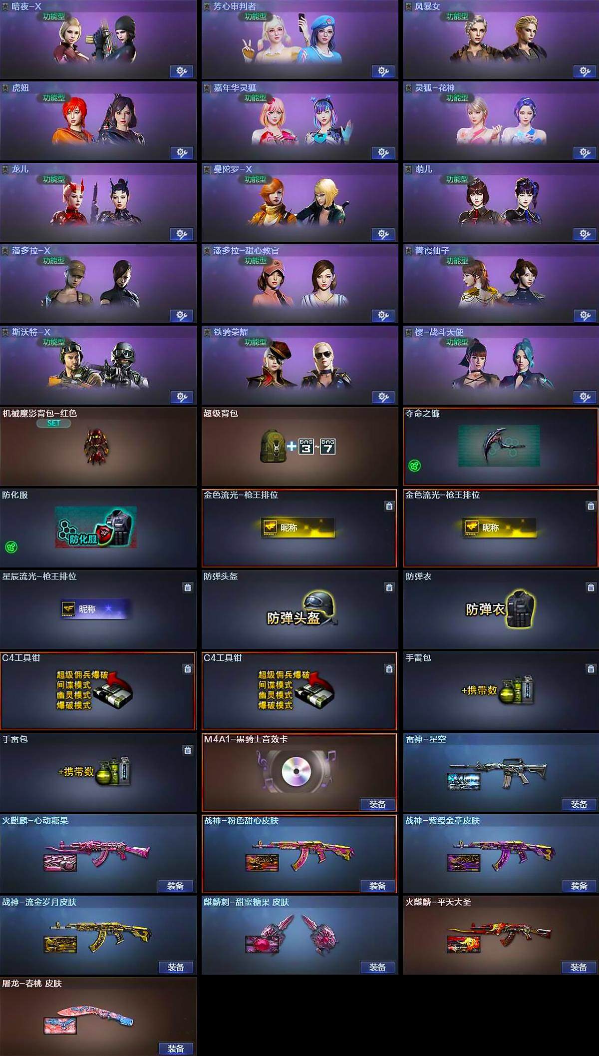 【皮肤】:雷神-星空,火麒麟-平天大圣,火麒麟-心动糖果,战神-粉色甜心皮肤,战神-紫绶金章皮肤,战神-流金岁月皮肤,AK47-B-常胜将军-曹操,AK47-B-常胜将军-刘备*2,AK47-B-常胜将军-孙权,