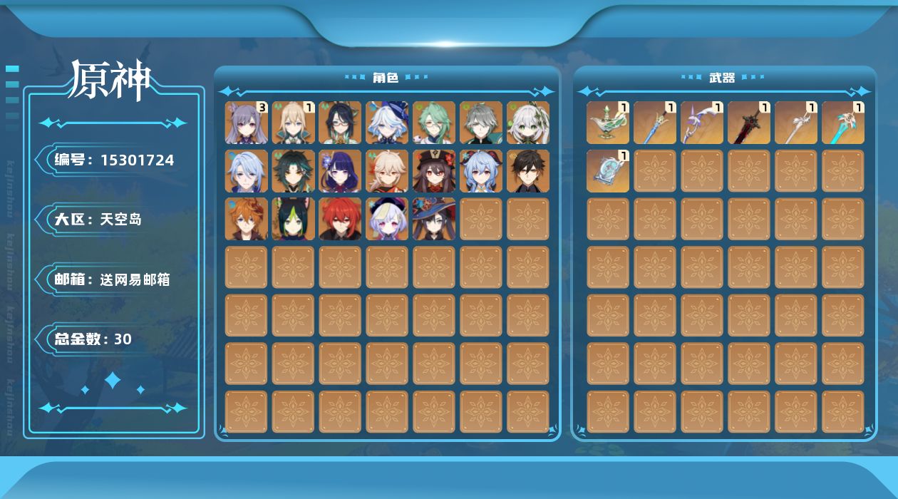 0命闲云,0命芙宁娜,0命白术,0命艾尔海森,0命纳西妲,0命提纳里,0命神里绫人,0命雷电将军,0命枫原万叶,0命钟离,0命胡桃,0命甘雨,0命魈,0命达达利亚,3命刻晴,0命七七,1命琴,0命莫娜,0命迪卢克,精1千夜浮梦,精1苍古自由之誓,精1四风原典,精1阿莫斯之弓,精1天空之刃,精1风鹰剑,精1狼的末路