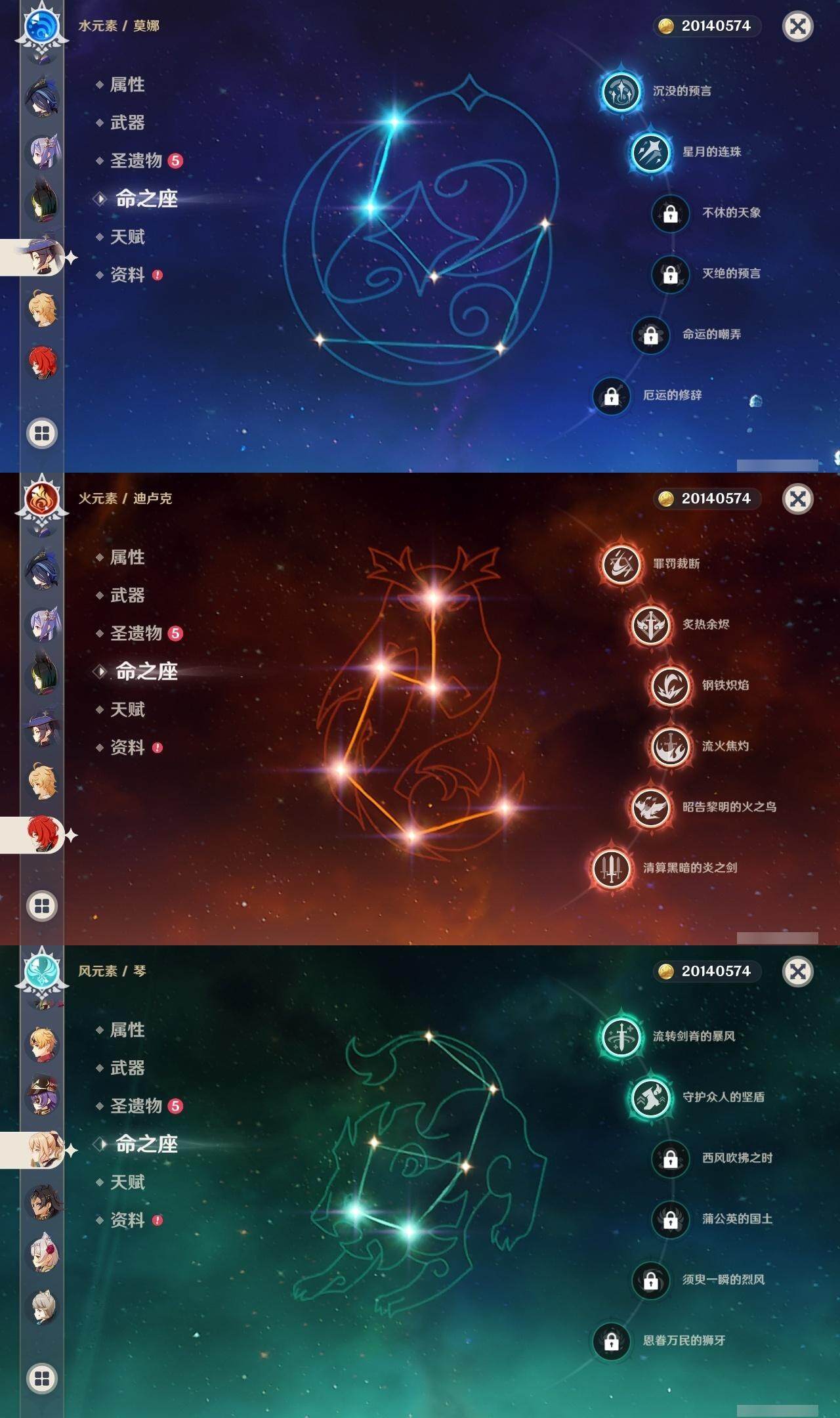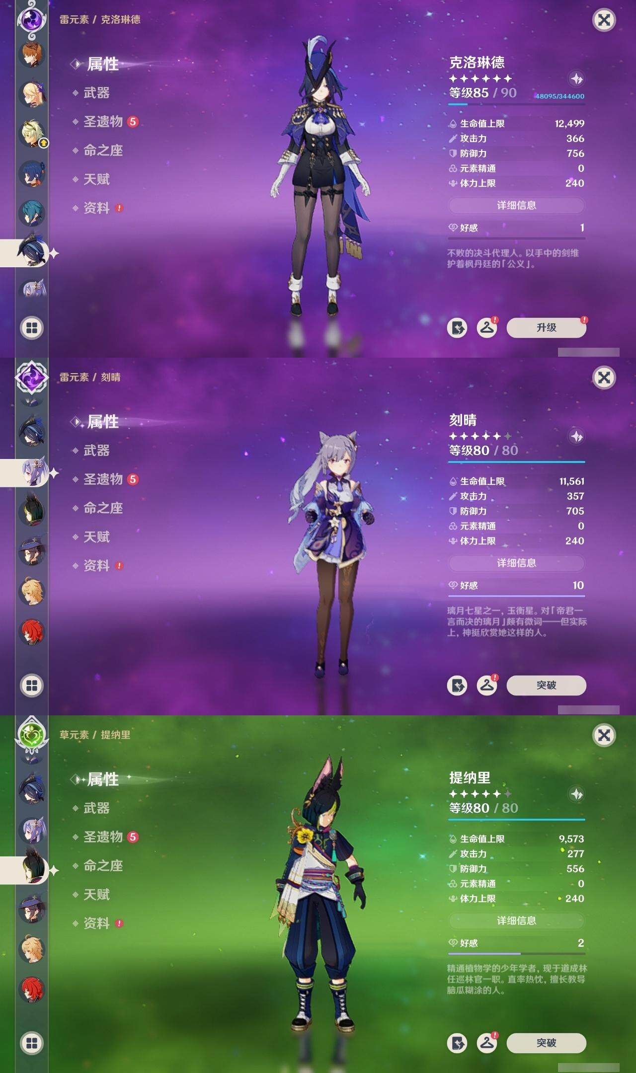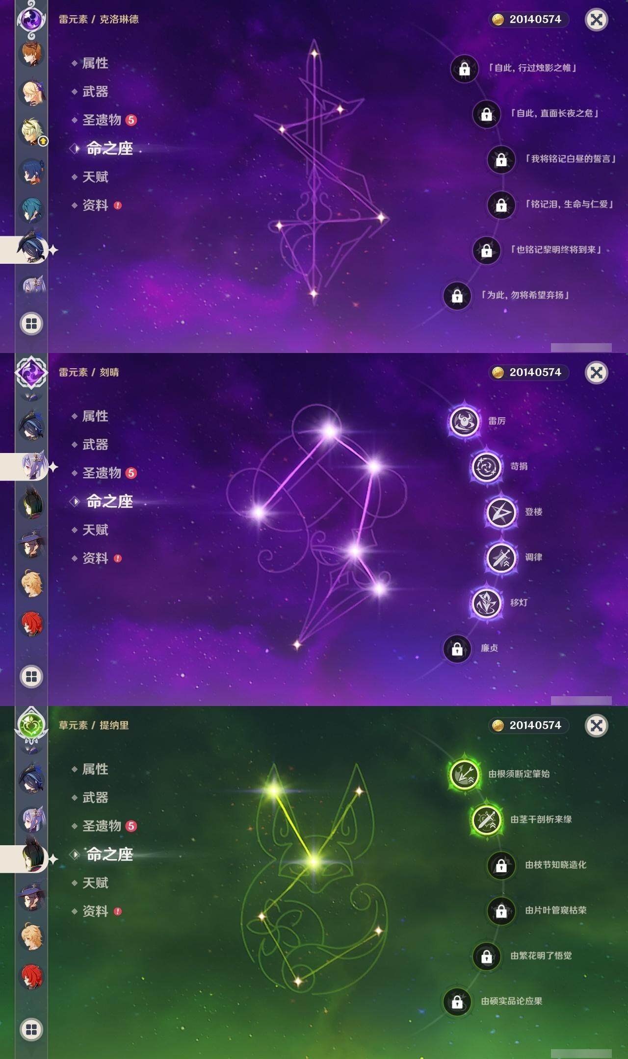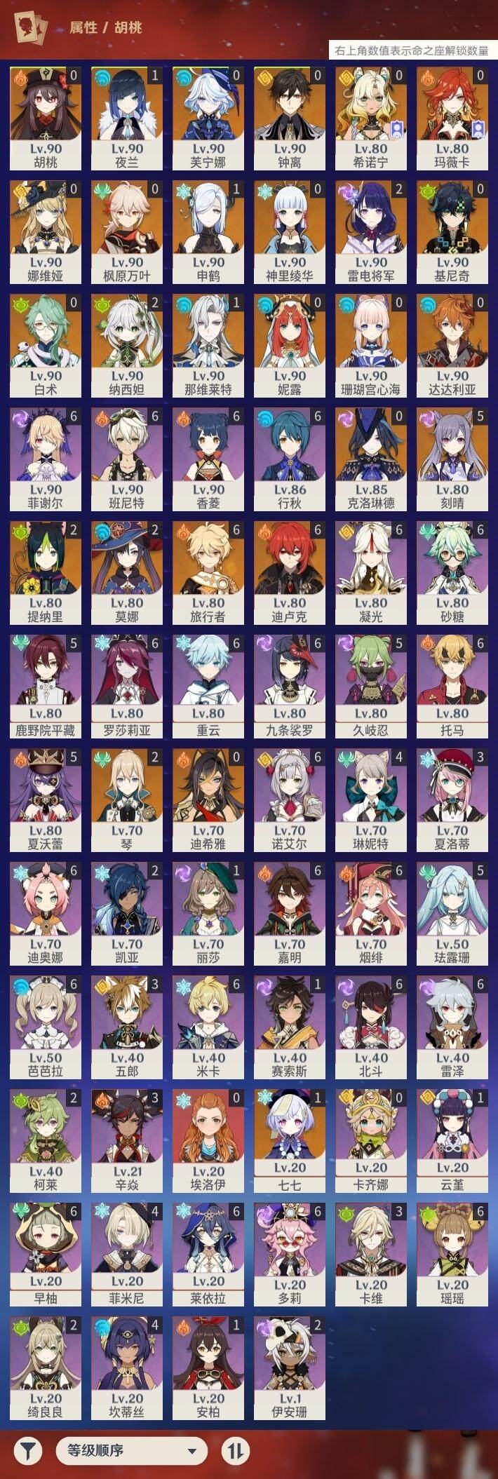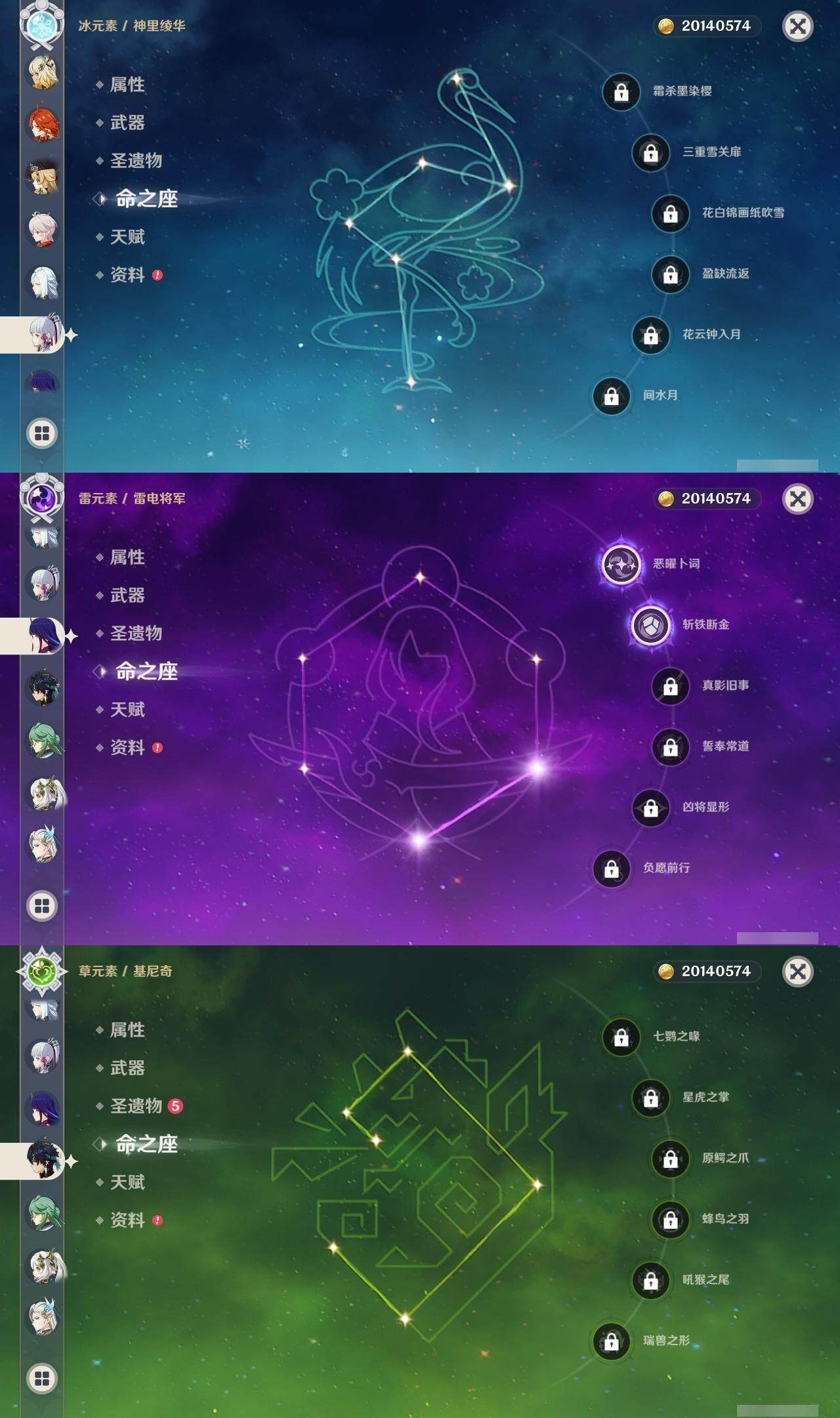 0命克洛琳德,0命娜维娅,0命芙宁娜,1命那维莱特,0命白术,0命迪希雅,2命纳西妲,0命妮露,2命提纳里,1命夜兰,1命申鹤,2命雷电将军,0命枫原万叶,0命神里绫华,0命钟离,0命胡桃,0命达达利亚,0命珊瑚宫心海,5命刻晴,1命七七,2命琴,2命莫娜,满命迪卢克,0命基尼奇,0命希诺宁,0命玛薇卡,精1圣显之钥,精1波乱月白经津,精1冬极白星,精1薙草之稻光,精1飞雷之弦振,精1雾切之回光,精1无工之剑,精1和璞鸢,精2天空之脊,精1天空之翼,精2天空之刃,精1风鹰剑