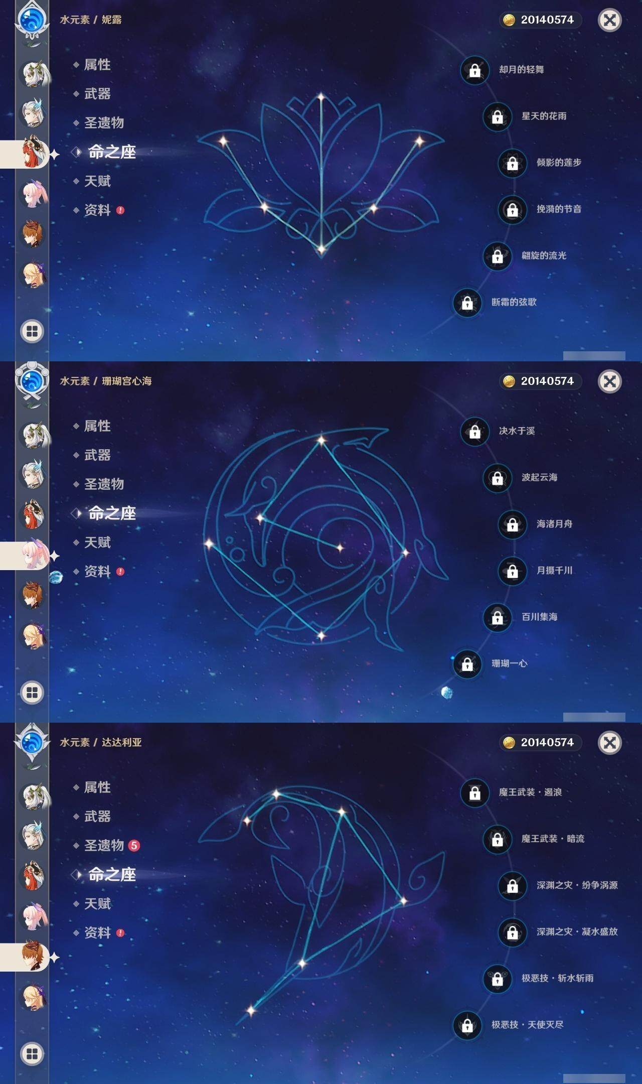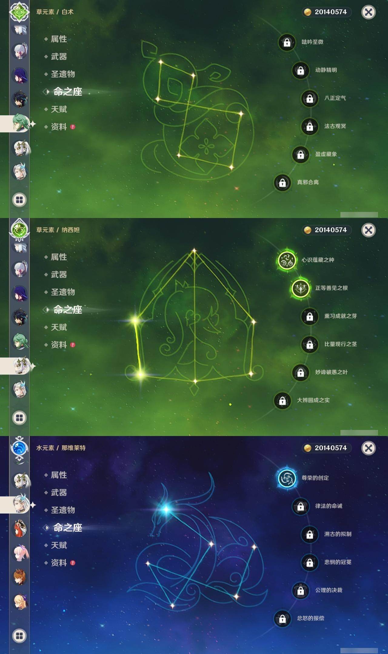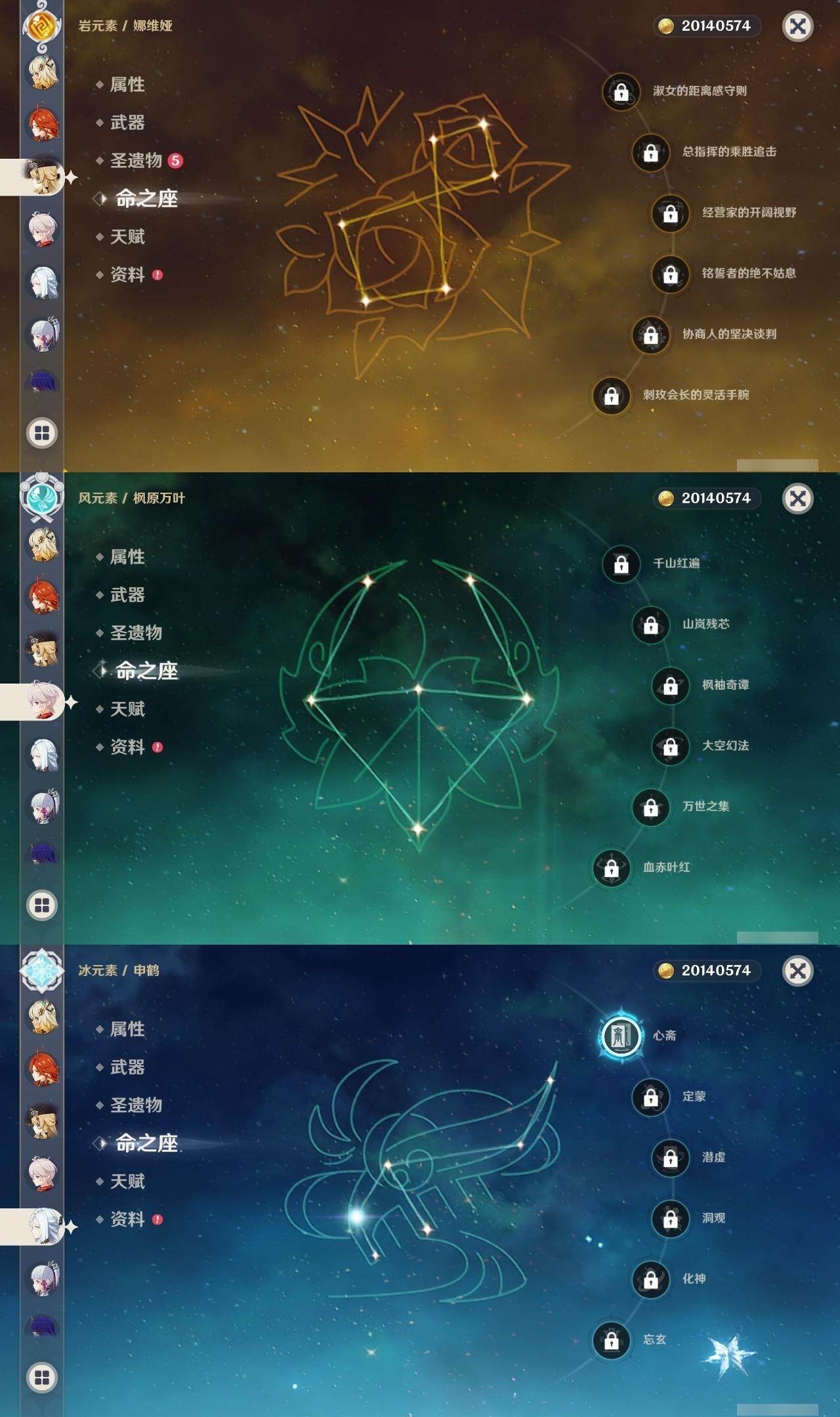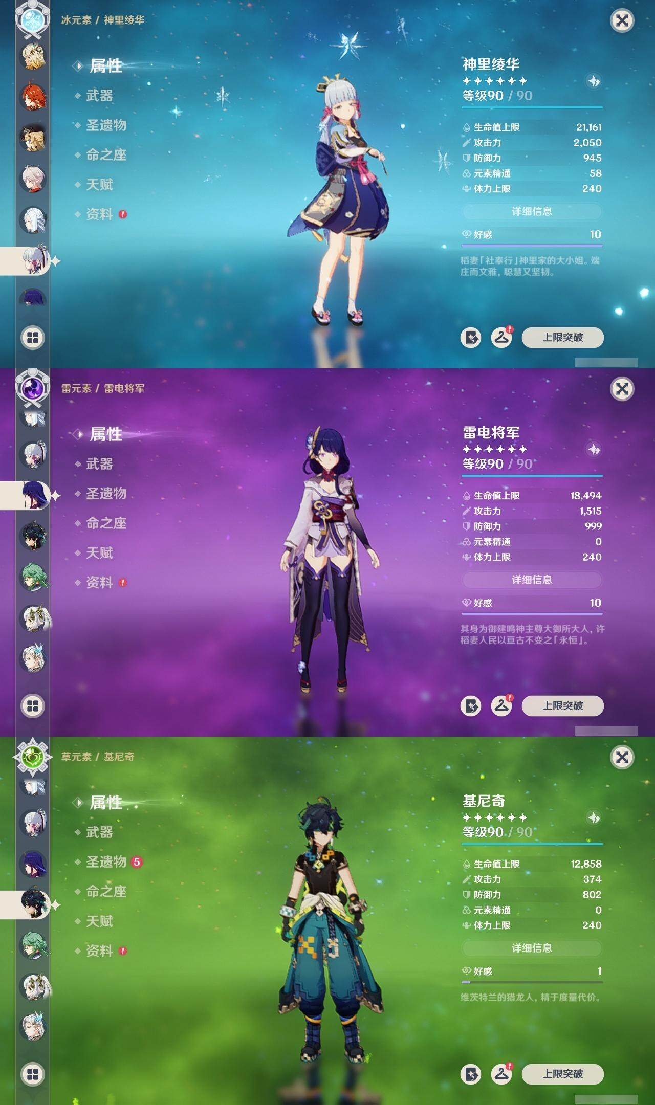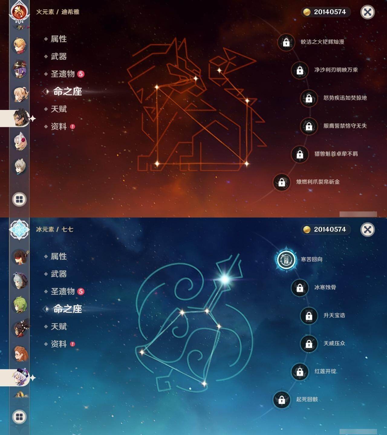 0命克洛琳德,0命娜维娅,0命芙宁娜,1命那维莱特,0命白术,0命迪希雅,2命纳西妲,0命妮露,2命提纳里,1命夜兰,1命申鹤,2命雷电将军,0命枫原万叶,0命神里绫华,0命钟离,0命胡桃,0命达达利亚,0命珊瑚宫心海,5命刻晴,1命七七,2命琴,2命莫娜,满命迪卢克,0命基尼奇,0命希诺宁,0命玛薇卡,精1圣显之钥,精1波乱月白经津,精1冬极白星,精1薙草之稻光,精1飞雷之弦振,精1雾切之回光,精1无工之剑,精1和璞鸢,精2天空之脊,精1天空之翼,精2天空之刃,精1风鹰剑