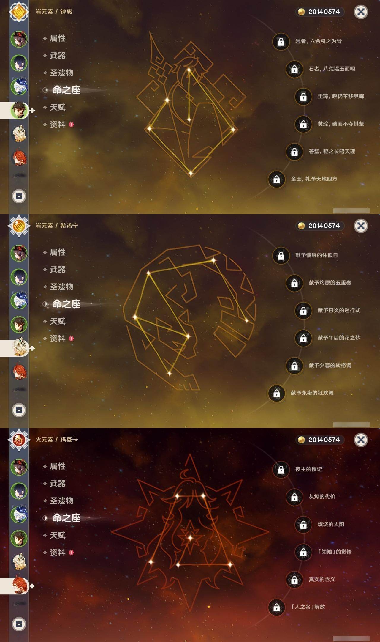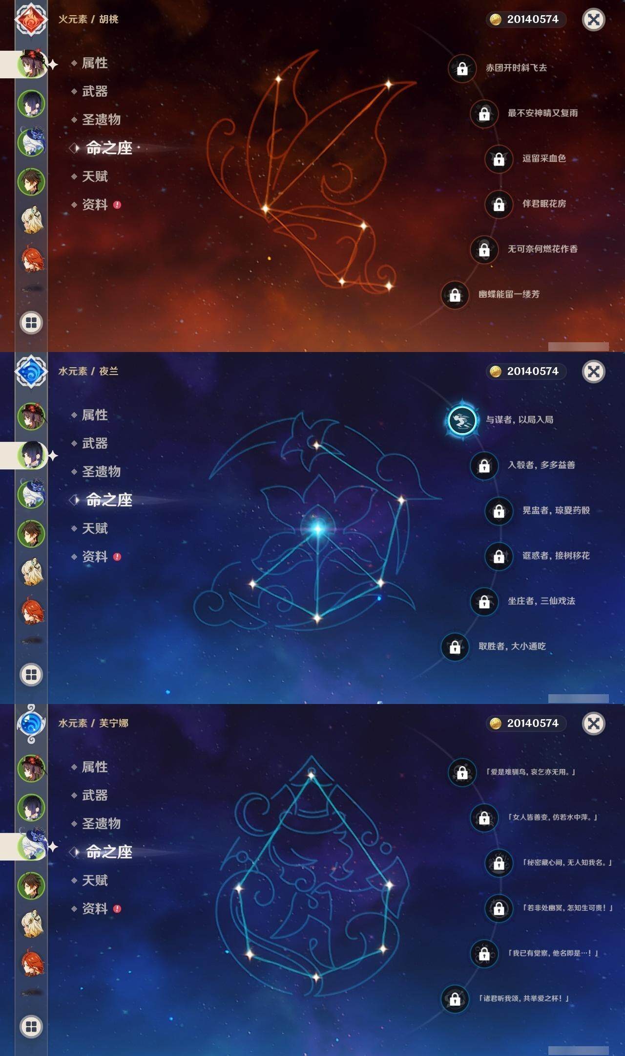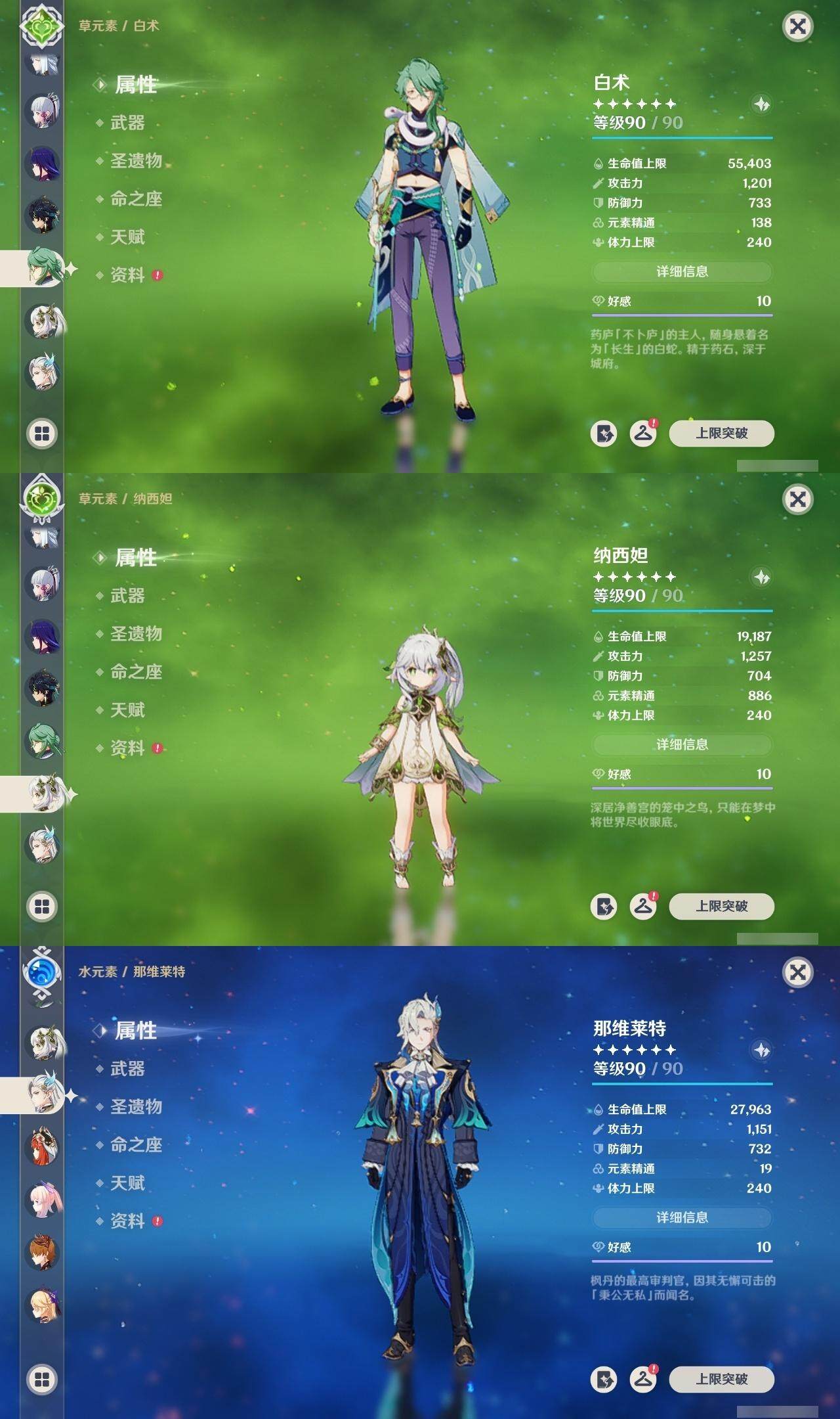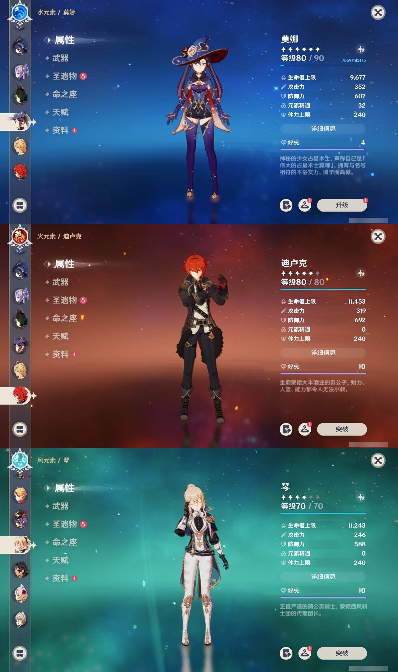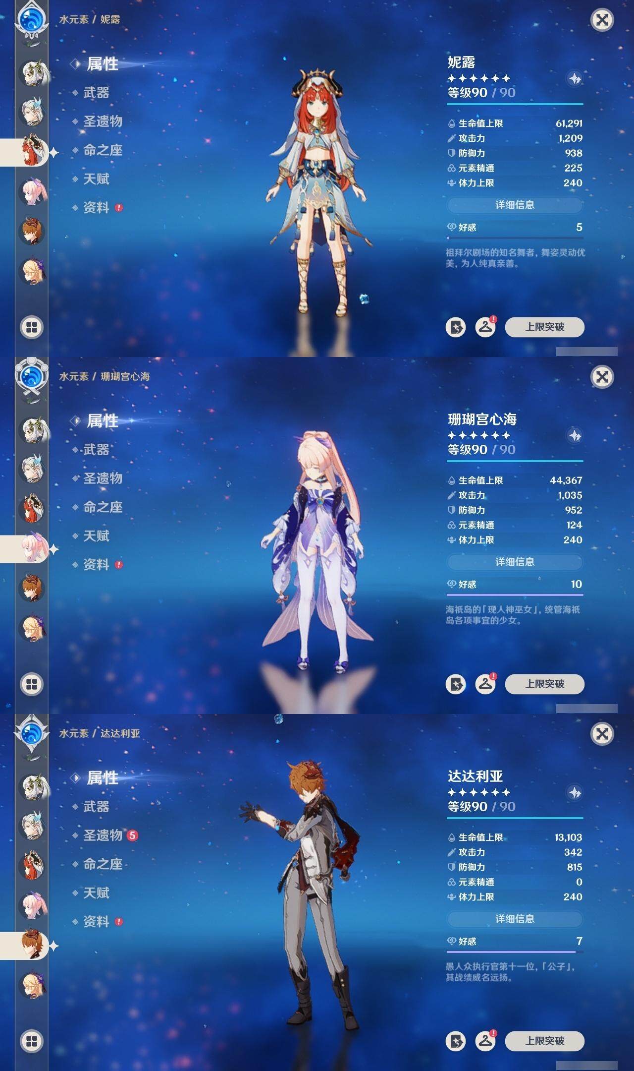 0命克洛琳德,0命娜维娅,0命芙宁娜,1命那维莱特,0命白术,0命迪希雅,2命纳西妲,0命妮露,2命提纳里,1命夜兰,1命申鹤,2命雷电将军,0命枫原万叶,0命神里绫华,0命钟离,0命胡桃,0命达达利亚,0命珊瑚宫心海,5命刻晴,1命七七,2命琴,2命莫娜,满命迪卢克,0命基尼奇,0命希诺宁,0命玛薇卡,精1圣显之钥,精1波乱月白经津,精1冬极白星,精1薙草之稻光,精1飞雷之弦振,精1雾切之回光,精1无工之剑,精1和璞鸢,精2天空之脊,精1天空之翼,精2天空之刃,精1风鹰剑