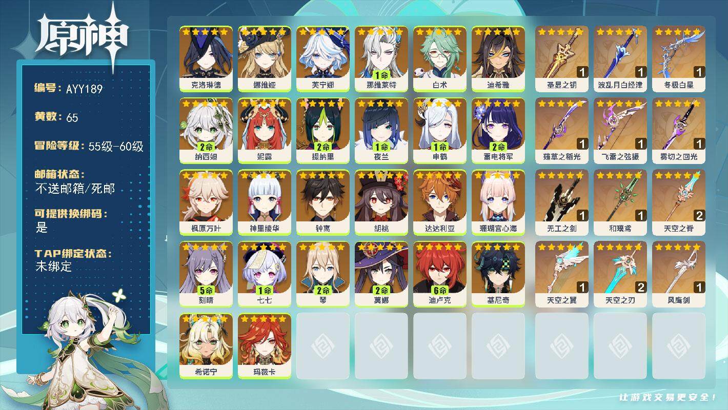 [15302208]60级/65黄/男主/26个五星角色/12个五星武器 0命克洛琳德,0命娜维娅,0命芙宁娜,1命那维莱特,0命白术,0命迪希雅,2命纳西妲,0命妮露,2命提纳里,1命夜兰,1命申鹤,2命雷电将军,0命枫原万叶,0命神里绫华,0命钟离,0命胡桃,0命达达利亚,0命珊瑚宫心海,5命刻晴,1命七七,2命琴,2命莫娜,满命迪卢克,0命基尼奇,0命希诺宁,0命玛薇卡,精1圣显之钥,精1波乱月白经津,精1冬极白星,精1薙草之稻光,精1飞雷之弦振,精1雾切之回光,精1无工之剑,精1和璞鸢,精2天空之脊,精1天空之翼,精2天空之刃,精1风鹰剑