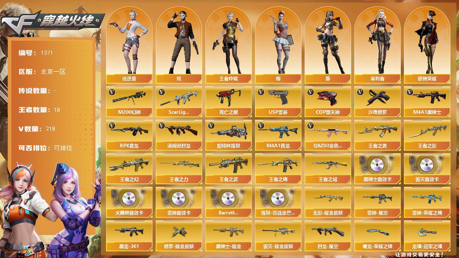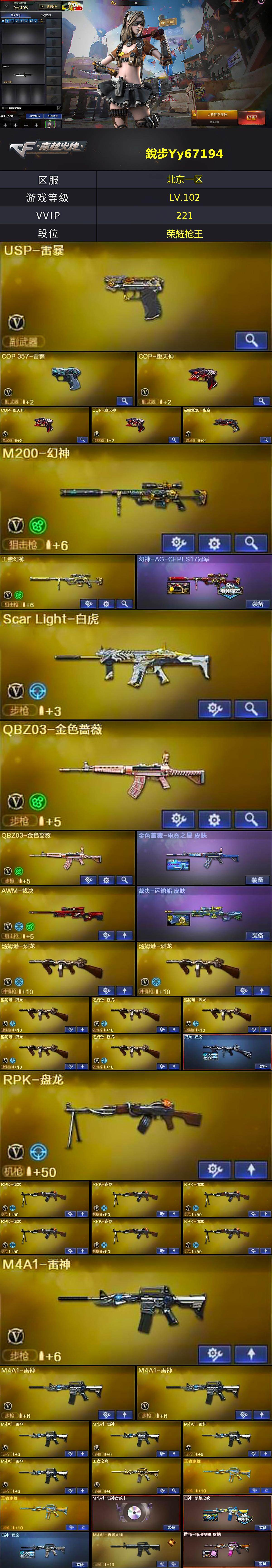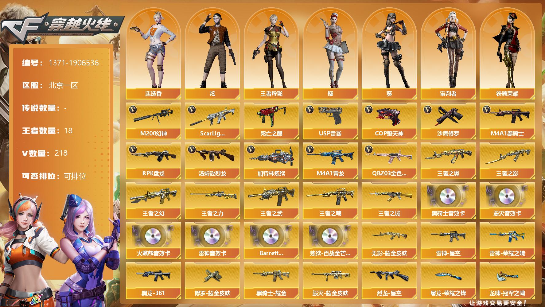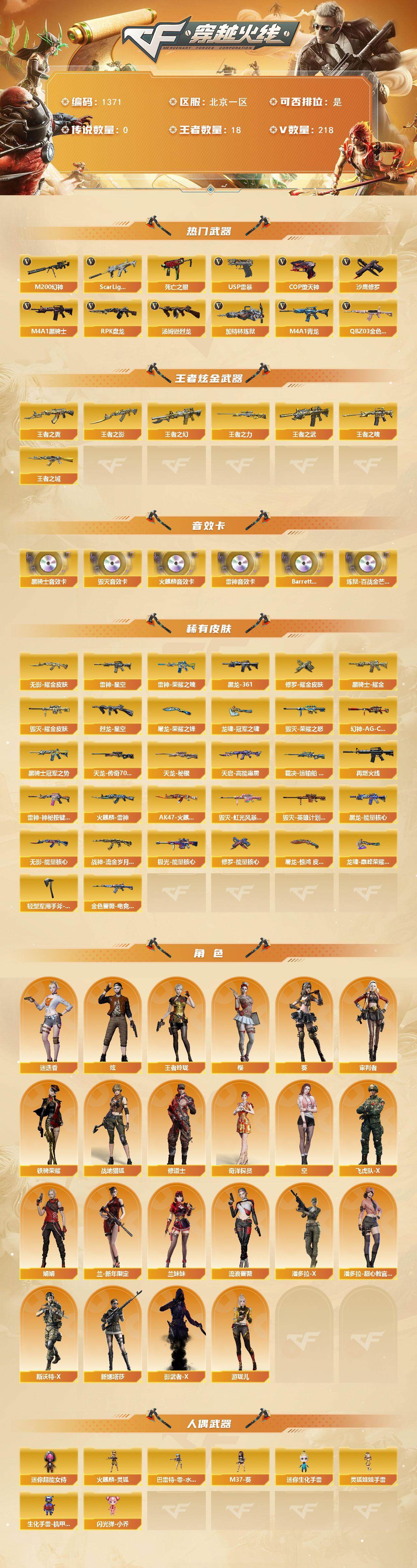 [15304133]北京一区-218V-18王者-0炫金 【热门武器】:QBZ03-金色蔷薇*2,Scar Light-白虎,M4A1-青龙,M200-幻神,死亡之眼*2,M4A1-黑骑士*6,汤姆逊-烈龙*7,RPK-盘龙*7,加特林-炼狱*3,USP-雷暴,COP-堕天神*3,沙鹰-修罗*6 【王者炫金武器】:王者之城,王者之幻,王者之翼,王者之武,王者之影,王者之魄*2,王者之力*3 【音效卡】:AK47-