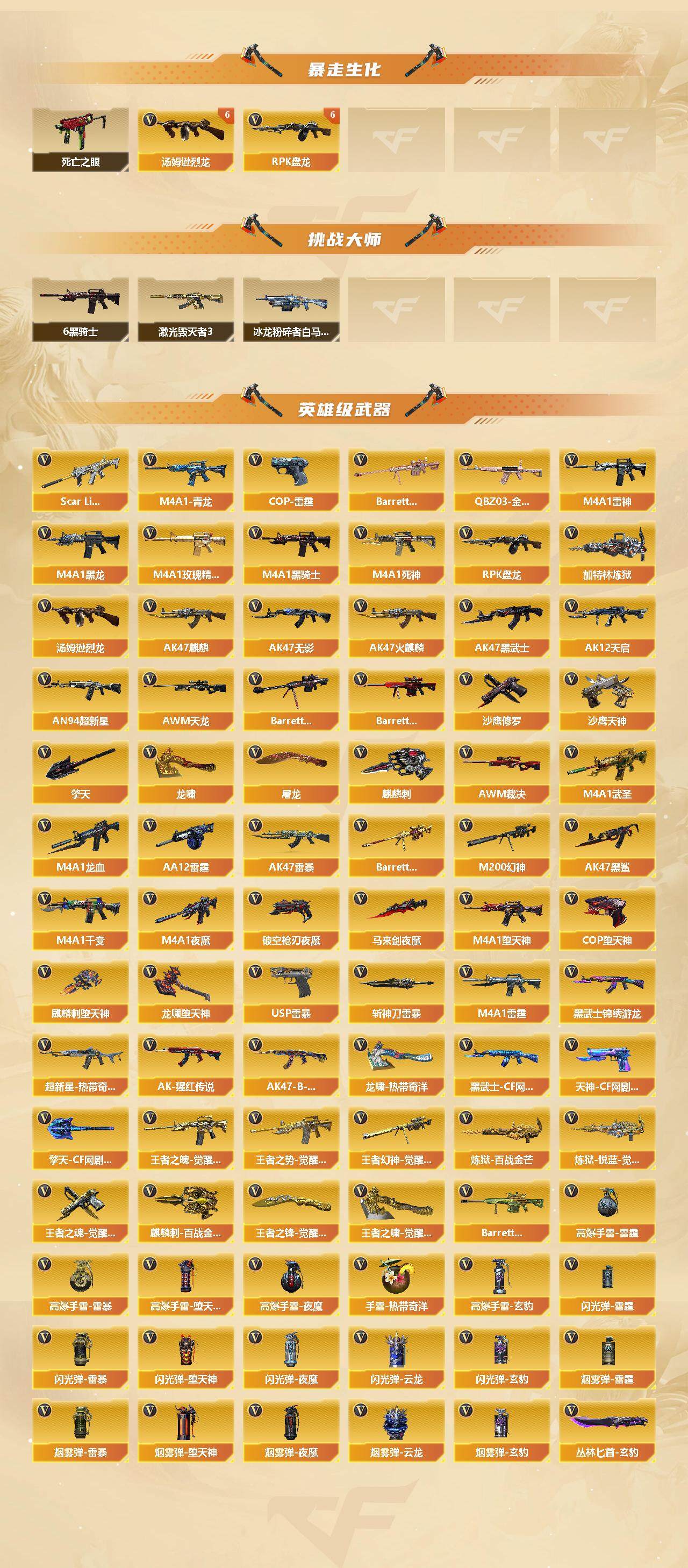 【热门武器】:QBZ03-金色蔷薇*2,Scar Light-白虎,M4A1-青龙,M200-幻神,死亡之眼*2,M4A1-黑骑士*6,汤姆逊-烈龙*7,RPK-盘龙*7,加特林-炼狱*3,USP-雷暴,COP-堕天神*3,沙鹰-修罗*6