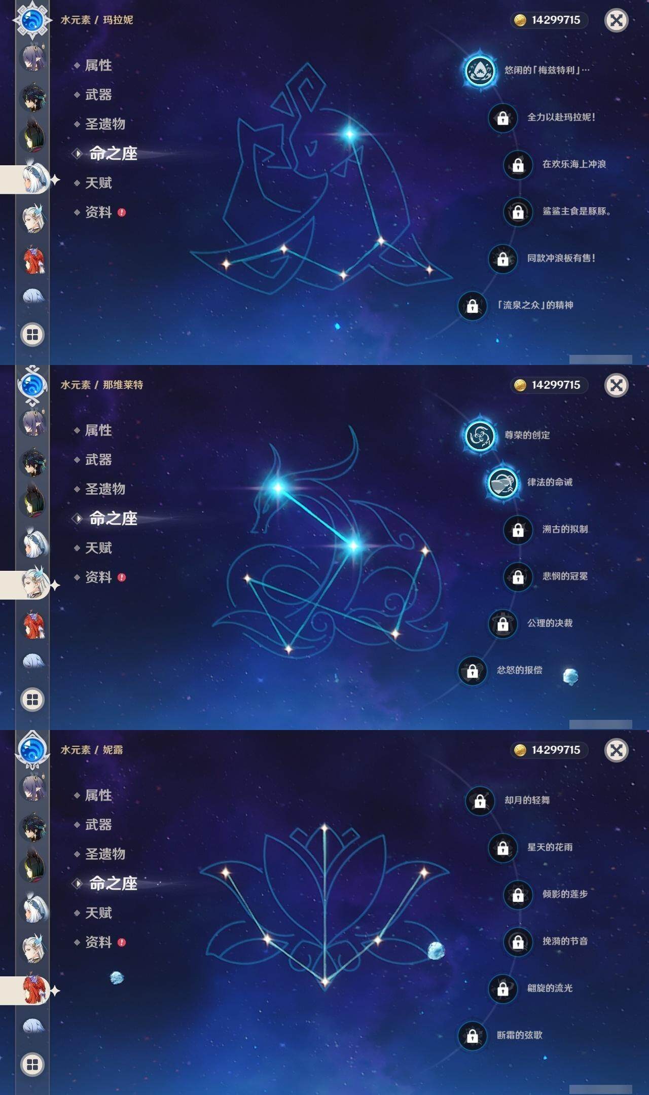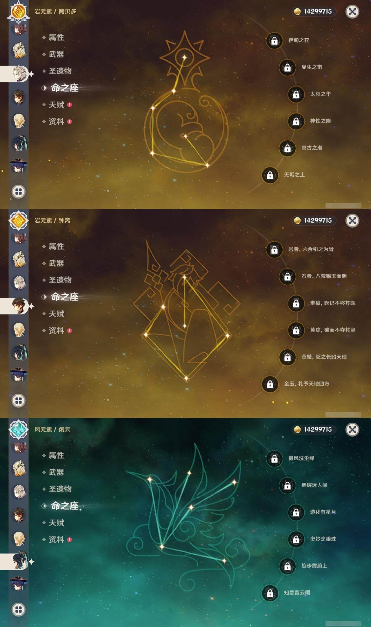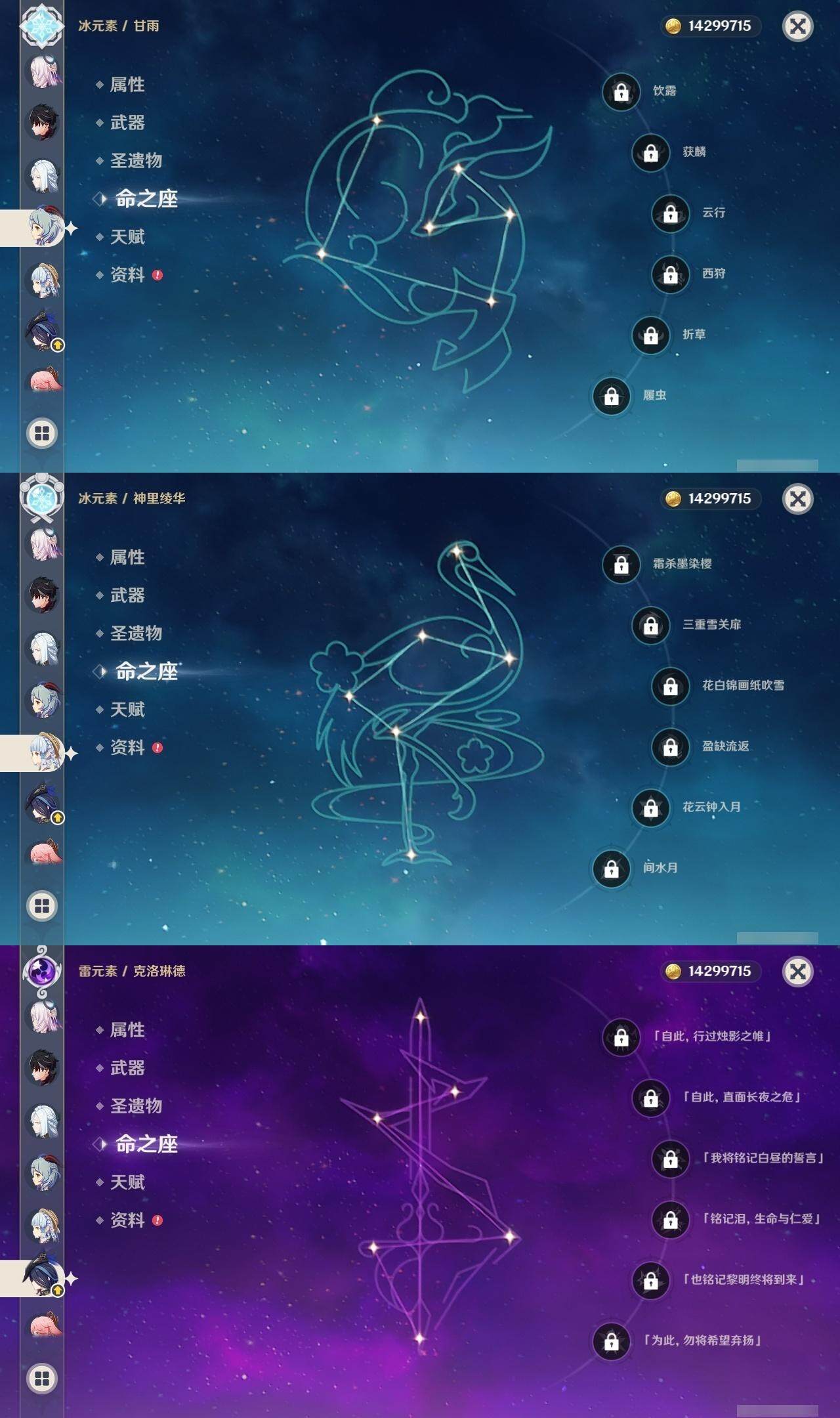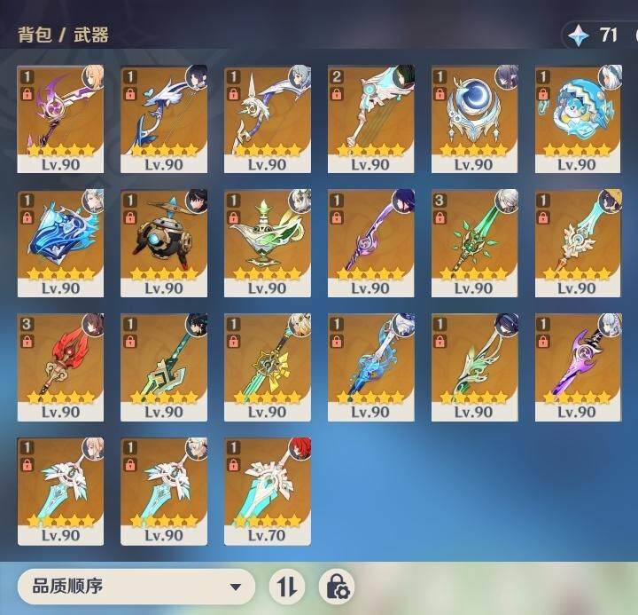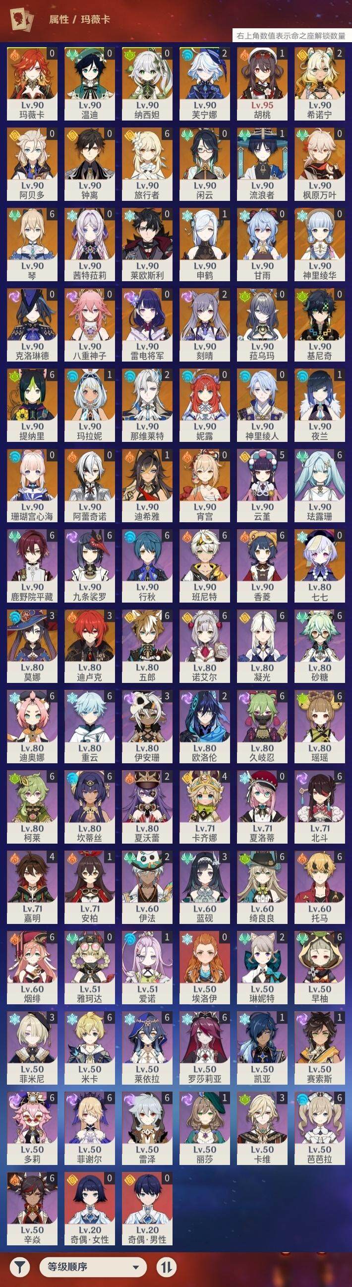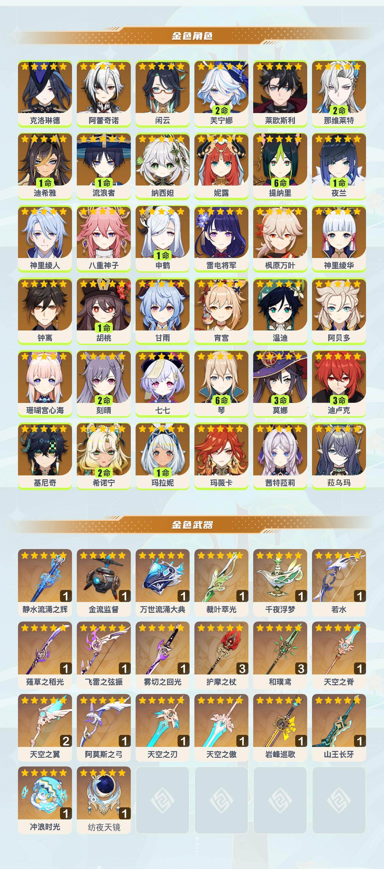 0命克洛琳德,0命阿蕾奇诺,0命闲云,2命芙宁娜,0命莱欧斯利,2命那维莱特,1命迪希雅,1命流浪者,0命纳西妲,0命妮露,满命提纳里,1命夜兰,0命神里绫人,0命八重神子,1命申鹤,0命雷电将军,0命枫原万叶,0命神里绫华,0命钟离,1命胡桃,0命甘雨,0命宵宫,0命温迪,0命阿贝多,0命珊瑚宫心海,2命刻晴,0命七七,满命琴,3命莫娜,3命迪卢克,0命基尼奇,2命希诺宁,1命玛拉妮,0命玛薇卡,0命茜特菈莉,0命菈乌玛,精1静水流涌之辉,精1金流监督,精1万世流涌大典,精1裁叶萃光,精1千夜浮梦,精1若水,精1薙草之稻光,精1飞雷之弦振,精1雾切之回光,精3护摩之杖,精3和璞鸢,精1天空之脊,精2天空之翼,精1阿莫斯之弓,精1天空之刃,精1天空之傲,精1岩峰巡歌,精1山王长牙,精1冲浪时光,精1纺夜天镜