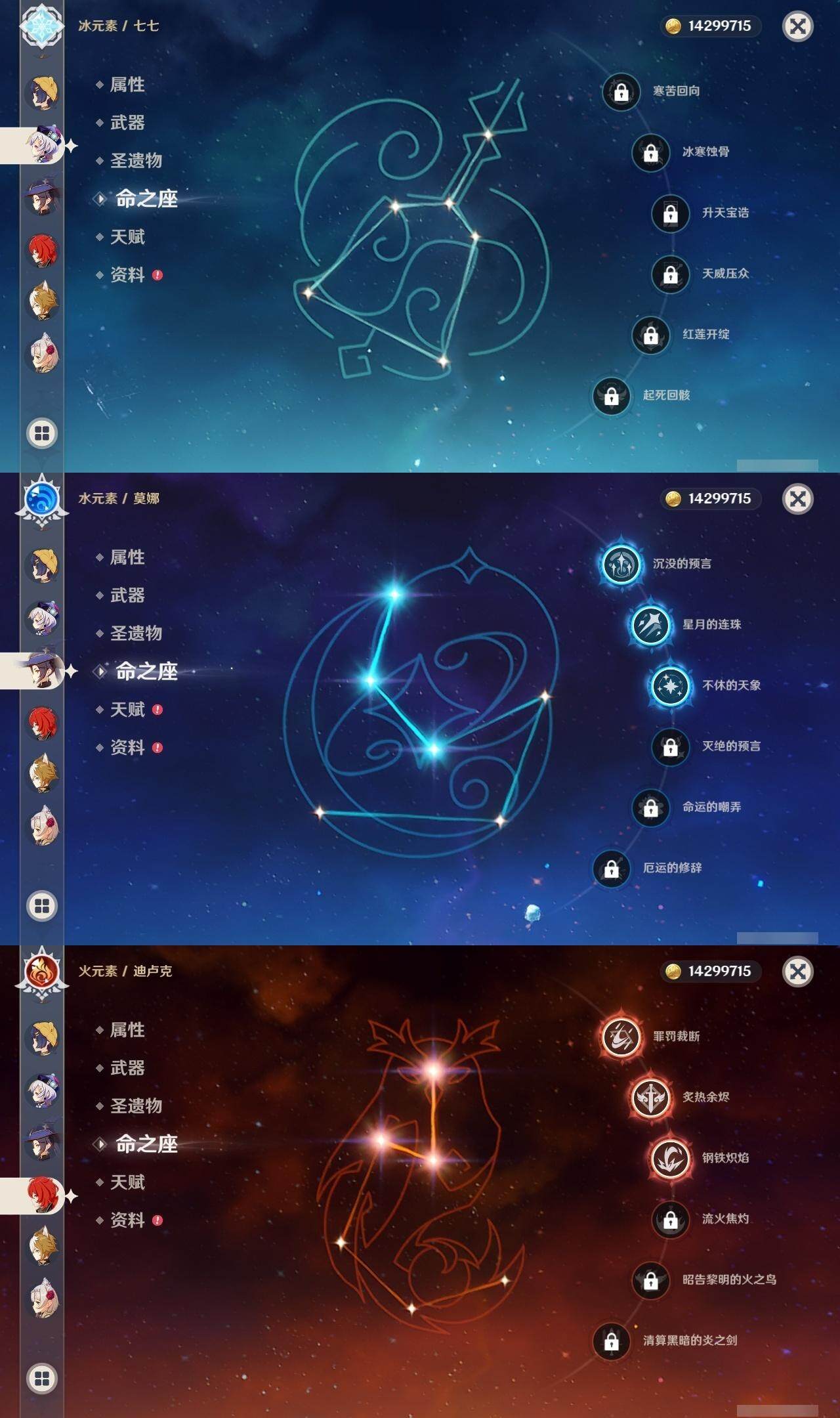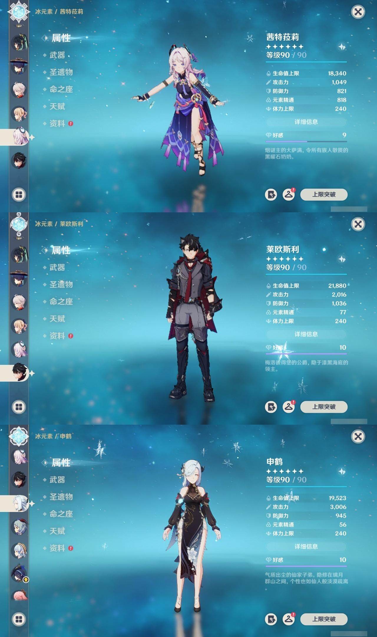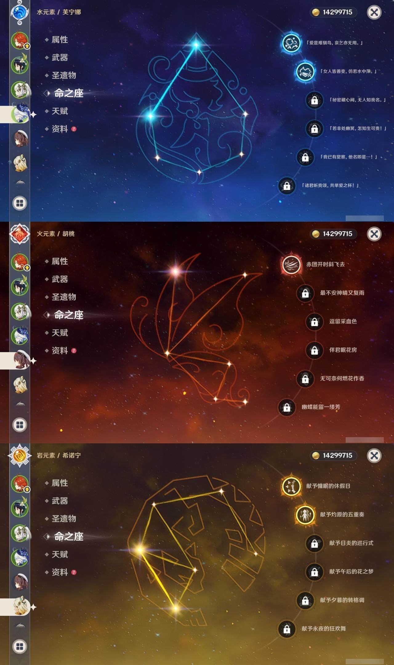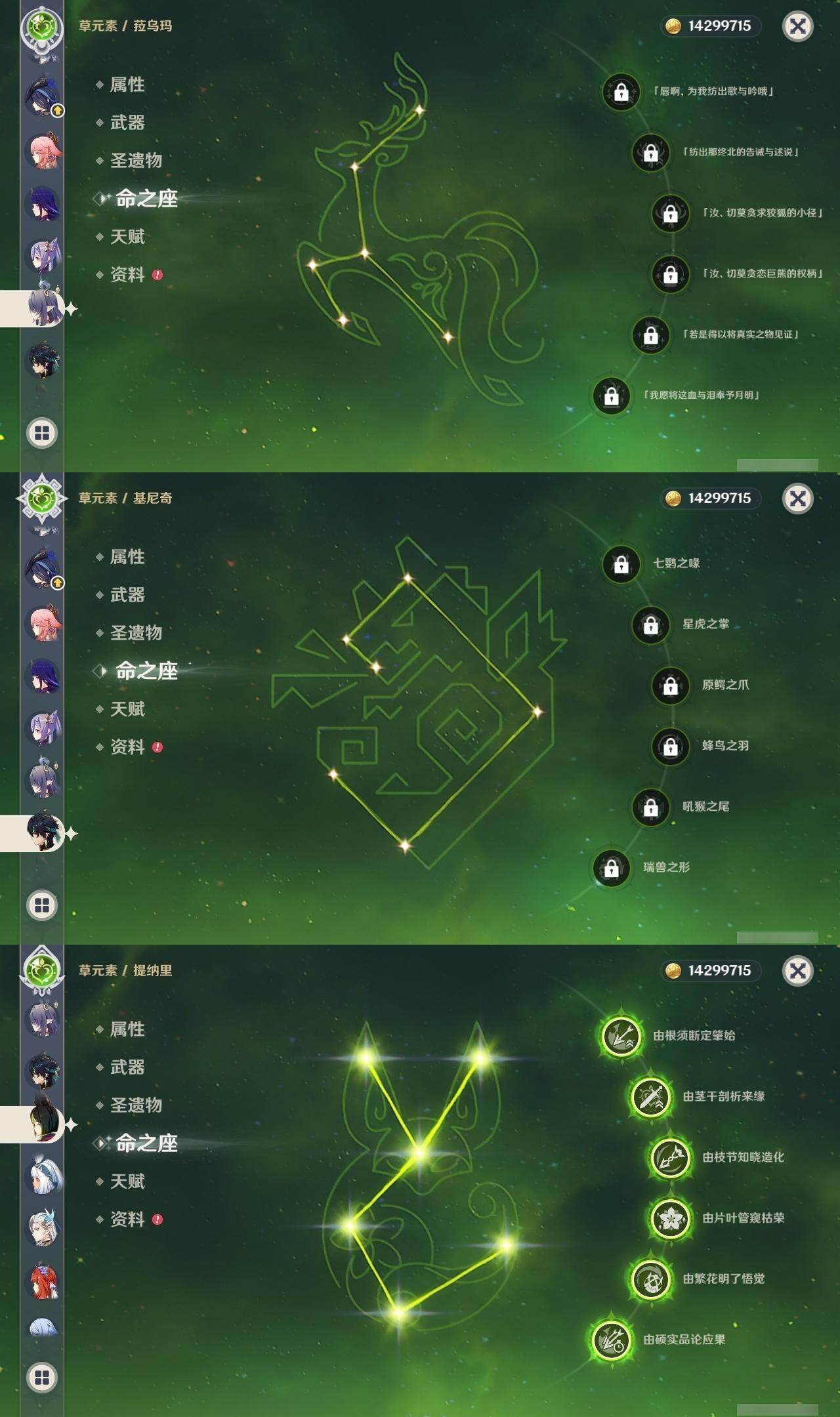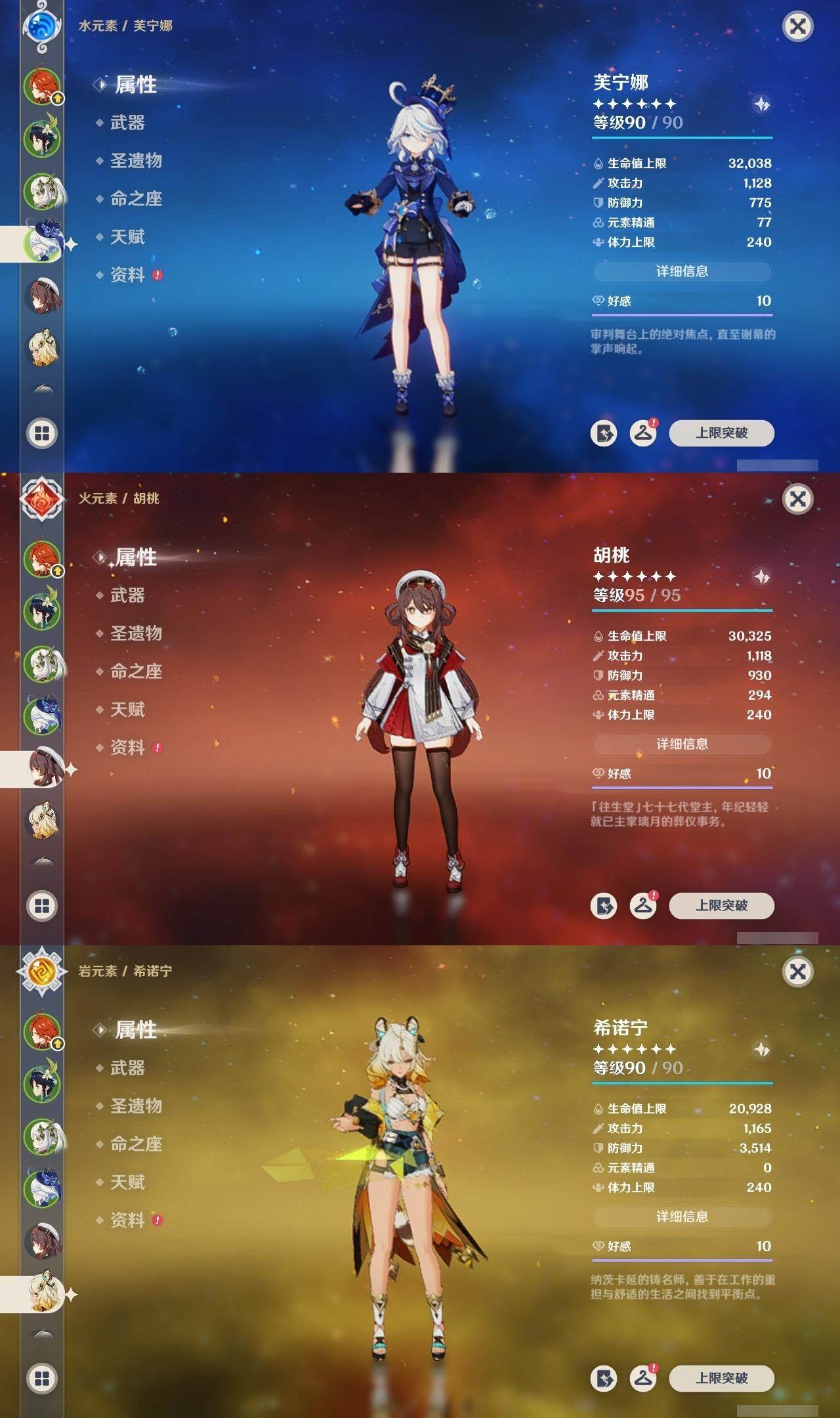 0命克洛琳德,0命阿蕾奇诺,0命闲云,2命芙宁娜,0命莱欧斯利,2命那维莱特,1命迪希雅,1命流浪者,0命纳西妲,0命妮露,满命提纳里,1命夜兰,0命神里绫人,0命八重神子,1命申鹤,0命雷电将军,0命枫原万叶,0命神里绫华,0命钟离,1命胡桃,0命甘雨,0命宵宫,0命温迪,0命阿贝多,0命珊瑚宫心海,2命刻晴,0命七七,满命琴,3命莫娜,3命迪卢克,0命基尼奇,2命希诺宁,1命玛拉妮,0命玛薇卡,0命茜特菈莉,0命菈乌玛,精1静水流涌之辉,精1金流监督,精1万世流涌大典,精1裁叶萃光,精1千夜浮梦,精1若水,精1薙草之稻光,精1飞雷之弦振,精1雾切之回光,精3护摩之杖,精3和璞鸢,精1天空之脊,精2天空之翼,精1阿莫斯之弓,精1天空之刃,精1天空之傲,精1岩峰巡歌,精1山王长牙,精1冲浪时光,精1纺夜天镜