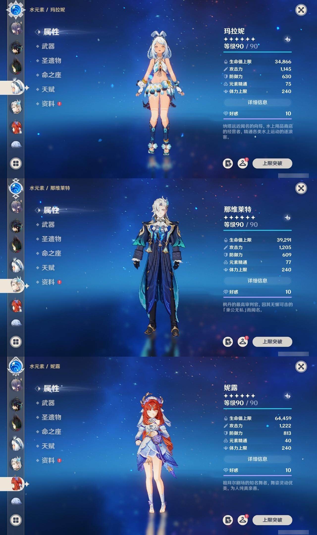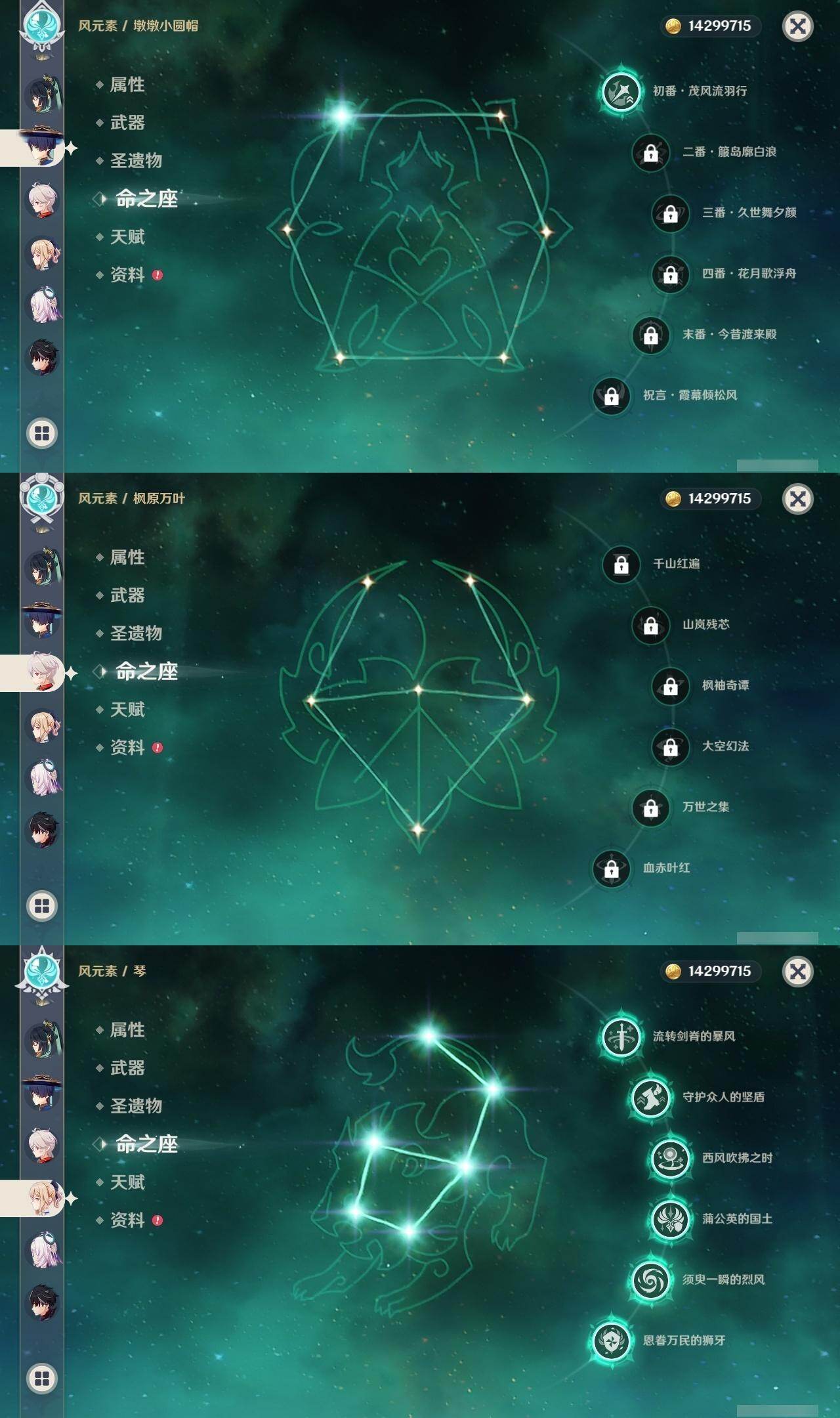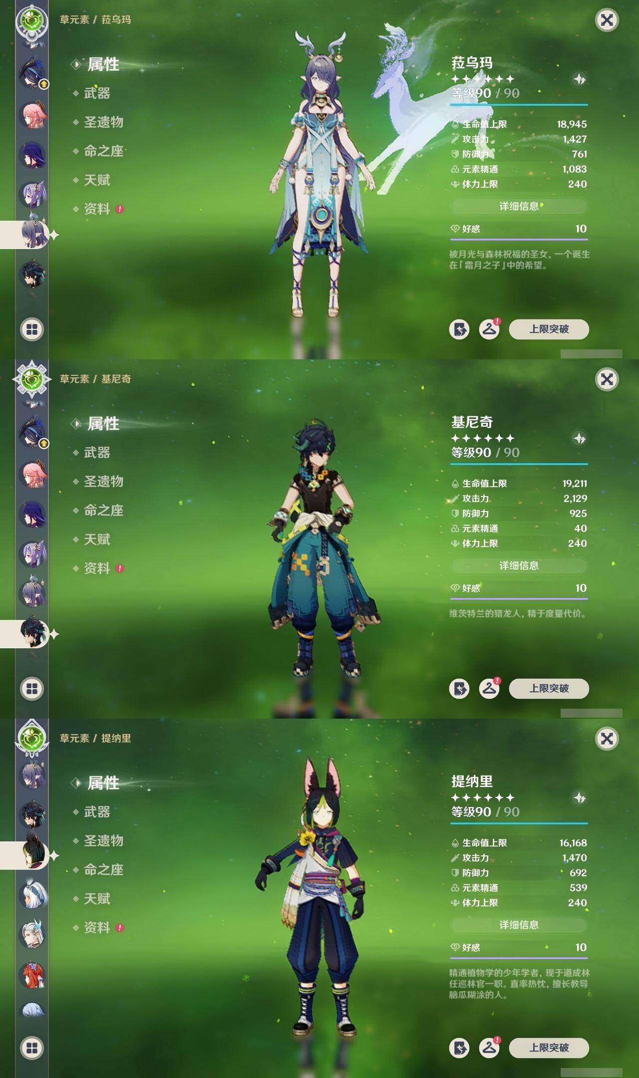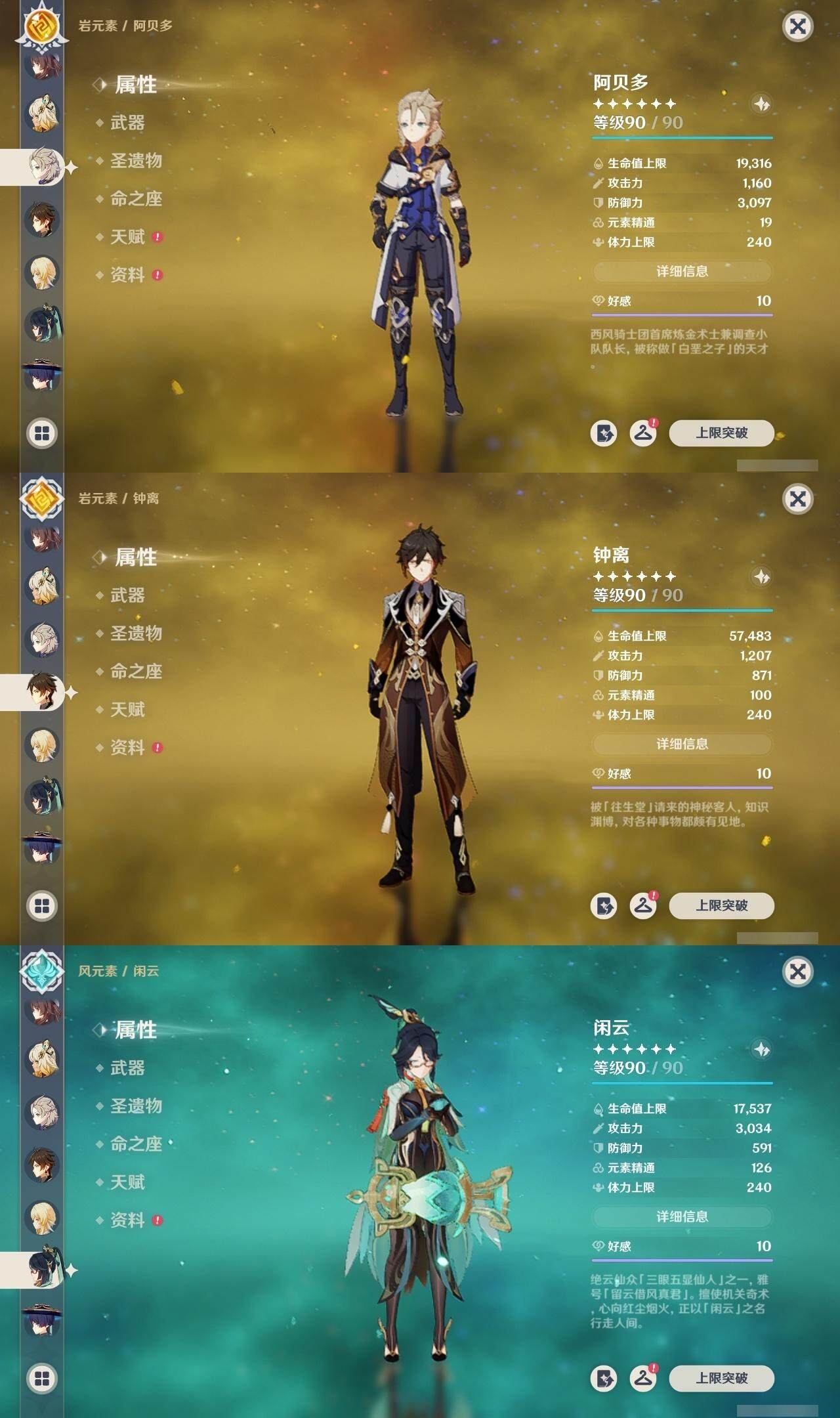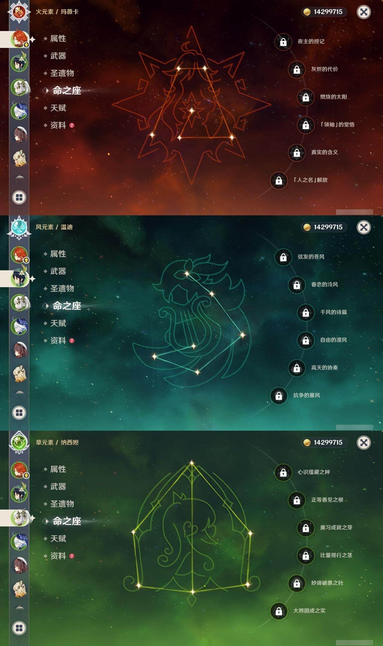 0命克洛琳德,0命阿蕾奇诺,0命闲云,2命芙宁娜,0命莱欧斯利,2命那维莱特,1命迪希雅,1命流浪者,0命纳西妲,0命妮露,满命提纳里,1命夜兰,0命神里绫人,0命八重神子,1命申鹤,0命雷电将军,0命枫原万叶,0命神里绫华,0命钟离,1命胡桃,0命甘雨,0命宵宫,0命温迪,0命阿贝多,0命珊瑚宫心海,2命刻晴,0命七七,满命琴,3命莫娜,3命迪卢克,0命基尼奇,2命希诺宁,1命玛拉妮,0命玛薇卡,0命茜特菈莉,0命菈乌玛,精1静水流涌之辉,精1金流监督,精1万世流涌大典,精1裁叶萃光,精1千夜浮梦,精1若水,精1薙草之稻光,精1飞雷之弦振,精1雾切之回光,精3护摩之杖,精3和璞鸢,精1天空之脊,精2天空之翼,精1阿莫斯之弓,精1天空之刃,精1天空之傲,精1岩峰巡歌,精1山王长牙,精1冲浪时光,精1纺夜天镜