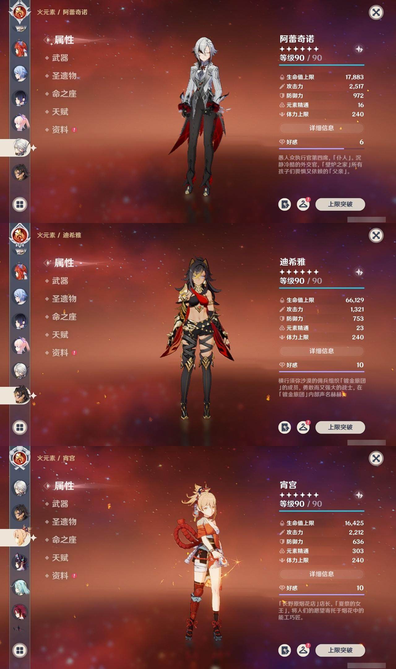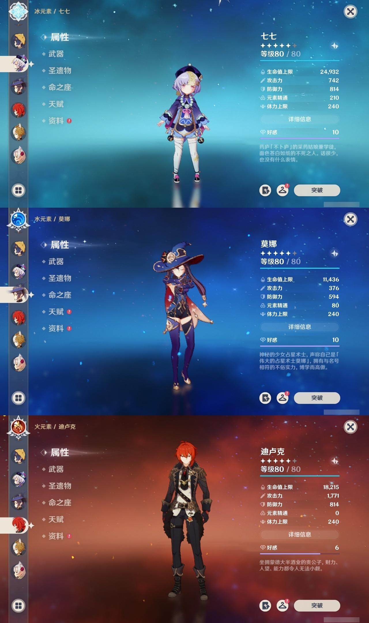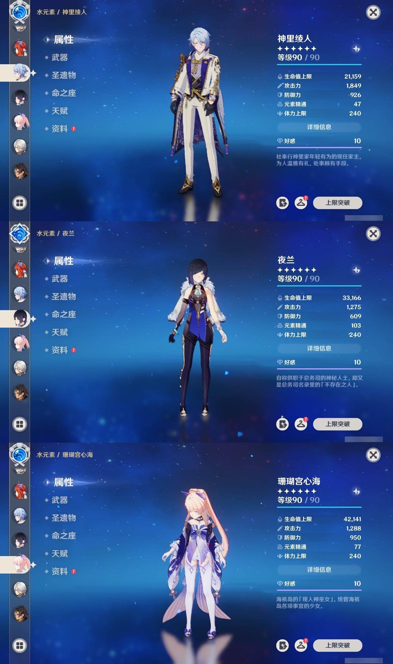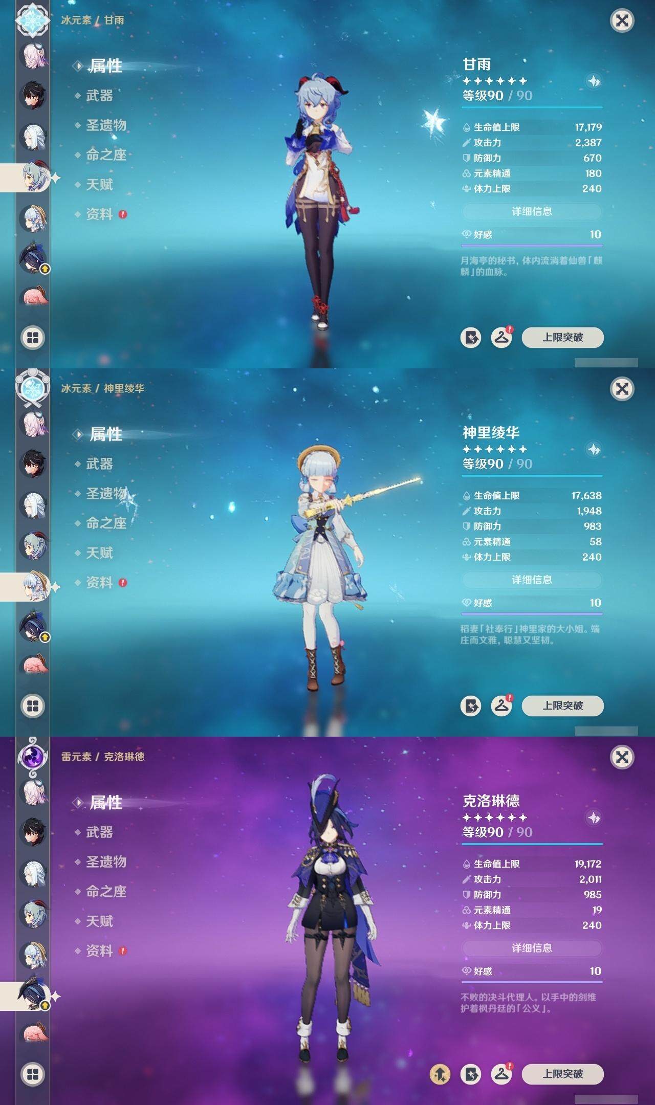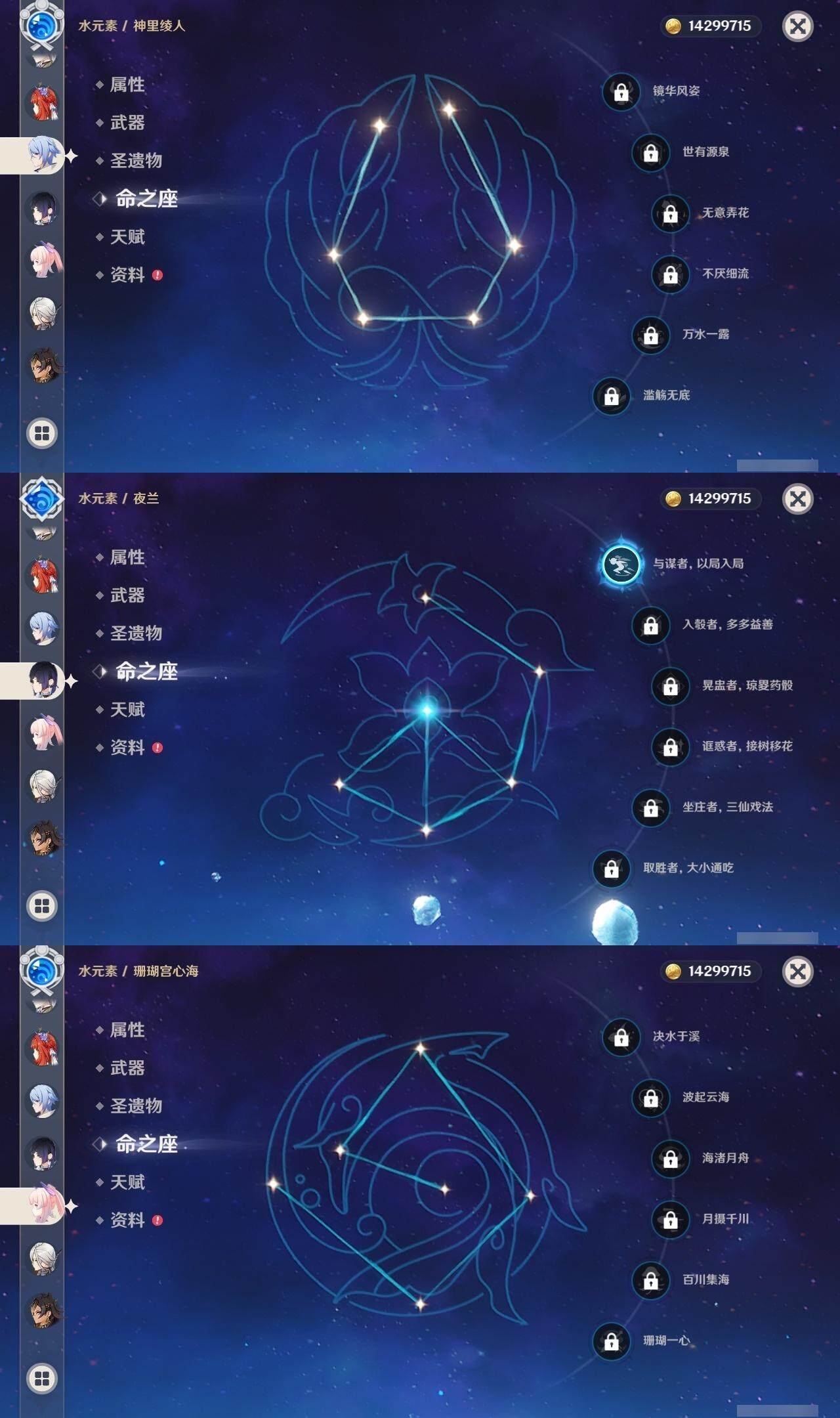 0命克洛琳德,0命阿蕾奇诺,0命闲云,2命芙宁娜,0命莱欧斯利,2命那维莱特,1命迪希雅,1命流浪者,0命纳西妲,0命妮露,满命提纳里,1命夜兰,0命神里绫人,0命八重神子,1命申鹤,0命雷电将军,0命枫原万叶,0命神里绫华,0命钟离,1命胡桃,0命甘雨,0命宵宫,0命温迪,0命阿贝多,0命珊瑚宫心海,2命刻晴,0命七七,满命琴,3命莫娜,3命迪卢克,0命基尼奇,2命希诺宁,1命玛拉妮,0命玛薇卡,0命茜特菈莉,0命菈乌玛,精1静水流涌之辉,精1金流监督,精1万世流涌大典,精1裁叶萃光,精1千夜浮梦,精1若水,精1薙草之稻光,精1飞雷之弦振,精1雾切之回光,精3护摩之杖,精3和璞鸢,精1天空之脊,精2天空之翼,精1阿莫斯之弓,精1天空之刃,精1天空之傲,精1岩峰巡歌,精1山王长牙,精1冲浪时光,精1纺夜天镜