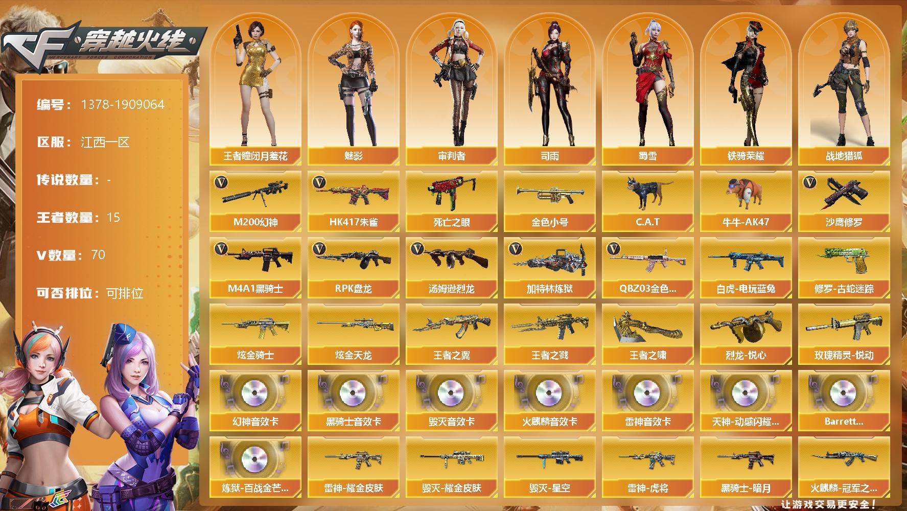 [15304541]江西一区-70V-15王者-2炫金 【热门武器】:QBZ03-金色蔷薇,HK417-朱雀,M200-幻神,修罗-古蛇迷踪,死亡之眼*2,白虎-电玩蓝兔,金色小号,C.A.T,牛牛-AK47,M4A1-黑骑士,汤姆逊-烈龙*6,RPK-盘龙*6,加特林-炼狱*2,沙鹰-修罗*4 【王者炫金武器】:王者之戮,王者之翼,玫瑰精灵-悦动,烈龙-悦心,王者之啸,炫金骑士,炫金天龙 【音效卡】:天神-动感