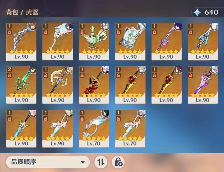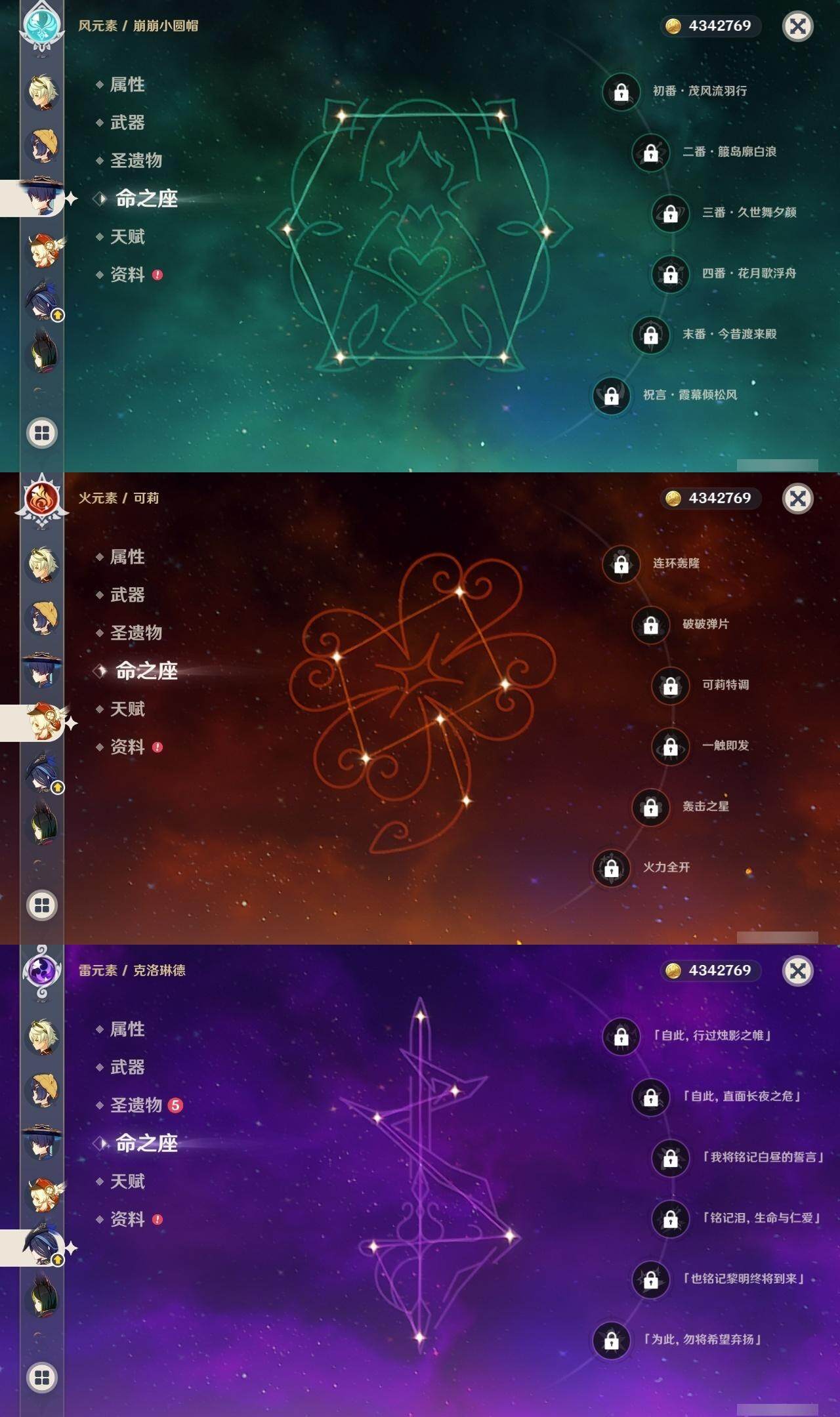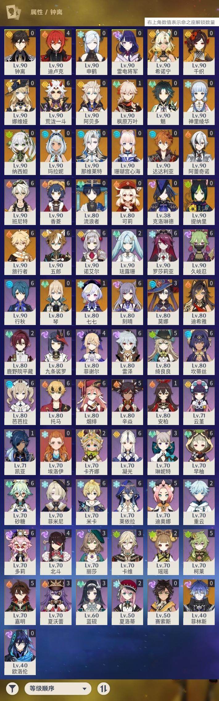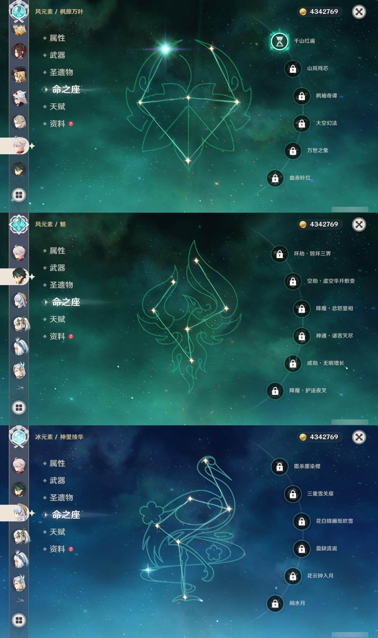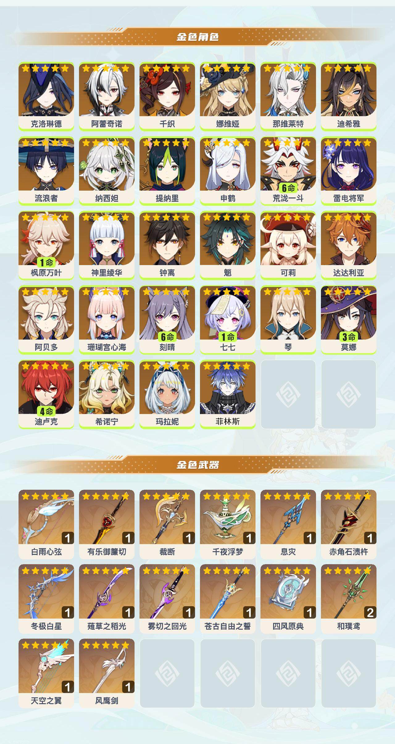 0命克洛琳德,0命阿蕾奇诺,0命千织,0命娜维娅,0命那维莱特,0命迪希雅,0命流浪者,0命纳西妲,0命提纳里,0命申鹤,满命荒泷一斗,0命雷电将军,1命枫原万叶,0命神里绫华,0命钟离,0命魈,0命可莉,0命达达利亚,0命阿贝多,0命珊瑚宫心海,满命刻晴,1命七七,0命琴,3命莫娜,4命迪卢克,0命希诺宁,0命玛拉妮,0命菲林斯,精1白雨心弦,精1有乐御簾切,精1裁断,精1千夜浮梦,精1息灾,精1赤角石溃杵,精1冬极白星,精1薙草之稻光,精1雾切之回光,精1苍古自由之誓,精1四风原典,精2和璞鸢,精1天空之翼,精1风鹰剑