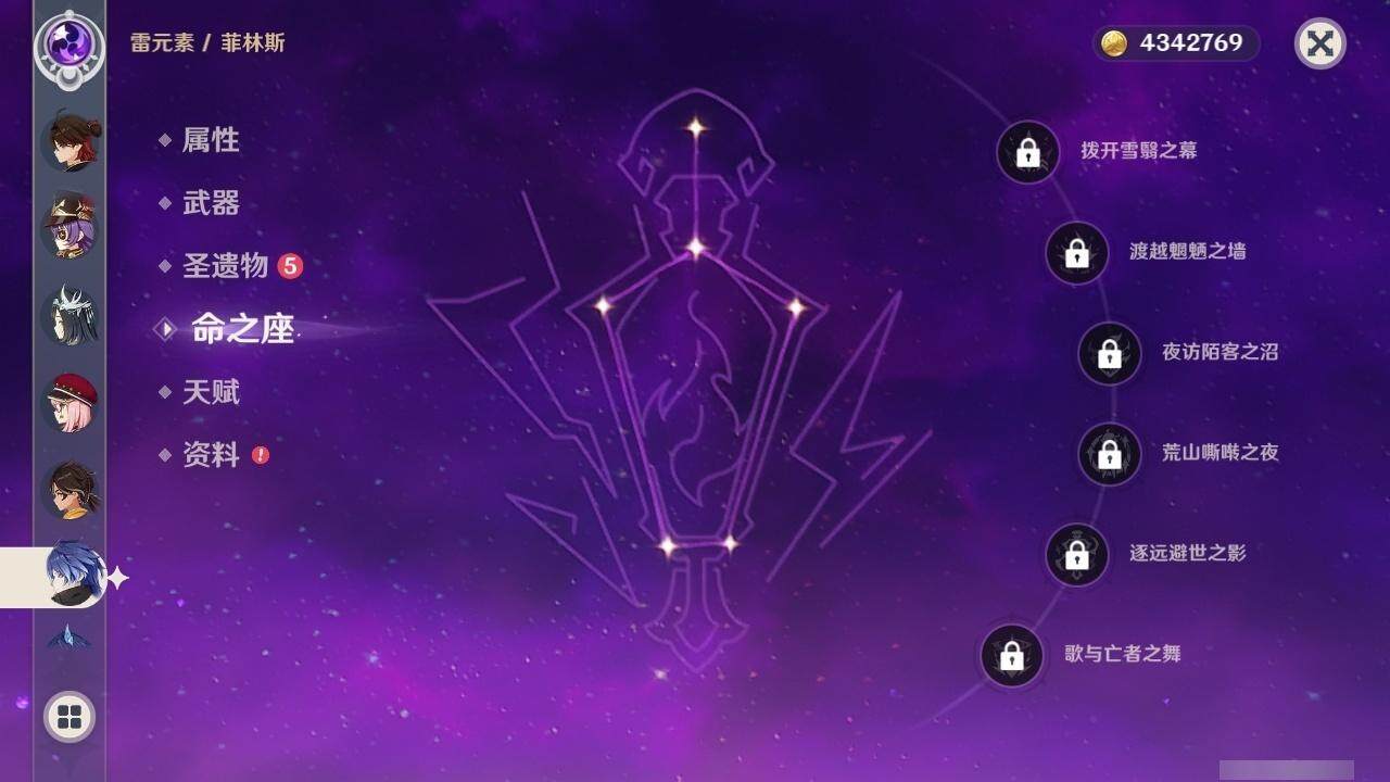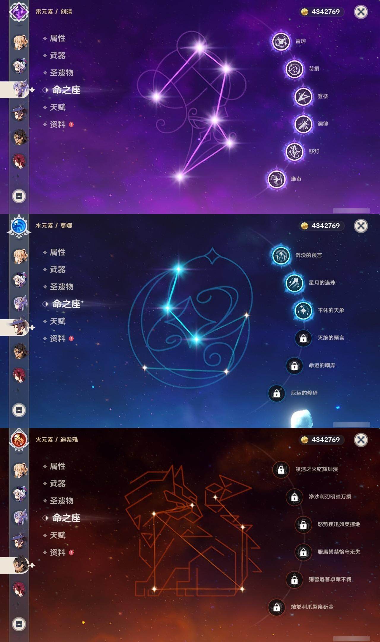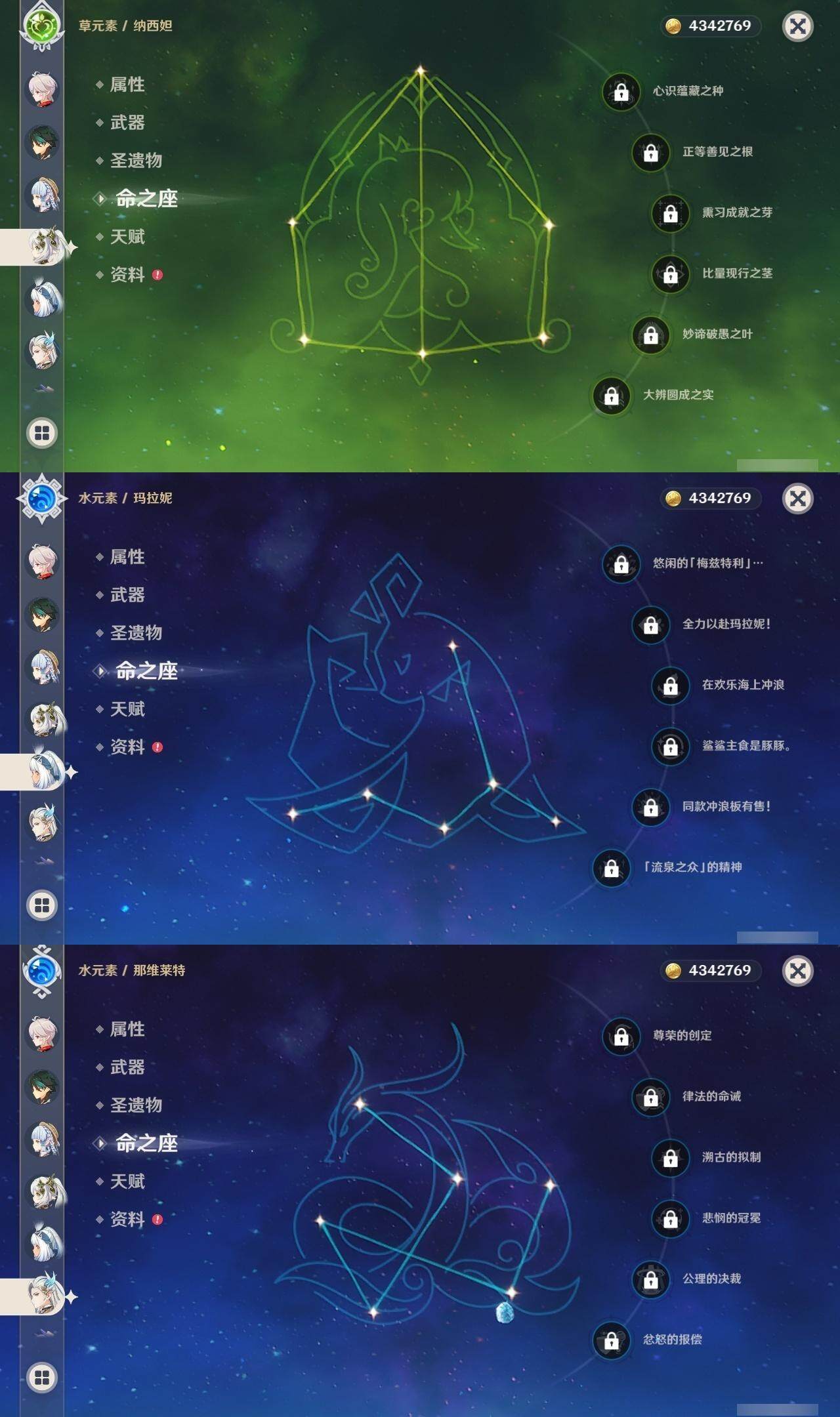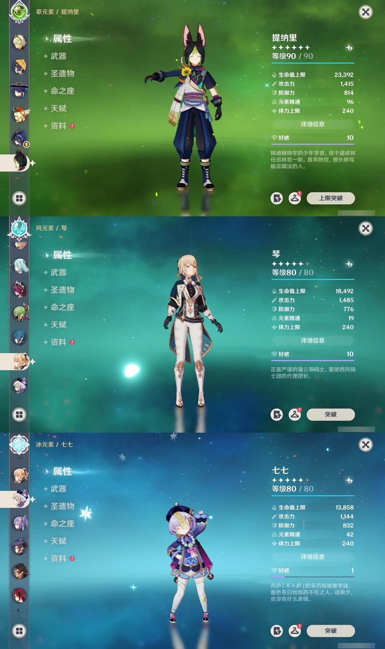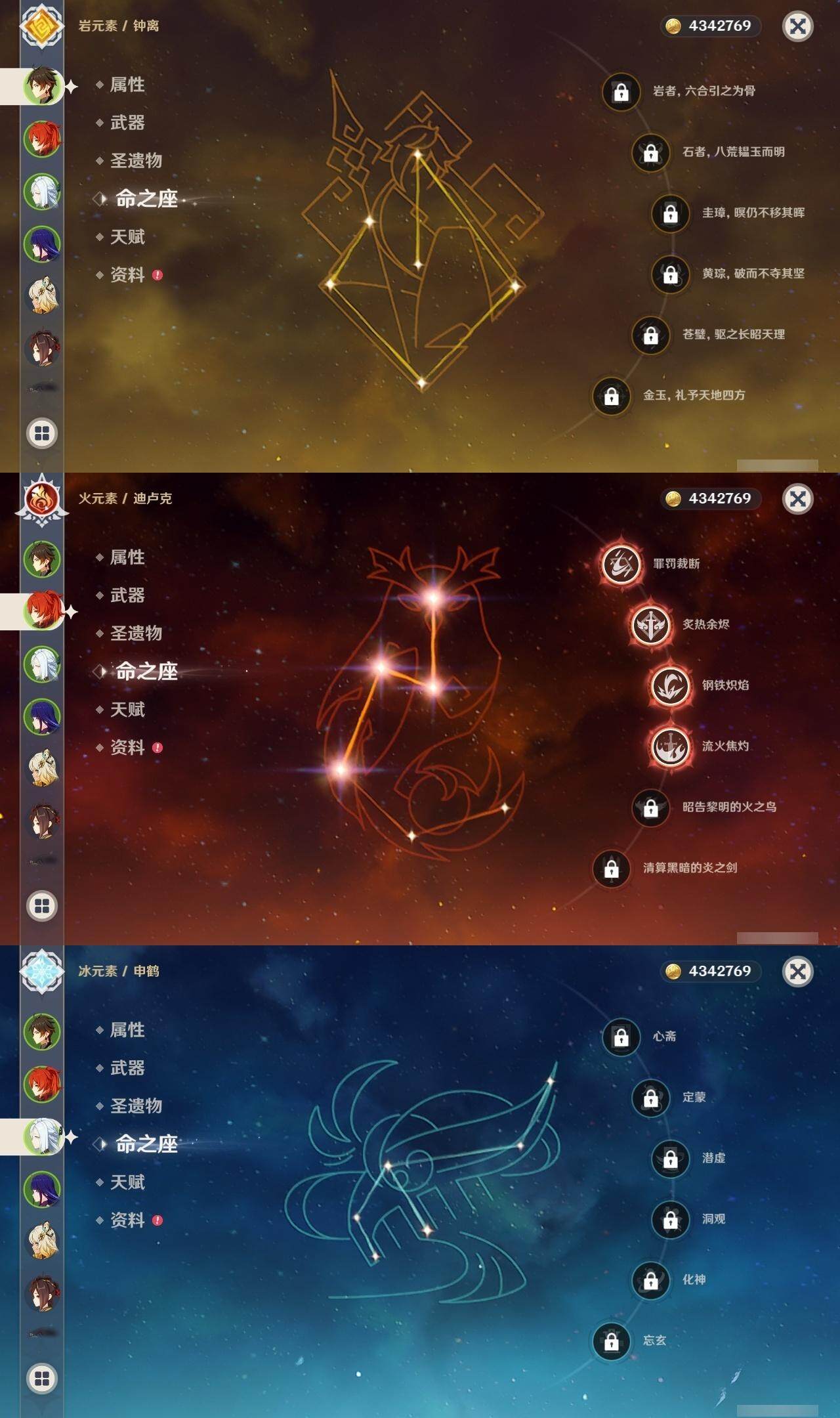 0命克洛琳德,0命阿蕾奇诺,0命千织,0命娜维娅,0命那维莱特,0命迪希雅,0命流浪者,0命纳西妲,0命提纳里,0命申鹤,满命荒泷一斗,0命雷电将军,1命枫原万叶,0命神里绫华,0命钟离,0命魈,0命可莉,0命达达利亚,0命阿贝多,0命珊瑚宫心海,满命刻晴,1命七七,0命琴,3命莫娜,4命迪卢克,0命希诺宁,0命玛拉妮,0命菲林斯,精1白雨心弦,精1有乐御簾切,精1裁断,精1千夜浮梦,精1息灾,精1赤角石溃杵,精1冬极白星,精1薙草之稻光,精1雾切之回光,精1苍古自由之誓,精1四风原典,精2和璞鸢,精1天空之翼,精1风鹰剑