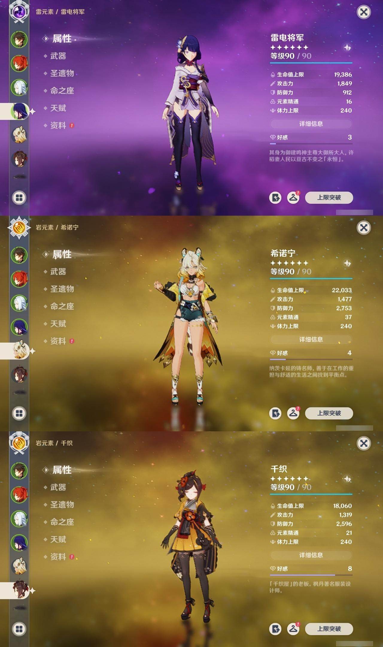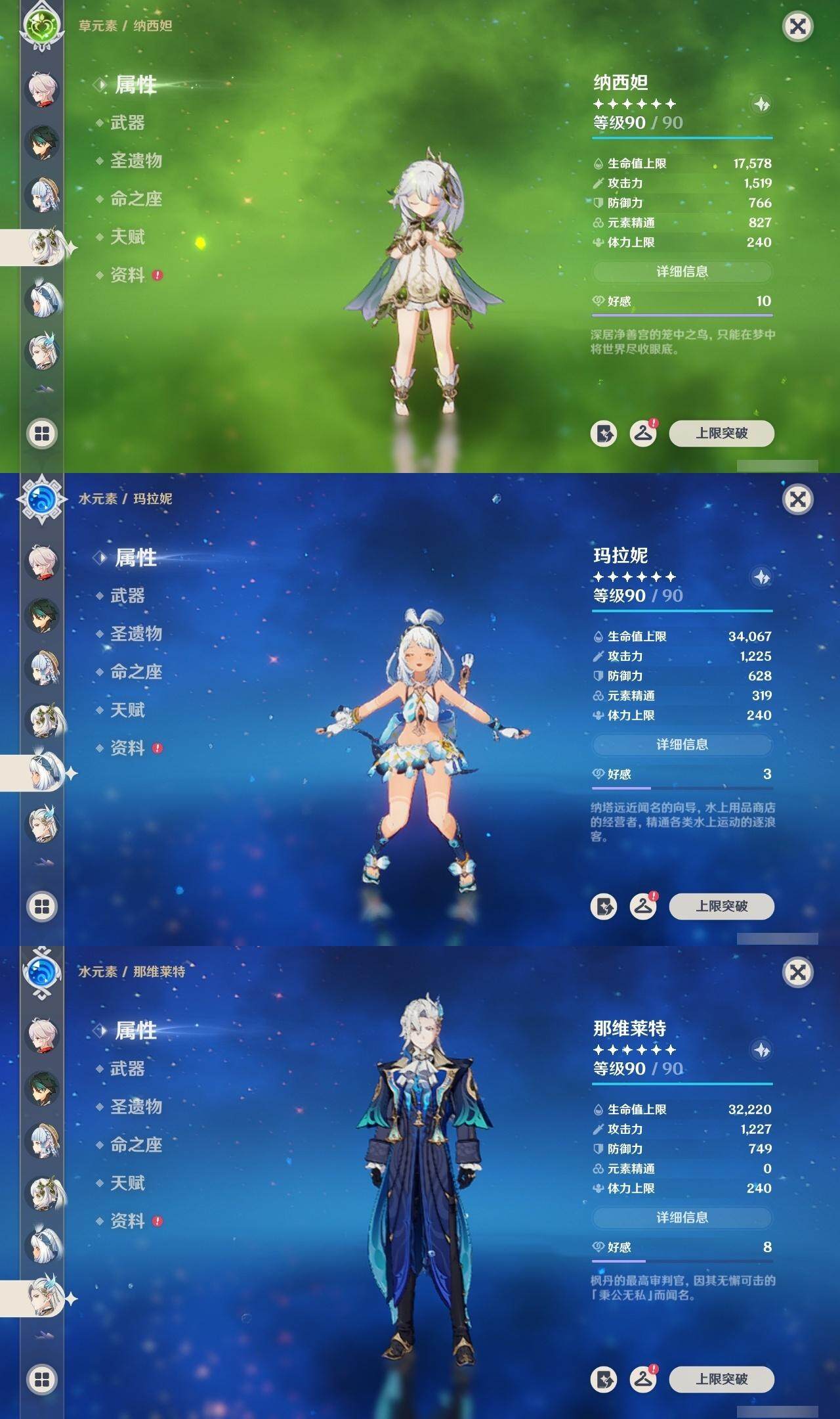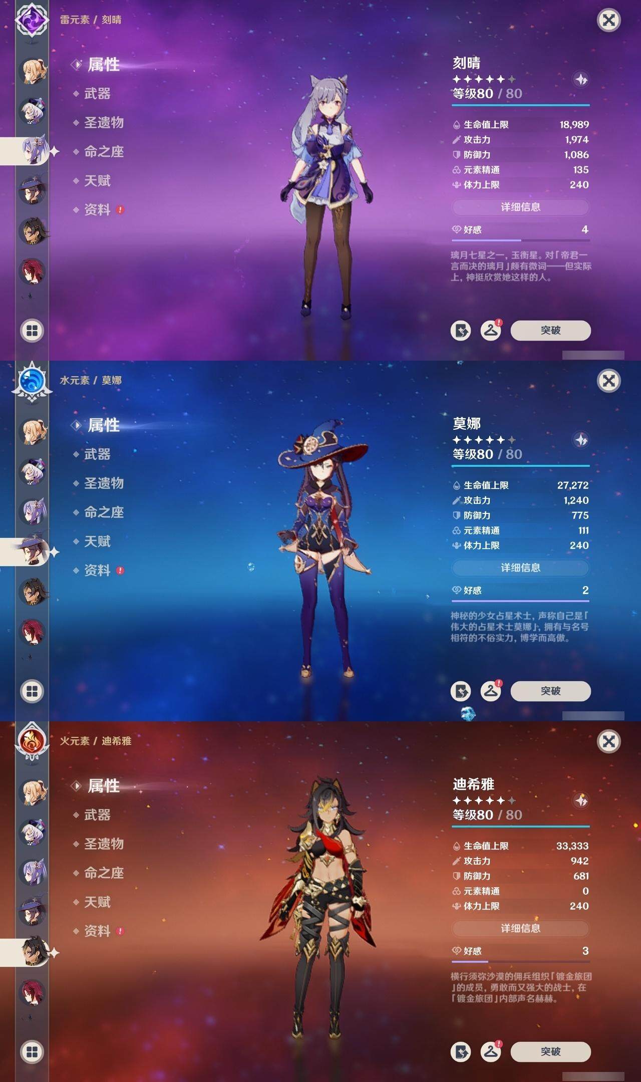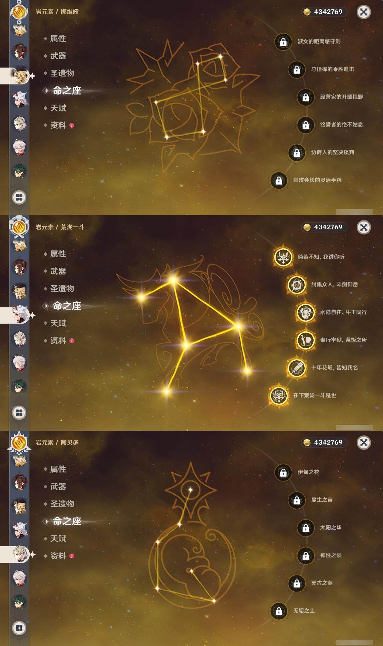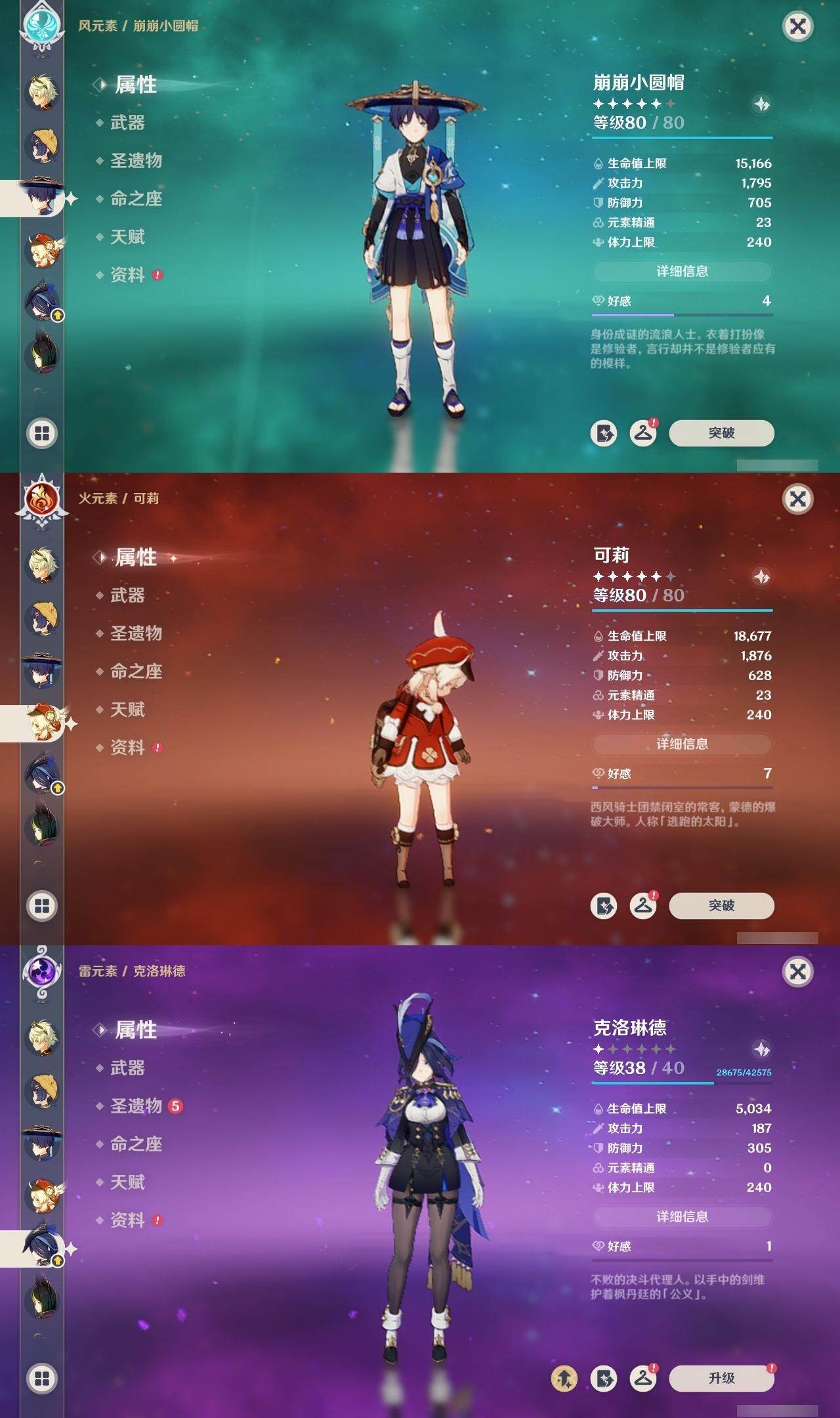 0命克洛琳德,0命阿蕾奇诺,0命千织,0命娜维娅,0命那维莱特,0命迪希雅,0命流浪者,0命纳西妲,0命提纳里,0命申鹤,满命荒泷一斗,0命雷电将军,1命枫原万叶,0命神里绫华,0命钟离,0命魈,0命可莉,0命达达利亚,0命阿贝多,0命珊瑚宫心海,满命刻晴,1命七七,0命琴,3命莫娜,4命迪卢克,0命希诺宁,0命玛拉妮,0命菲林斯,精1白雨心弦,精1有乐御簾切,精1裁断,精1千夜浮梦,精1息灾,精1赤角石溃杵,精1冬极白星,精1薙草之稻光,精1雾切之回光,精1苍古自由之誓,精1四风原典,精2和璞鸢,精1天空之翼,精1风鹰剑