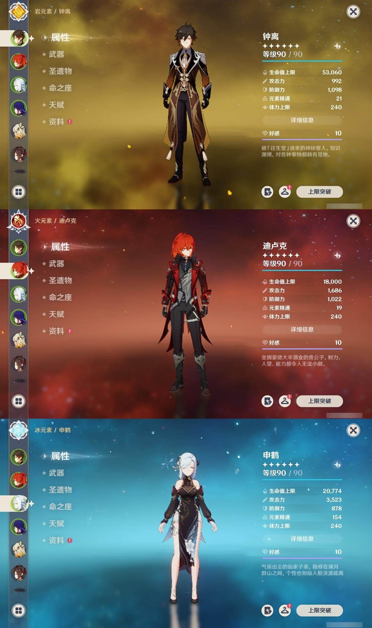 钟离,迪卢克,申鹤,雷电将军,荒泷一斗,阿贝多,枫原万叶,魈,神里凌华,珊瑚宫心海,达达利亚,可莉,琴,七七,刻晴,莫娜