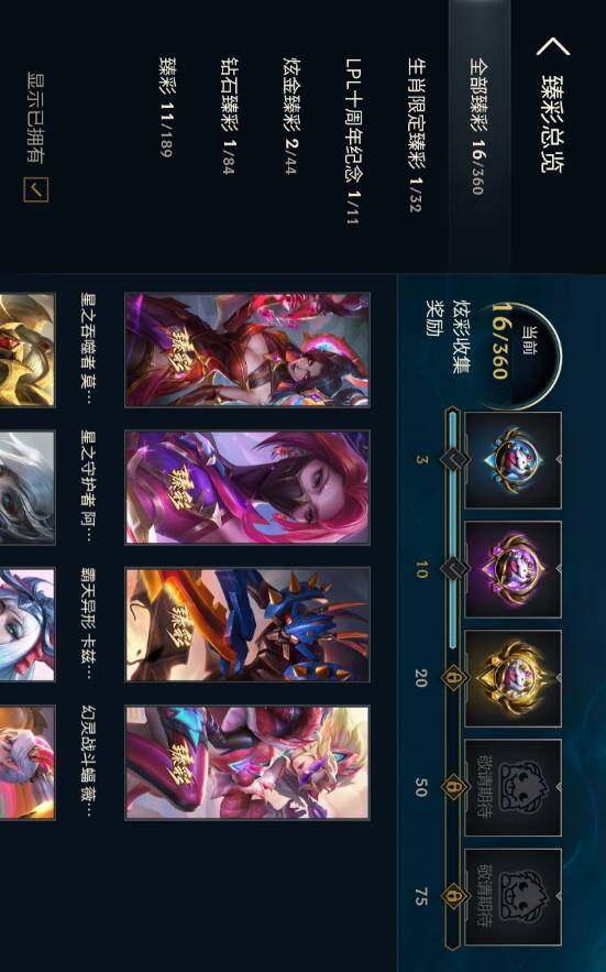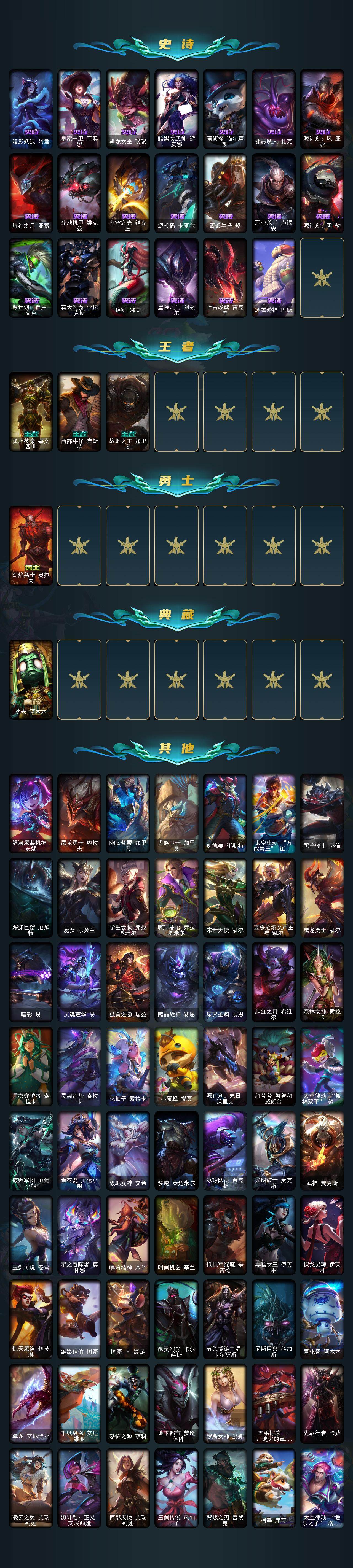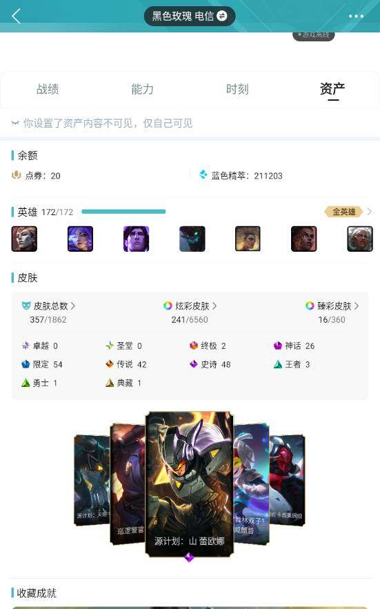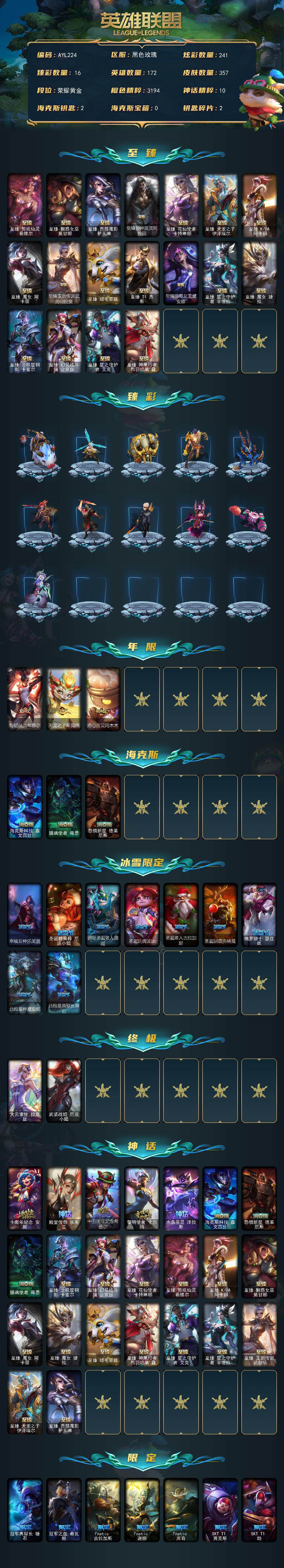 黄金段位-172英雄-357皮肤-241炫彩-2终极-26神话-54限定-42传说-48史诗