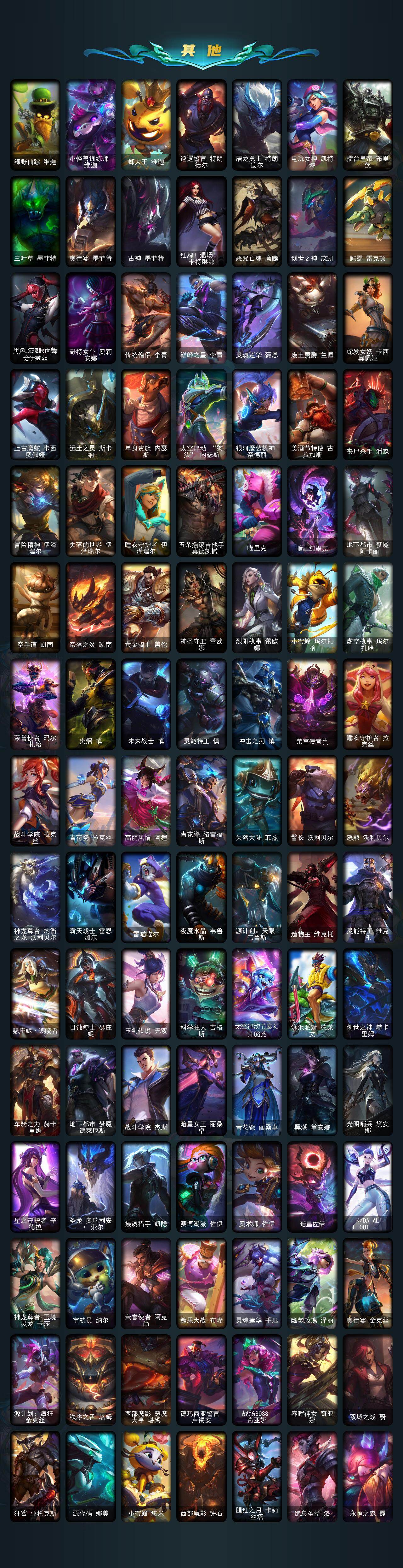 【神话皮肤】:十周年纪念安妮,殿堂传奇乐芙兰,十五周年纪念希维尔,黎明使者卡尔玛,水晶巫灵泽拉斯,海克斯科技嘉文四世,恐惧新星德莱厄斯,摄魂使者薇恩,至臻天龙之子伊泽瑞尔,至臻西部魔影伊芙琳,至臻北极星钢影卡蜜尔,至臻幻灵战斗猫金克丝,至臻花仙使者卡特琳娜,至臻剪纸仙灵希维尔,至臻KDA阿卡丽,至臻魅惑女巫莫甘娜,至臻魔女阿卡丽,至臻魔女婕拉,至臻绒毛菲兹,至臻神凰行者烈羽焰凰霞,至臻星之守护者艾克,至臻星之守护者辛德拉,至臻玉剑传说武剑仙
