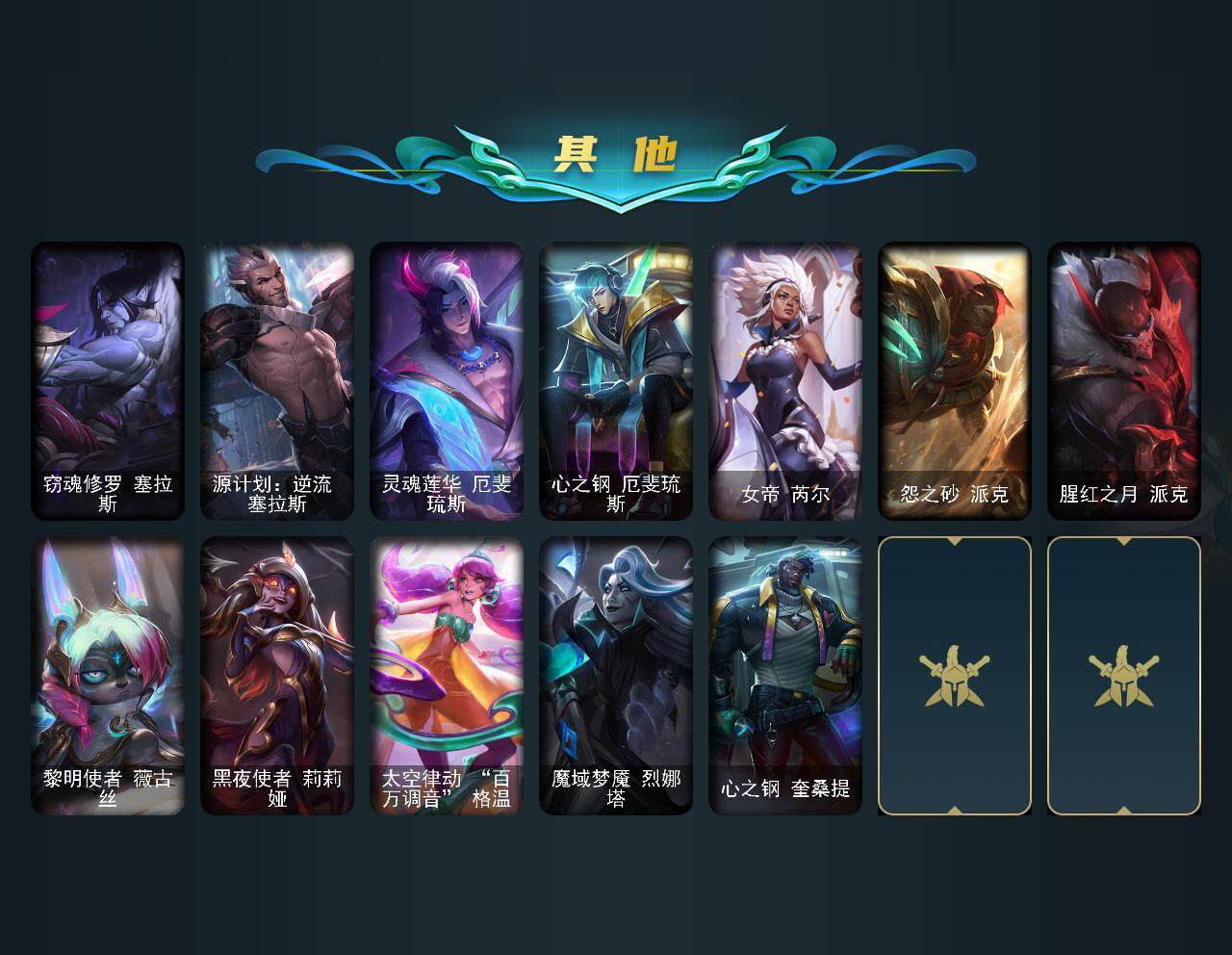【至臻皮肤】:至臻剪纸仙灵希维尔,至臻魅惑女巫莫甘娜,至臻西部魔影伊芙琳,至臻狼神英灵斯维因,至臻花仙使者卡特琳娜,至臻天龙之子伊泽瑞尔,至臻KDA阿卡丽,至臻魔女阿卡丽,至臻玉剑传说武剑仙锐雯,至臻绒毛菲兹,至臻T1杰斯,至臻暗星女王黛安娜,至臻星之守护者辛德拉,至臻魔女婕拉,至臻北极星钢影卡蜜尔,至臻幻灵战斗猫金克丝,至臻星之守护者艾克,至臻神凰行者烈羽焰凰霞